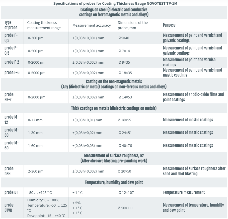 SPECIALIZED PROBES Measurement of groove depth and roughness. The DSH probe allows user to evaluate roughness, measure the depth of corrosion, surface defects and grooves. To determine the roughness, it is necessary to perform a series of measurements on the surface of a small area, and then using the formula to calculate the desired value. Measurement of temperature, humidity and dew point. Using the DTVR probe, it is possible to measure humidity and air temperature, on the basis of which the device calculates the dew point, which is very important to know before applying the paint to the base. Surface temperature measurement. Using the DT probe, the surface temperature is measured by the contact method. | ![]() |