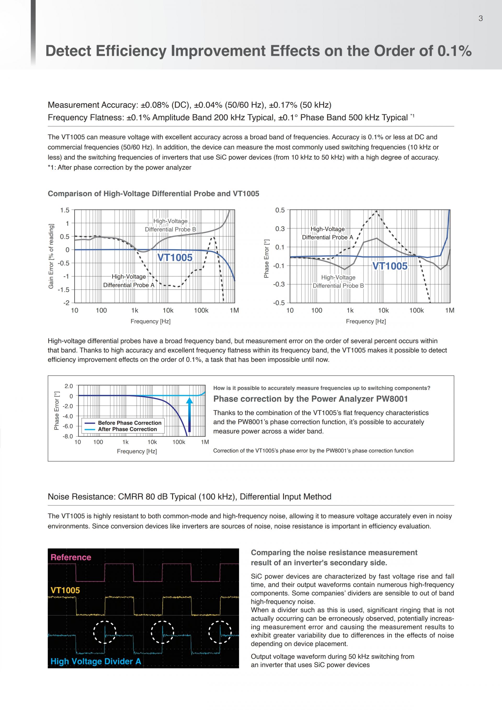VT1005는 광대역으로 정확하게 전압을 측정할 수 있습니다. 현재 주류인 스위칭 주파수 (10 kHz 이하) 뿐만 아니라, SiC 파워 반도체를 사용한 인버터의 스위칭 주파수(10 kHz에서 50 kHz)도 고정확도로 측정합니다.