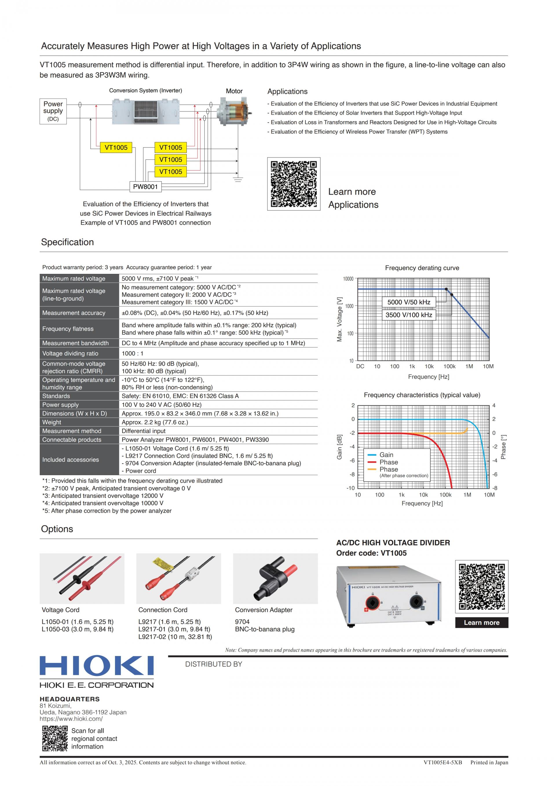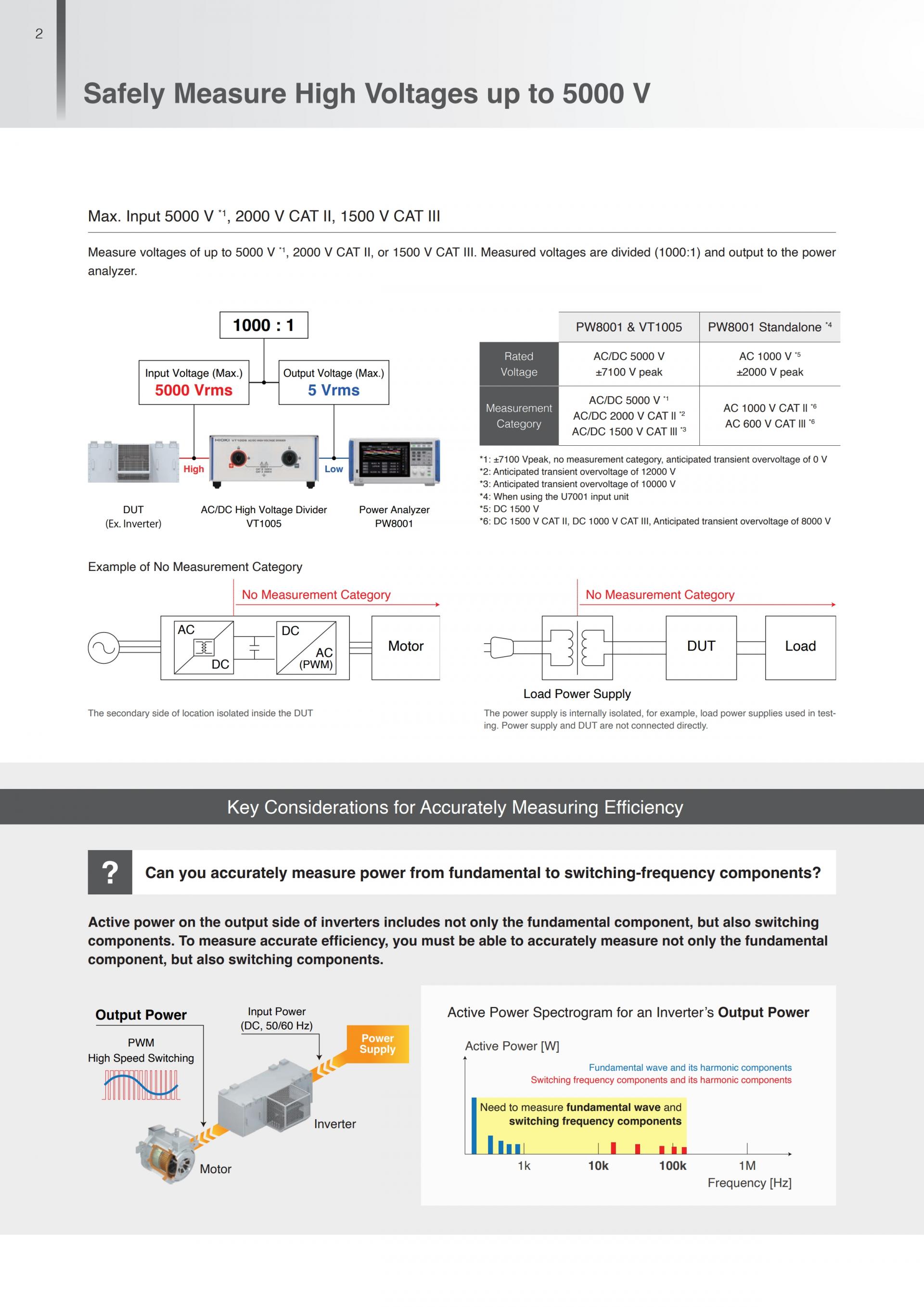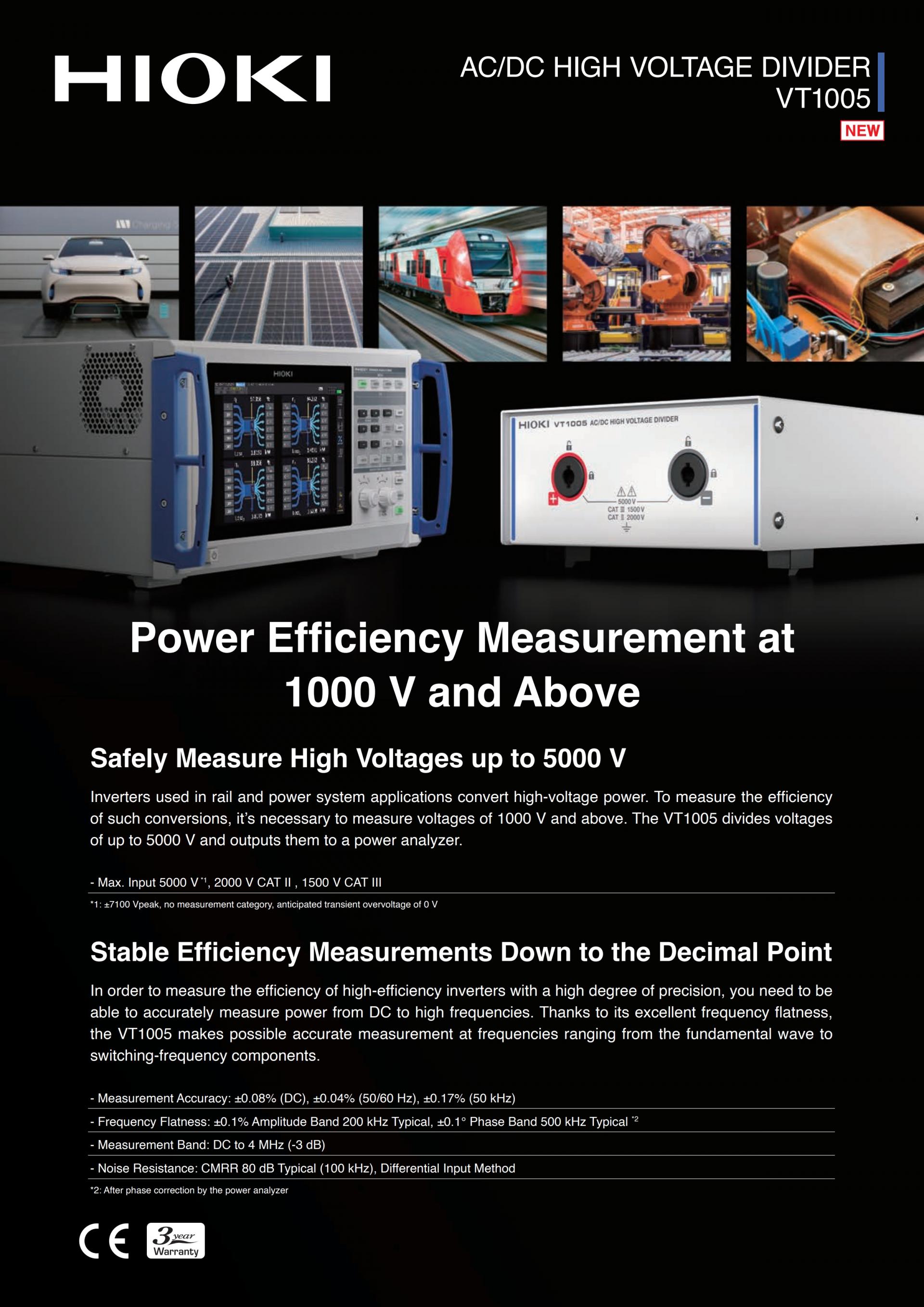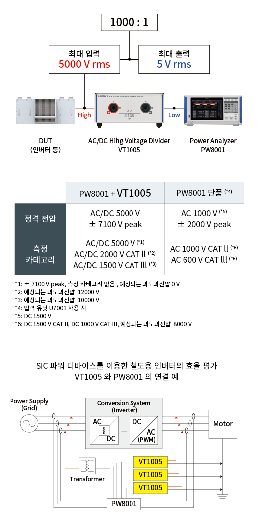 일반적으로 파워 아날라이저 단품만으로는 1000 V (AC) 이상의 전압을 다이렉트로 측정할 수 없습니다. VT1005를 사용하면 최대 5000 V의 대전력을 파워 아날라이저로 정확하게 측정할 수 있습니다.