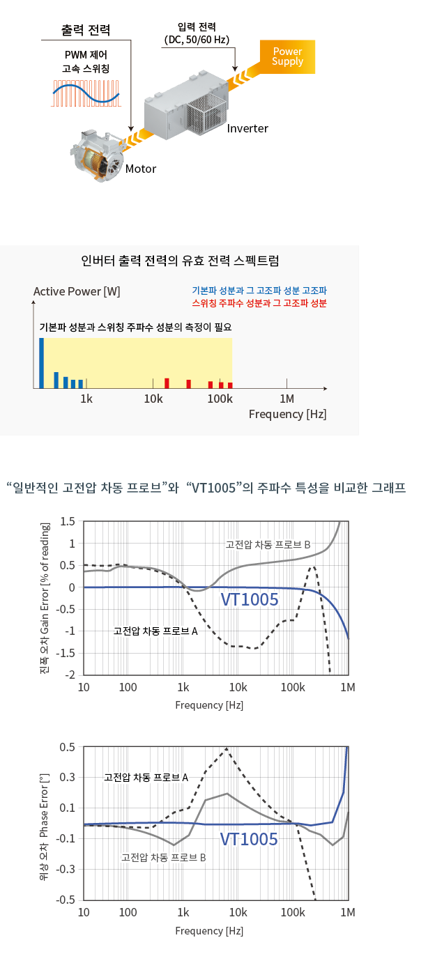 고전압 차동 프로브는 광대역이지만 대역 내에서 수%의 측정 오차가 생깁니다. VT1005는 고정확도이면서 대역 내에서 뛰어난 주파수 평탄성을 지녀, 기존에는 불가능했던 0.1% 단위의 효율 개선 효과를 파악할 수 있습니다.