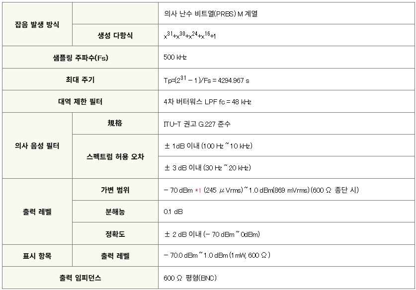 - 화이트 노이즈 발생기와 ITU-T 권고 G.227 특성 필터 탑재 (특성 필터 ON/OFF 가능)