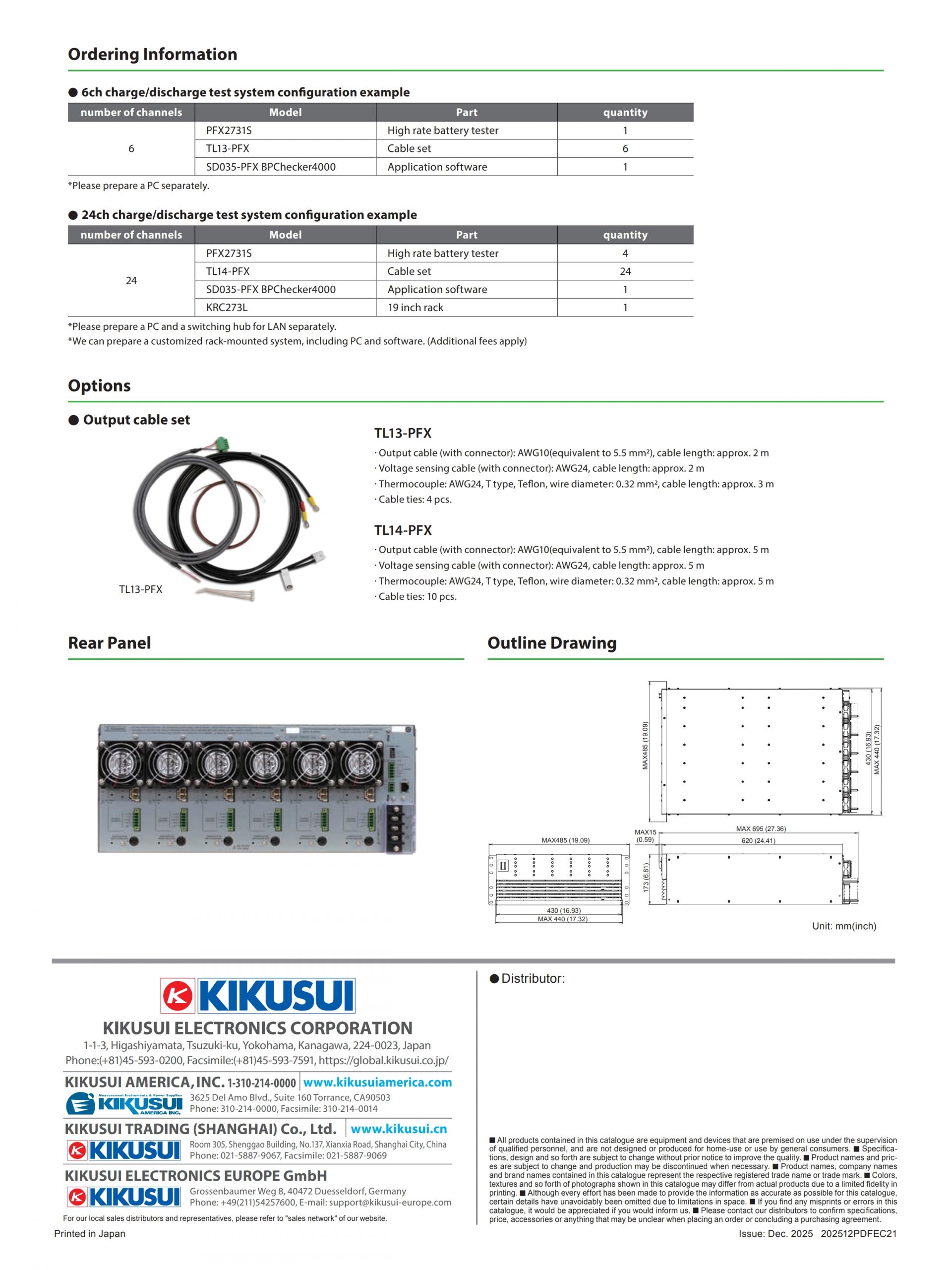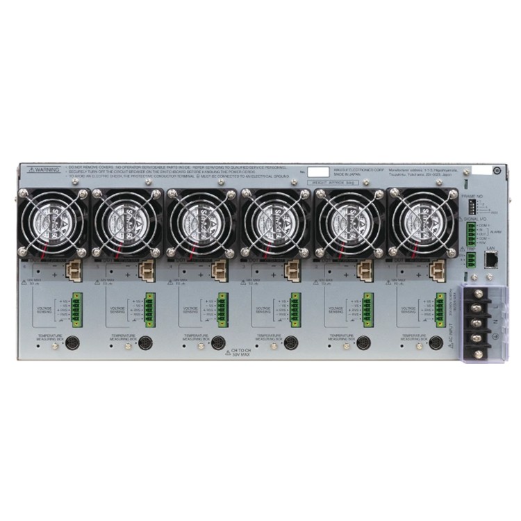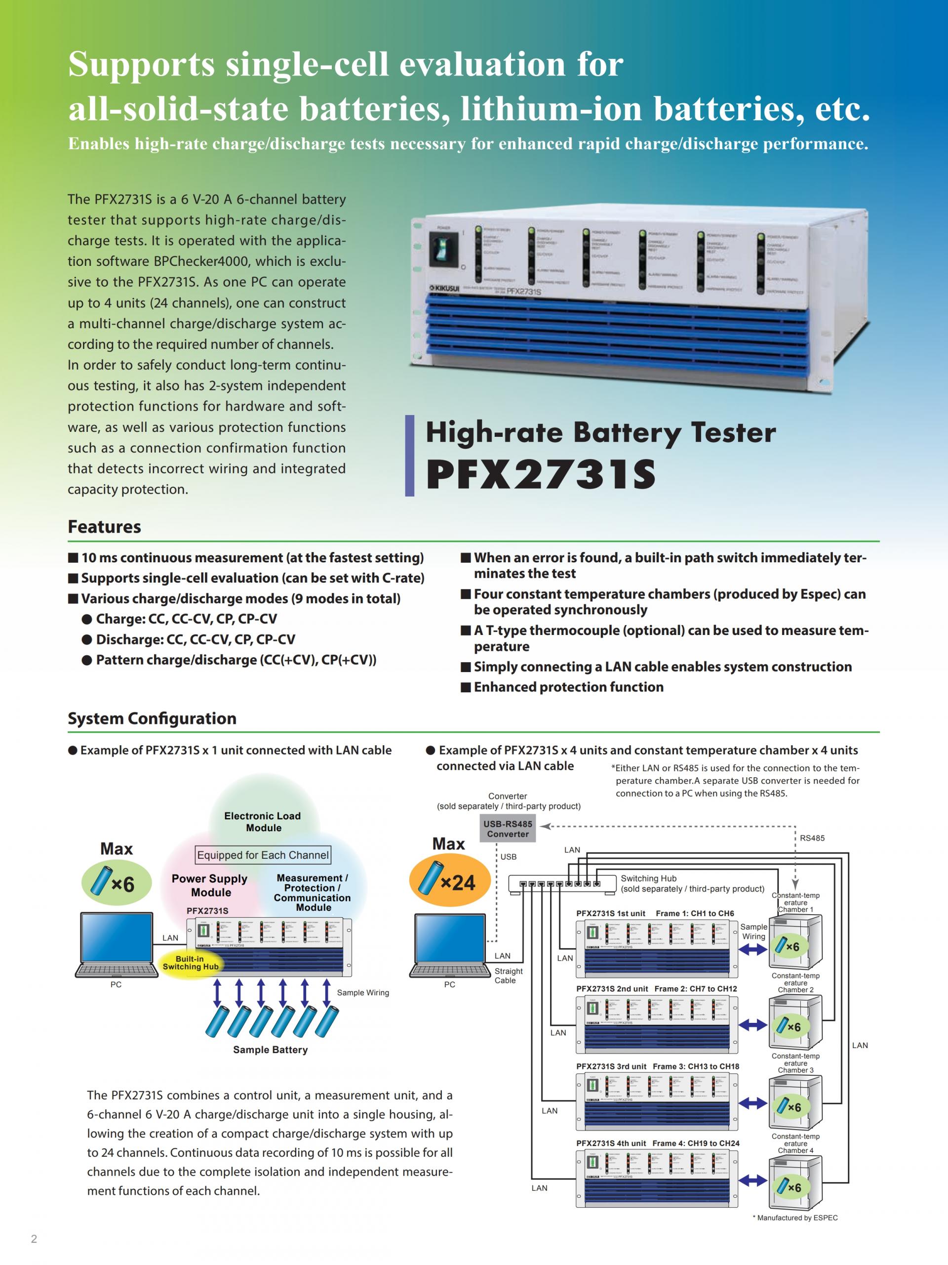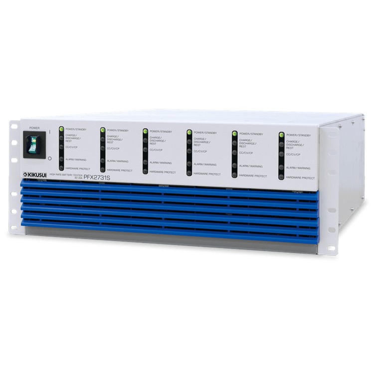 The PFX2731S is a 6 V-20 A 6-channel battery tester that supports high-rate charge/discharge tests. It is operated with the application software BPChecker4000, which is exclusive to the PFX2731S. As one PC can operate up to 4 units (24 channels), one can construct a multi-channel charge/discharge system according to the required number of channels.