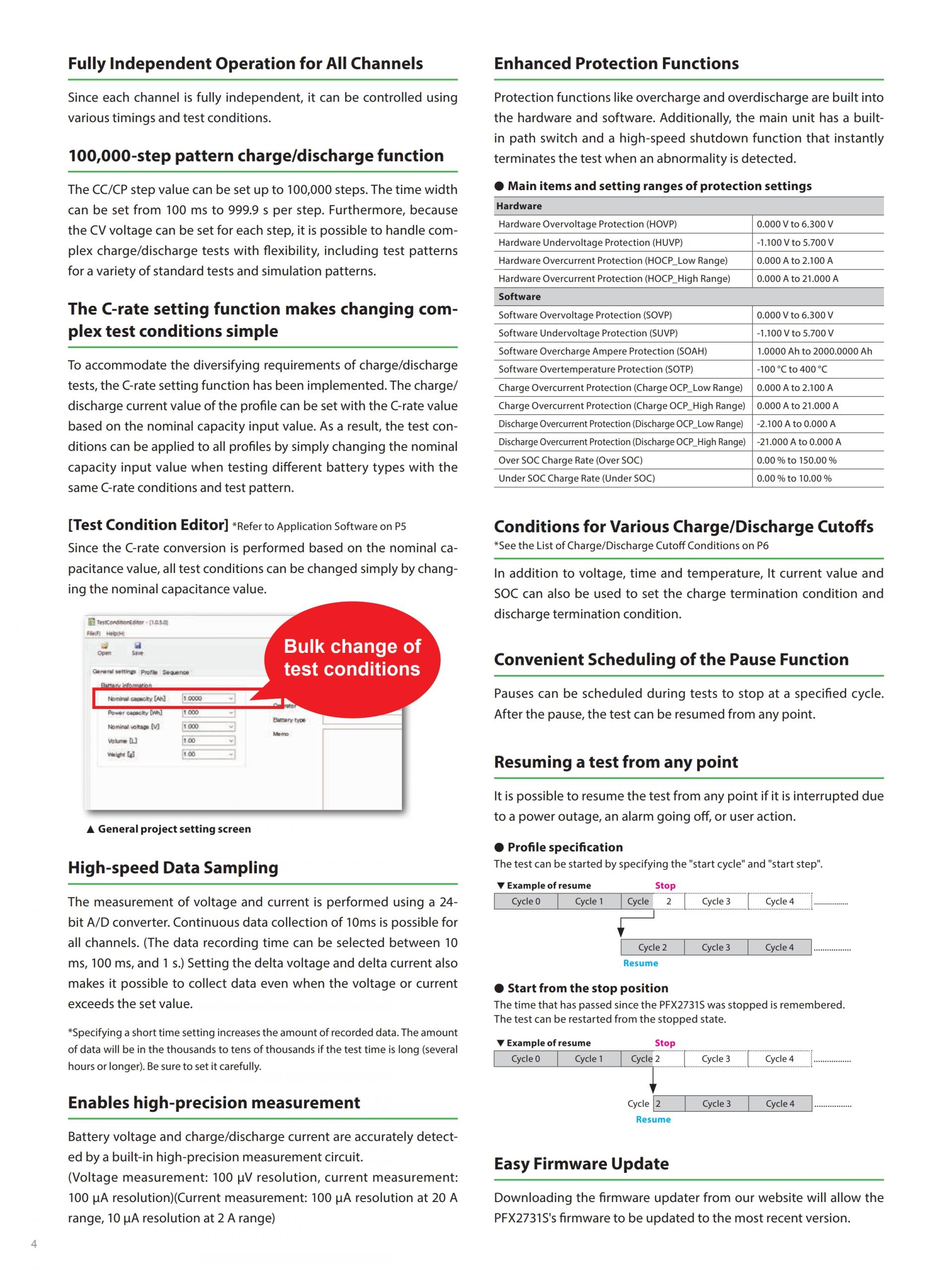 In order to safely conduct long-term continuous testing, it also has 2-system independent protection functions for hardware and software, as well as various protection functions such as a connection confirmation function that detects incorrect wiring and integrated capacity protection.