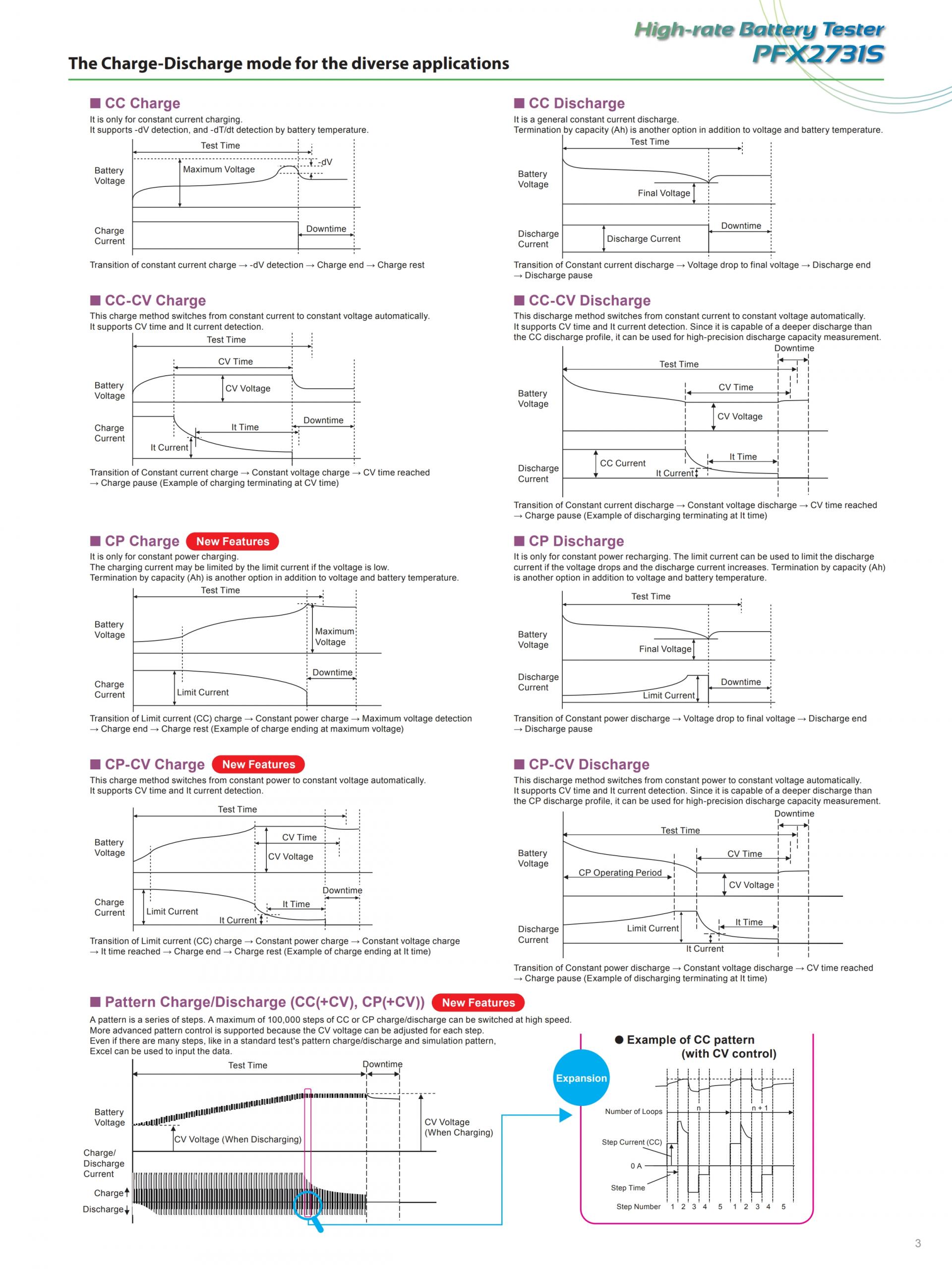 - Pattern charge/discharge (CC(+CV), CP(+CV))