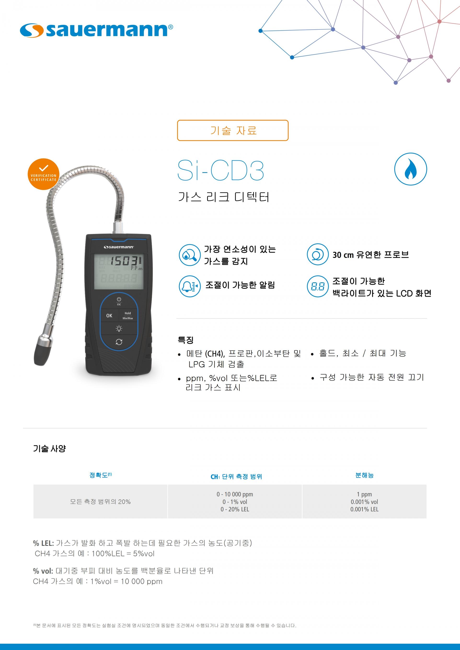 Sauermann의 Si-CD3 가스누출 감지기는 다양한 가연성가스(메탄, 프로판, 이소부탄, LPG 및 기타 탄화수소)의 미세한 누출도 빠르고 쉽게 감지하는 데 적합합니다.