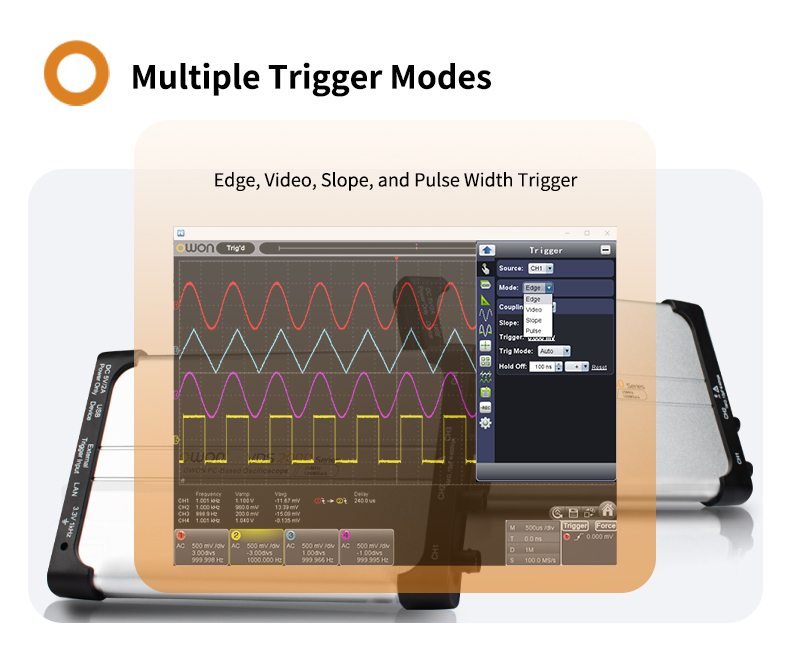 - Multiple trigger modes: Supports edge, video, slope, and pulse width triggering