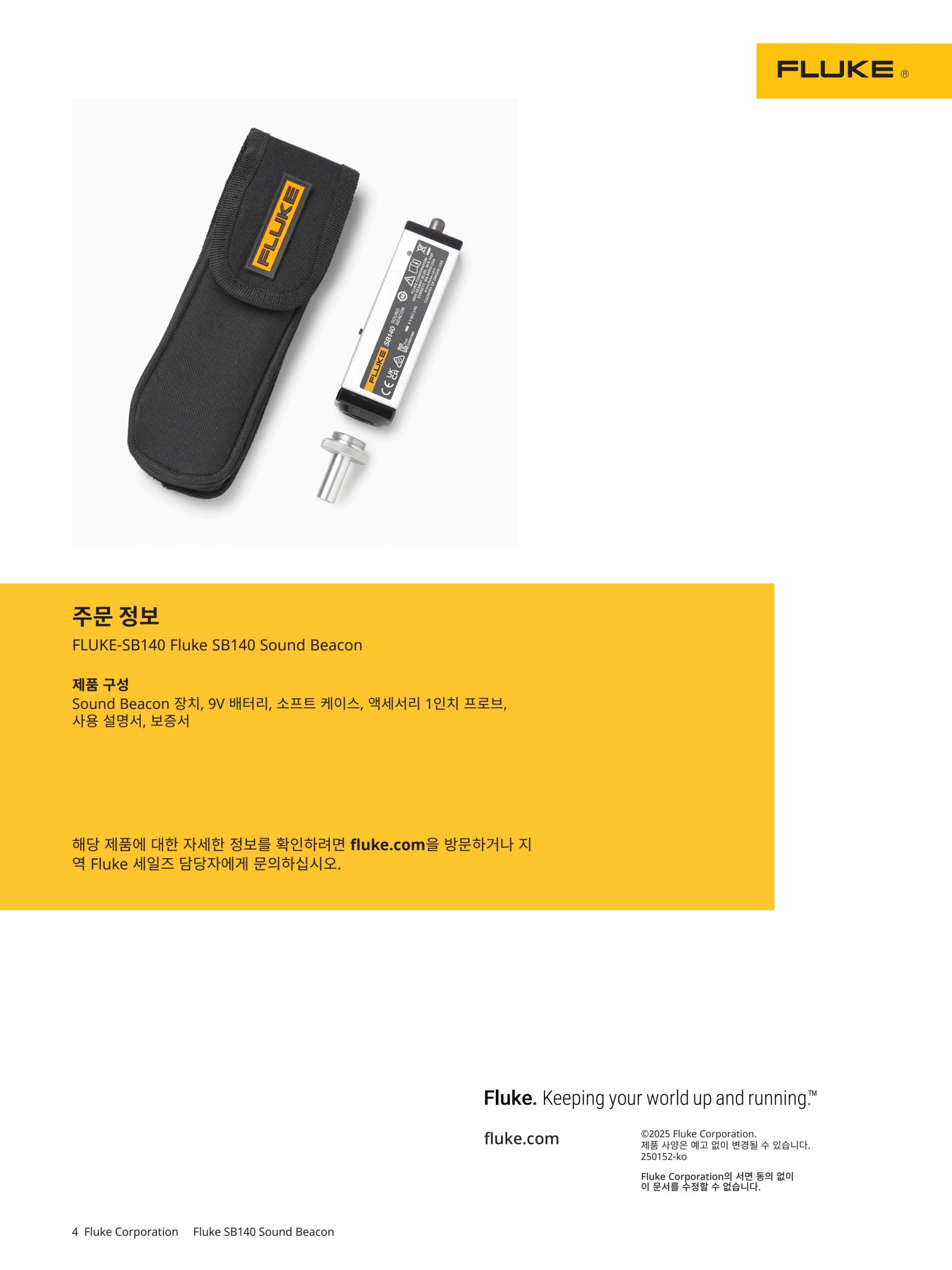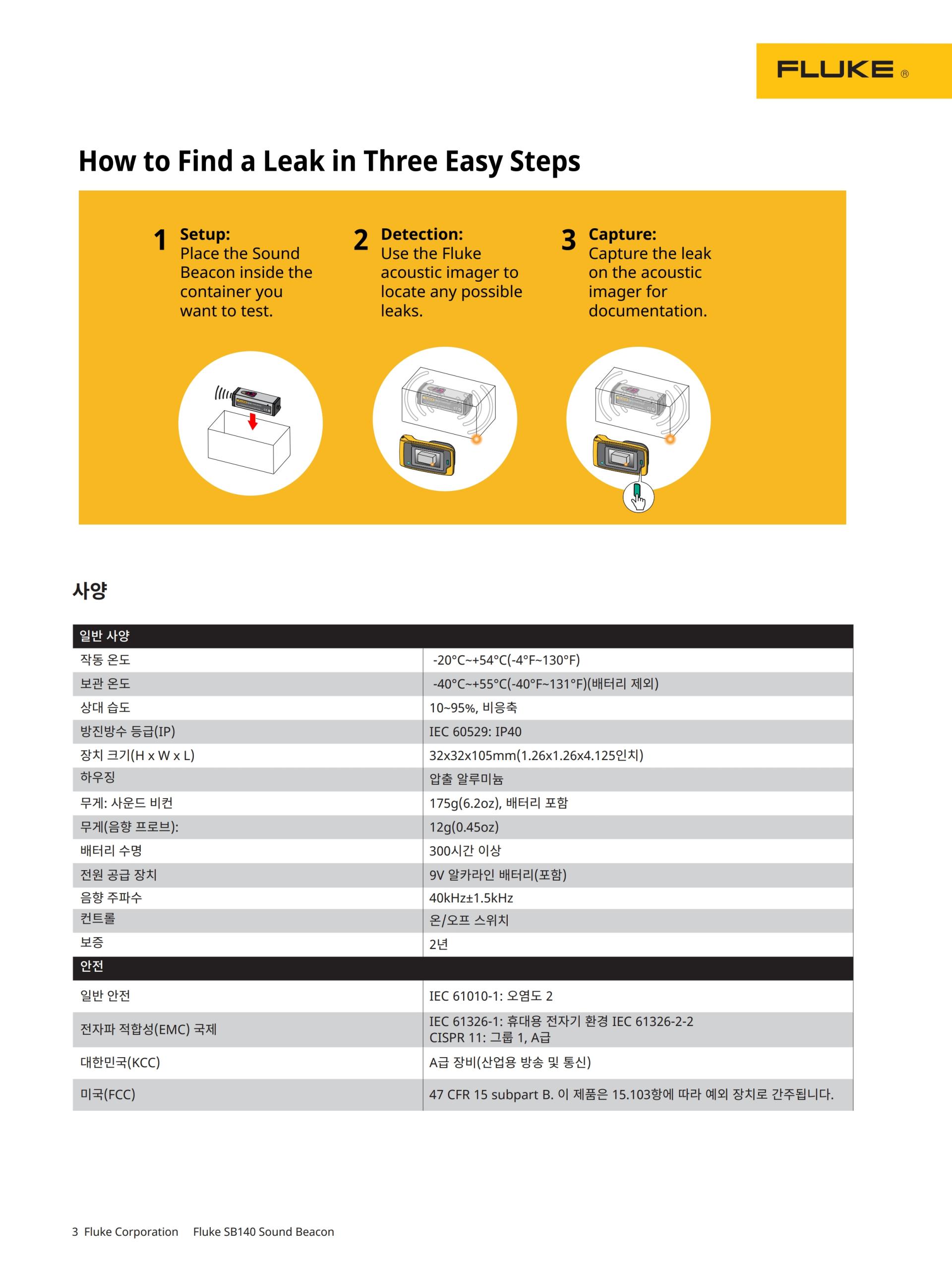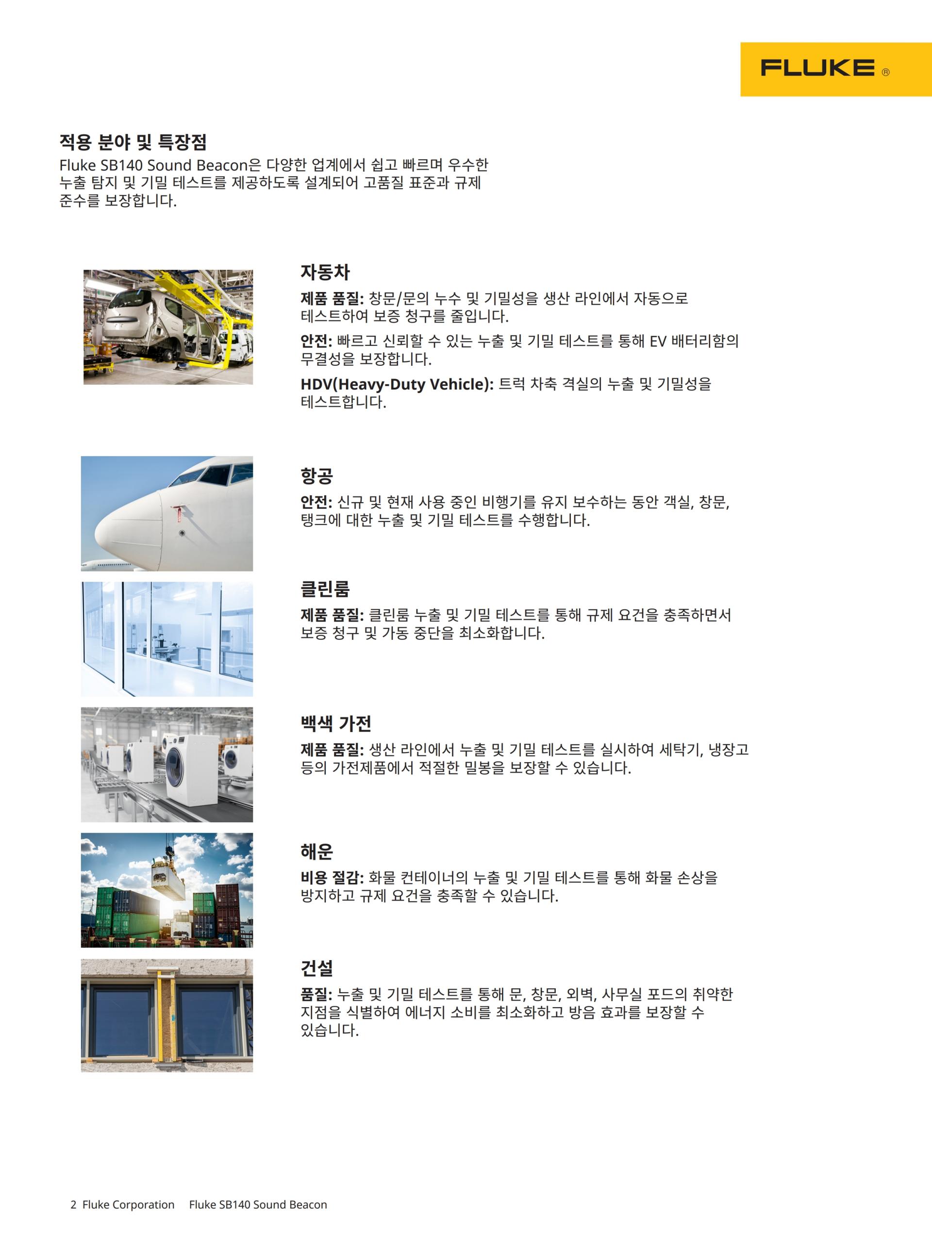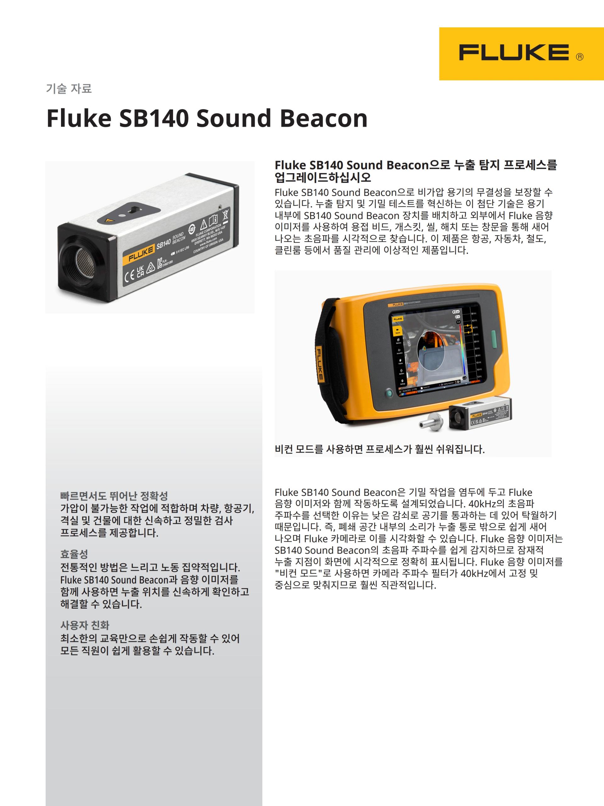 Fluke SB140 Sound Beacon은 다양한 업계에서 쉽고 빠르며 우수한 누출 감지 및 기밀성 테스트를 제공하며 고품질 표준과 규정 준수를 보장합니다.