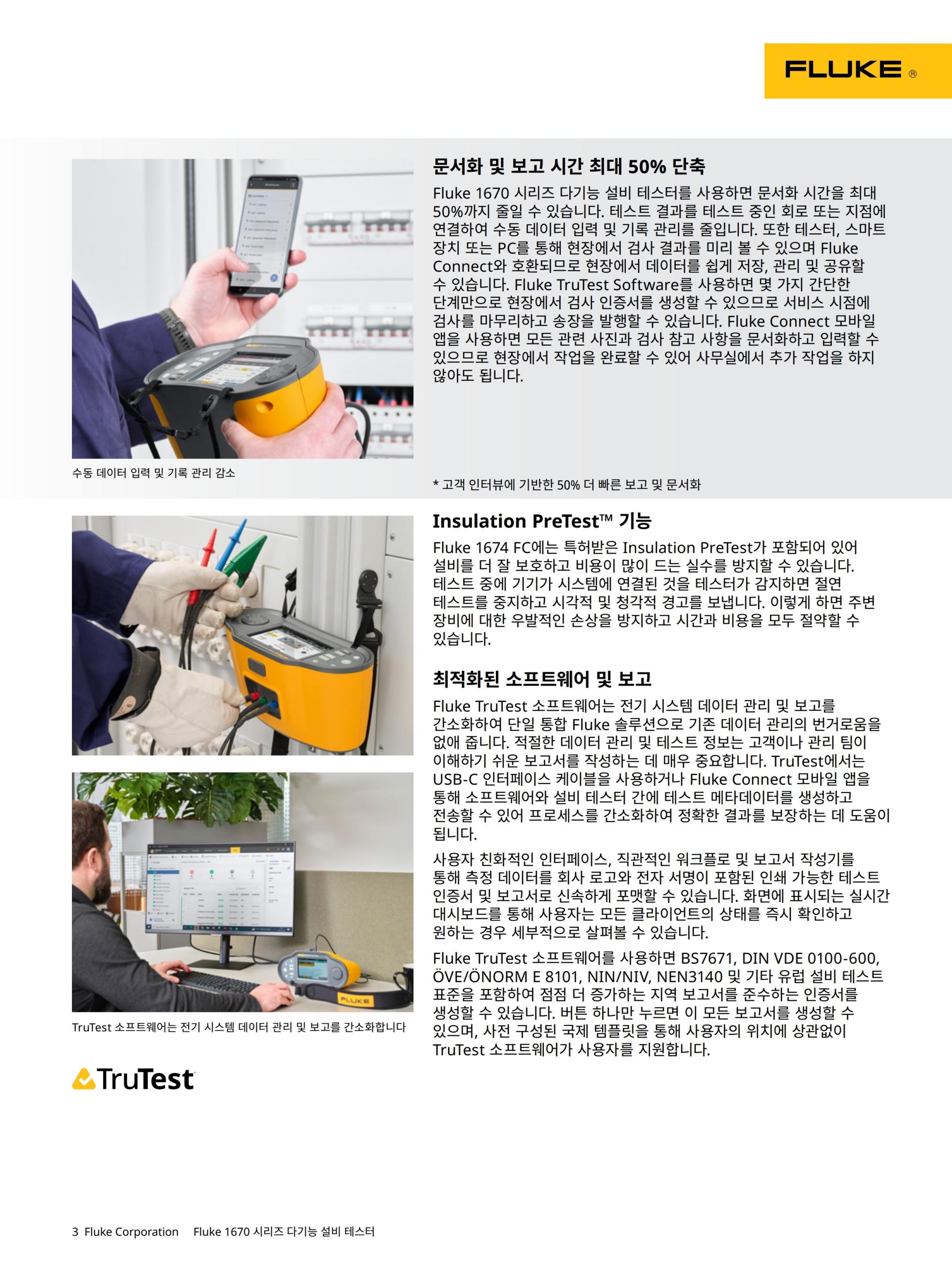 Fluke 1670 시리즈 다기능 설비 테스터를 사용하면 문서화 시간을 최대 50%까지 줄일 수 있습니다. 테스트 결과를 테스트 중인 회로 또는 지점에 연결하여 수동 데이터 입력 및 기록 관리를 줄입니다. 또한 테스터, 스마트 장치 또는 PC를 통해 현장에서 검사 결과를 미리 볼 수 있으며 Fluke Connect와 호환되므로 현장에서 데이터를 쉽게 저장, 관리 및 공유할 수 있습니다. Fluke TruTest Software를 사용하면 몇 가지 간단한 단계만으로 현장에서 검사 인증서를 생성할 수 있으므로 서비스 시점에 검사를 마무리하고 송장을 발행할 수 있습니다. Fluke Connect 모바일 앱을 사용하면 모든 관련 사진과 검사 참고 사항을 문서화하고 입력할 수 있으므로 현장에서 작업을 완료할 수 있어 사무실에서 추가 작업을 하지 않아도 됩니다.