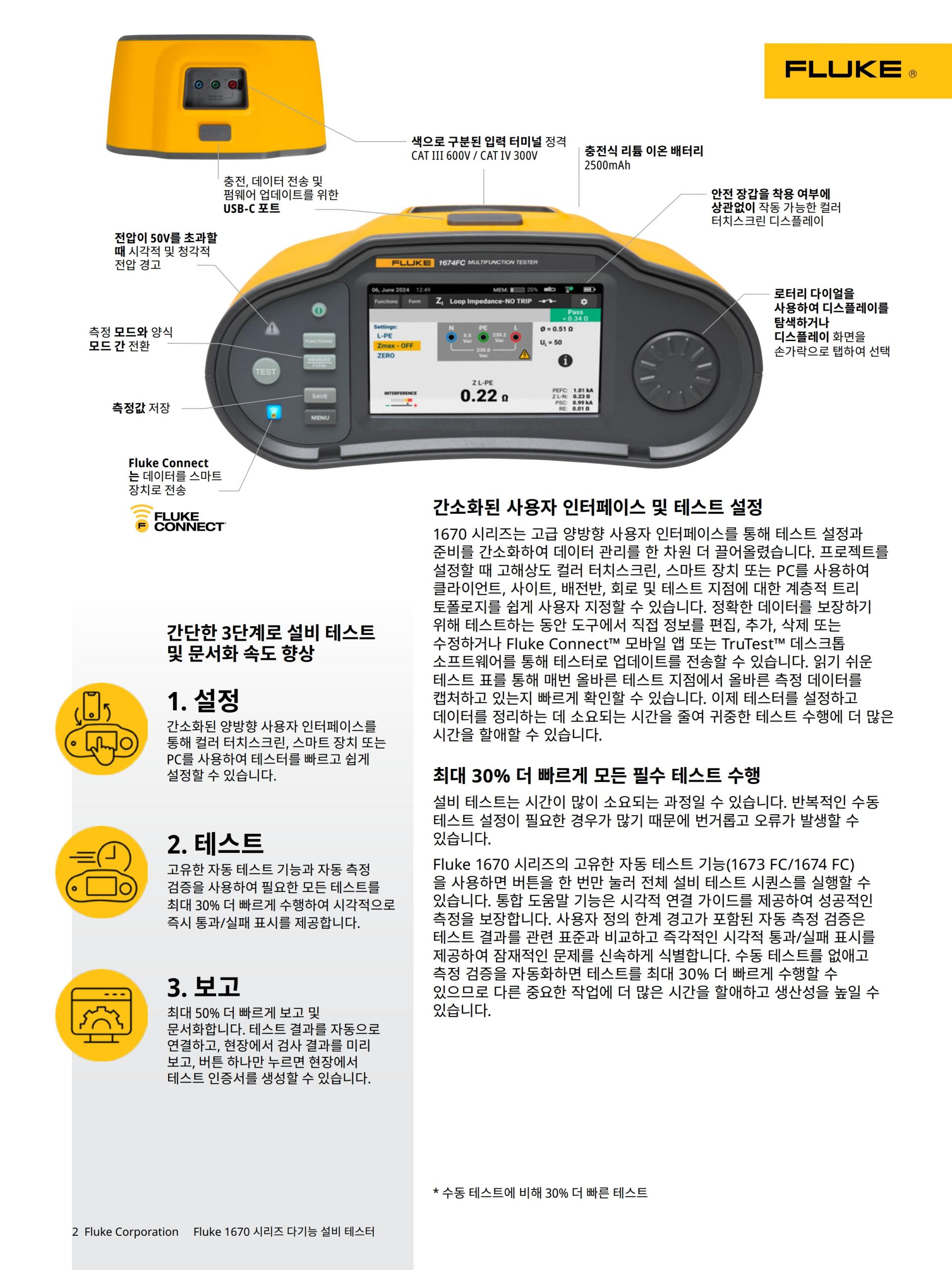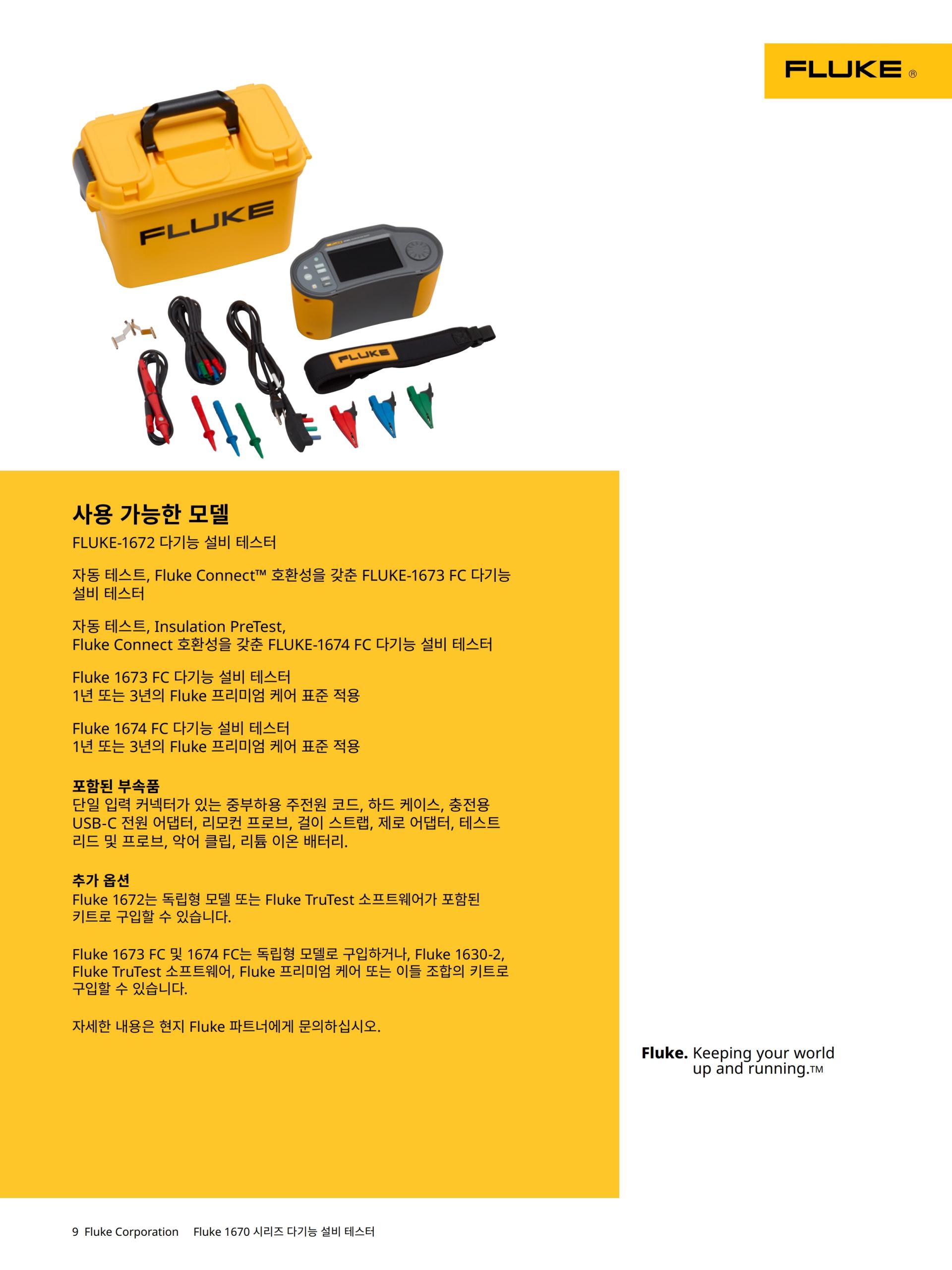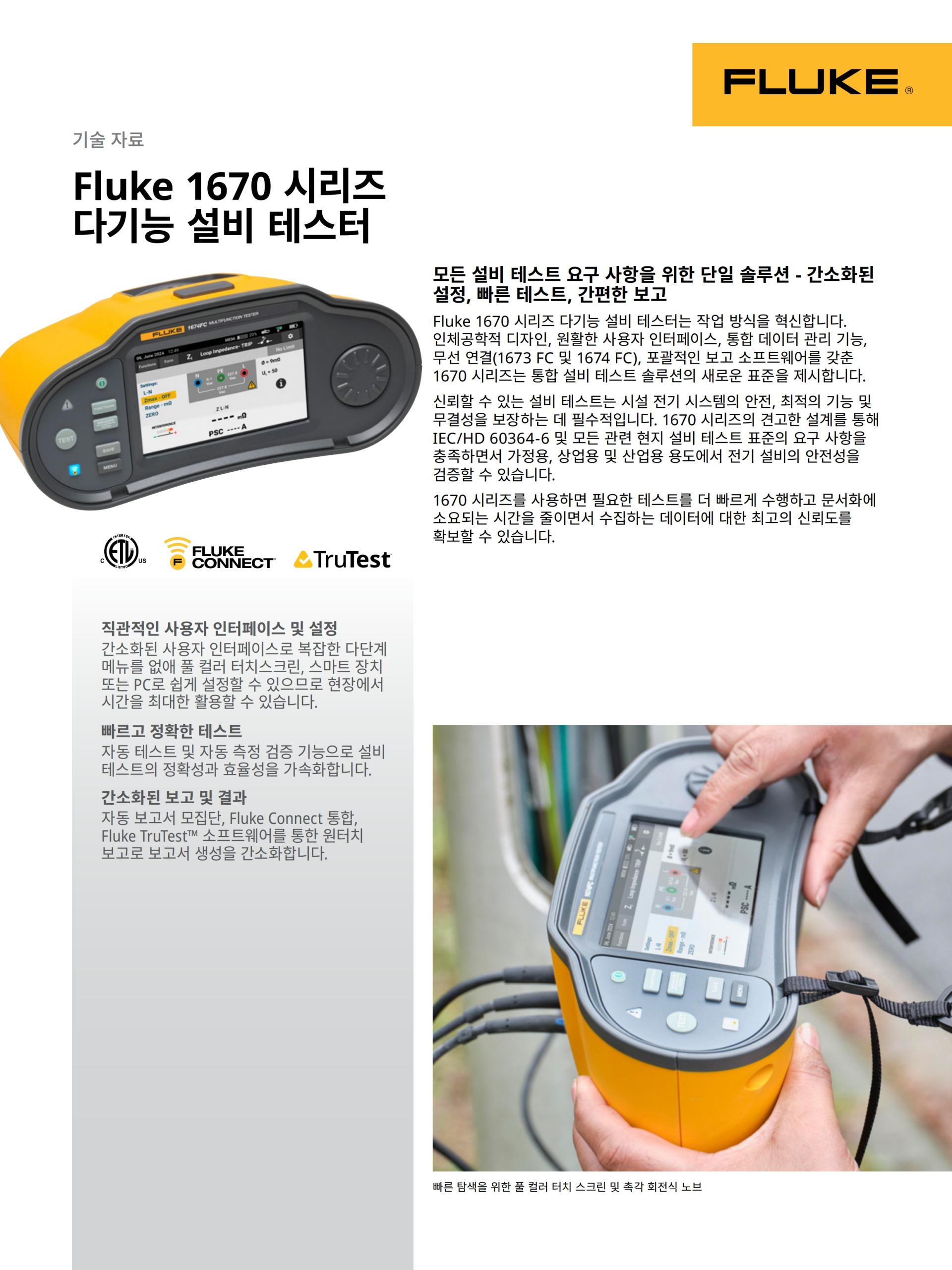 Fluke 1670 시리즈 다기능 설비 테스터는 작업 방식을 혁신합니다. 인체공학적 디자인, 원활한 사용자 인터페이스, 통합 데이터 관리 기능, 무선 연결(1673 FC 및 1674 FC), 포괄적인 보고 소프트웨어를 갖춘 1670 시리즈는 통합 설비 테스트 솔루션의 새로운 표준을 제시합니다.