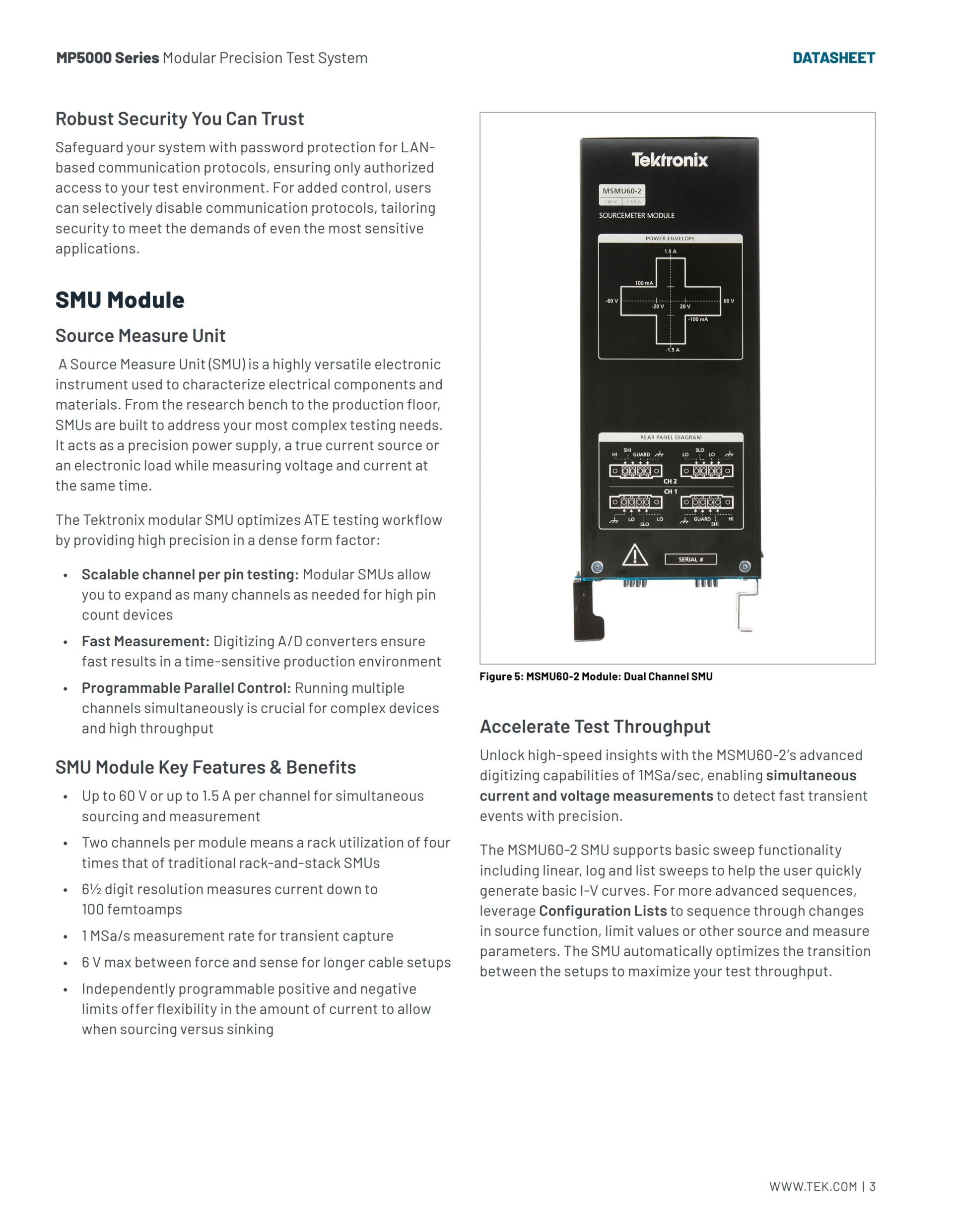 Tektronix MP5000 모듈형 정밀 시험 시스템은 확장을 고려한 설계로 성장할 준비가 되어 있습니다. SMU와 PSU 모듈을 혼합해 사용하면서 확장하세요. 높은 채널 밀도와 빠른 모듈 교체로 다운타임을 최소화하고 처리량을 극대화합니다. 또한 Tektronix는 정밀성과 지원을 바탕으로 차세대 테스트를 지원하겠습니다.