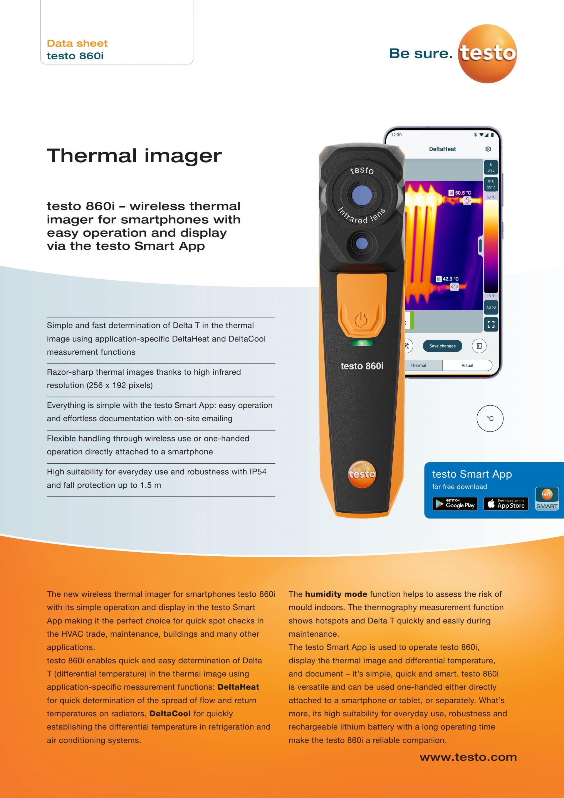 스마트폰용 무선 열화상 카메라 testo 860i는 DeltaHeat 및 DeltaCool과 같은 애플리케이션 특화 측정 기능을 통해 열화상에서 Delta T(온도 차이)를 빠르고 간편하게 확인할 수 있습니다.