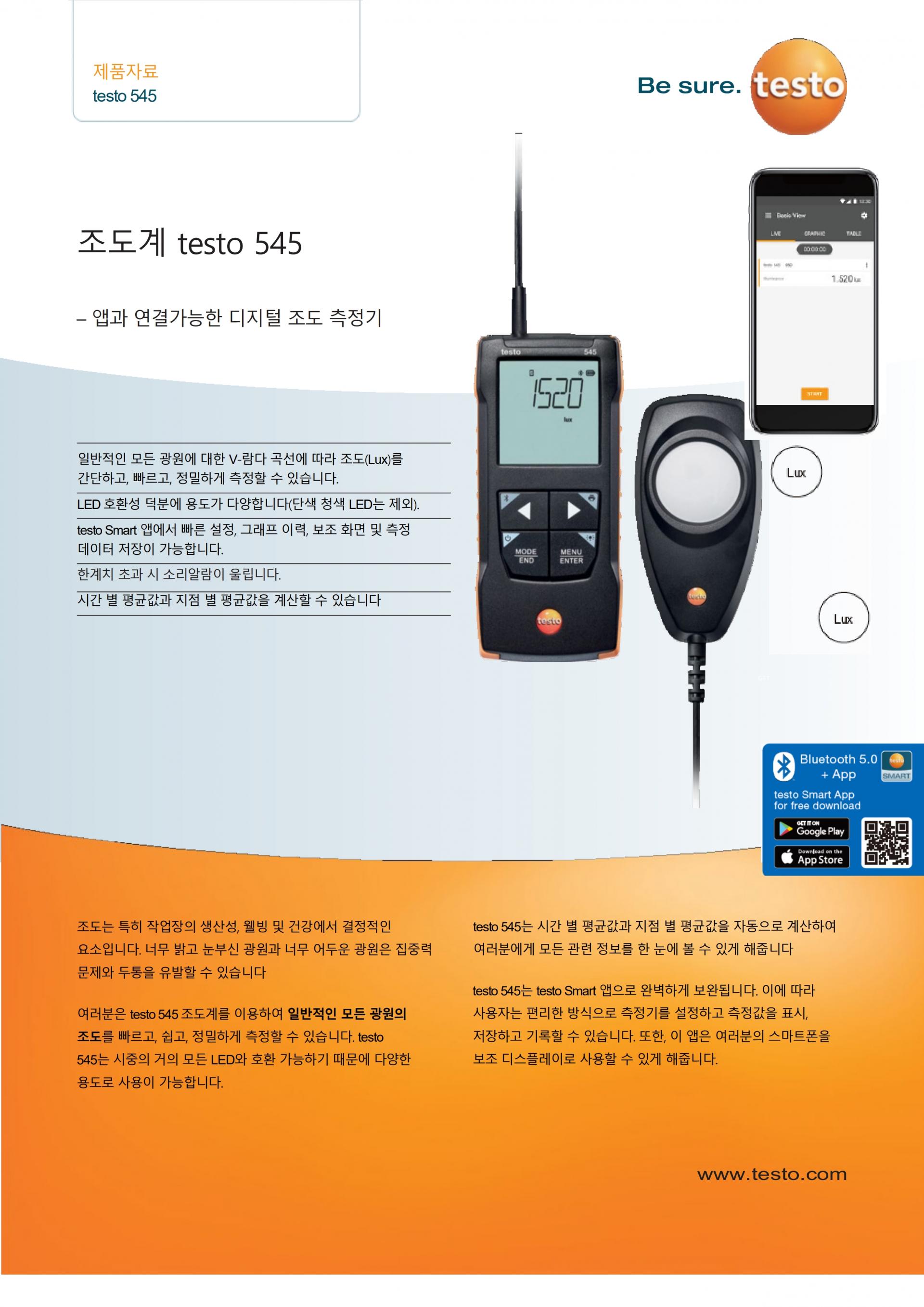 컴팩트한 조도계 testo 545는 일반적인 모든 광원에 대한 V-람다 곡선에 따라 조도(Lux)를 간단하고 빠르며 정밀하게 측정할 수 있습니다. testo Smart 앱을 이용하여 측정기 설정, 측정된 값의 표시 및 저장과 기록 시에 더욱 쉽고 편리하게 관리할 수 있습니다.