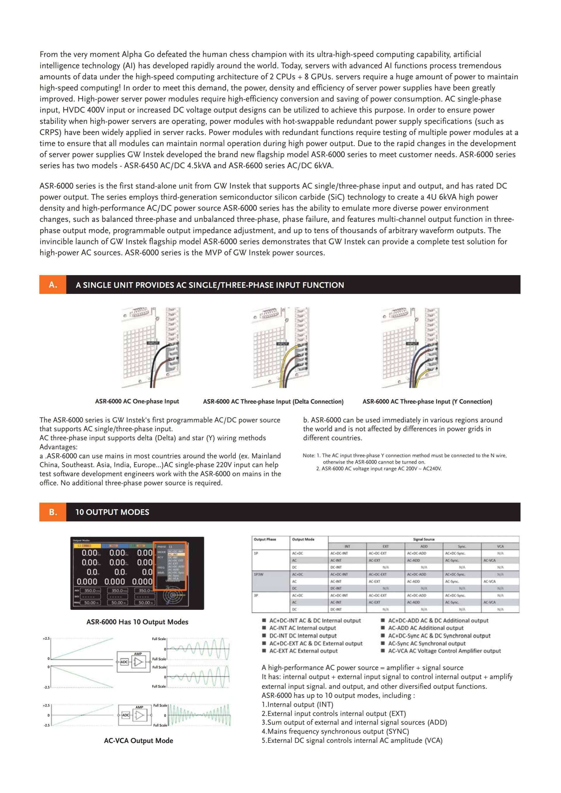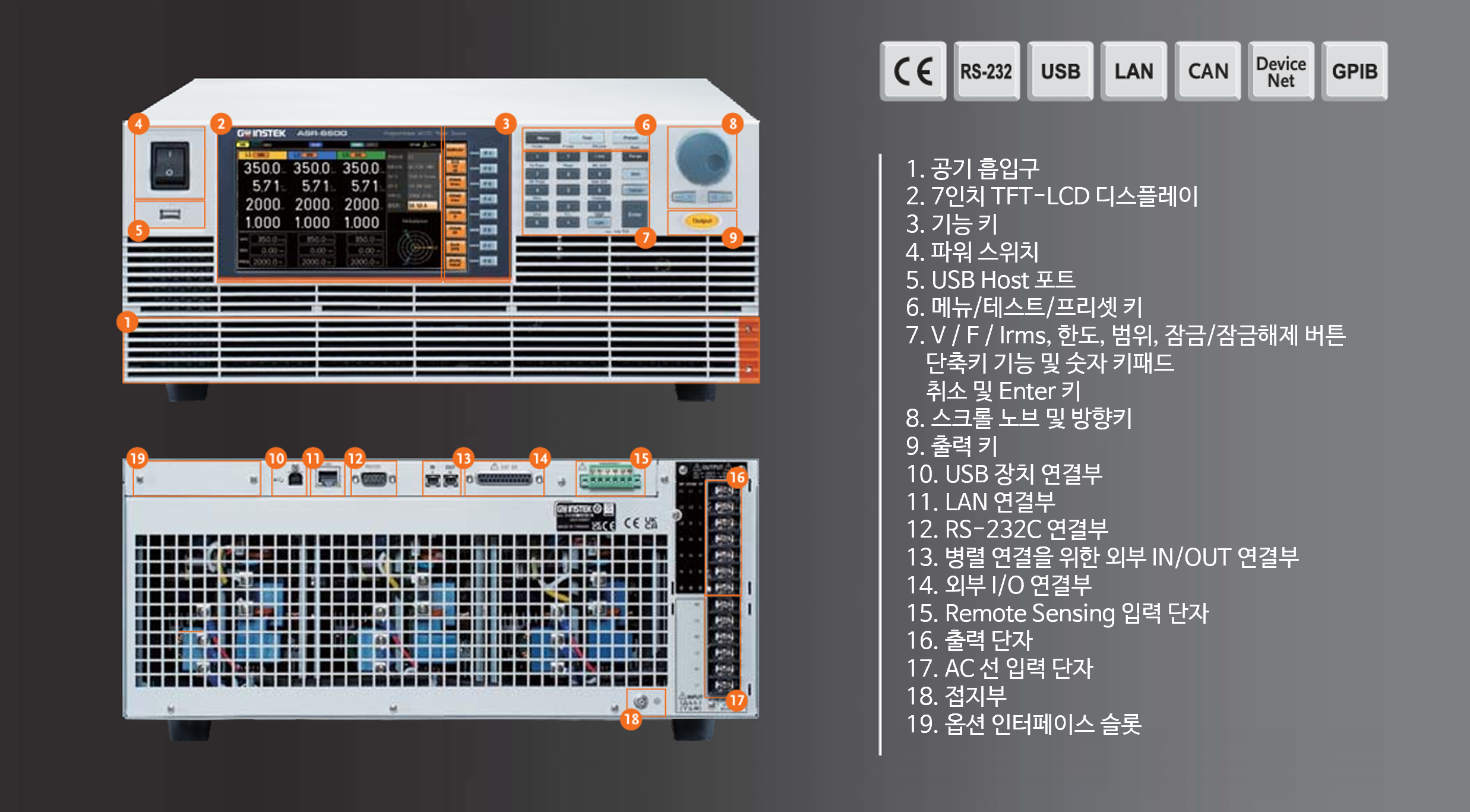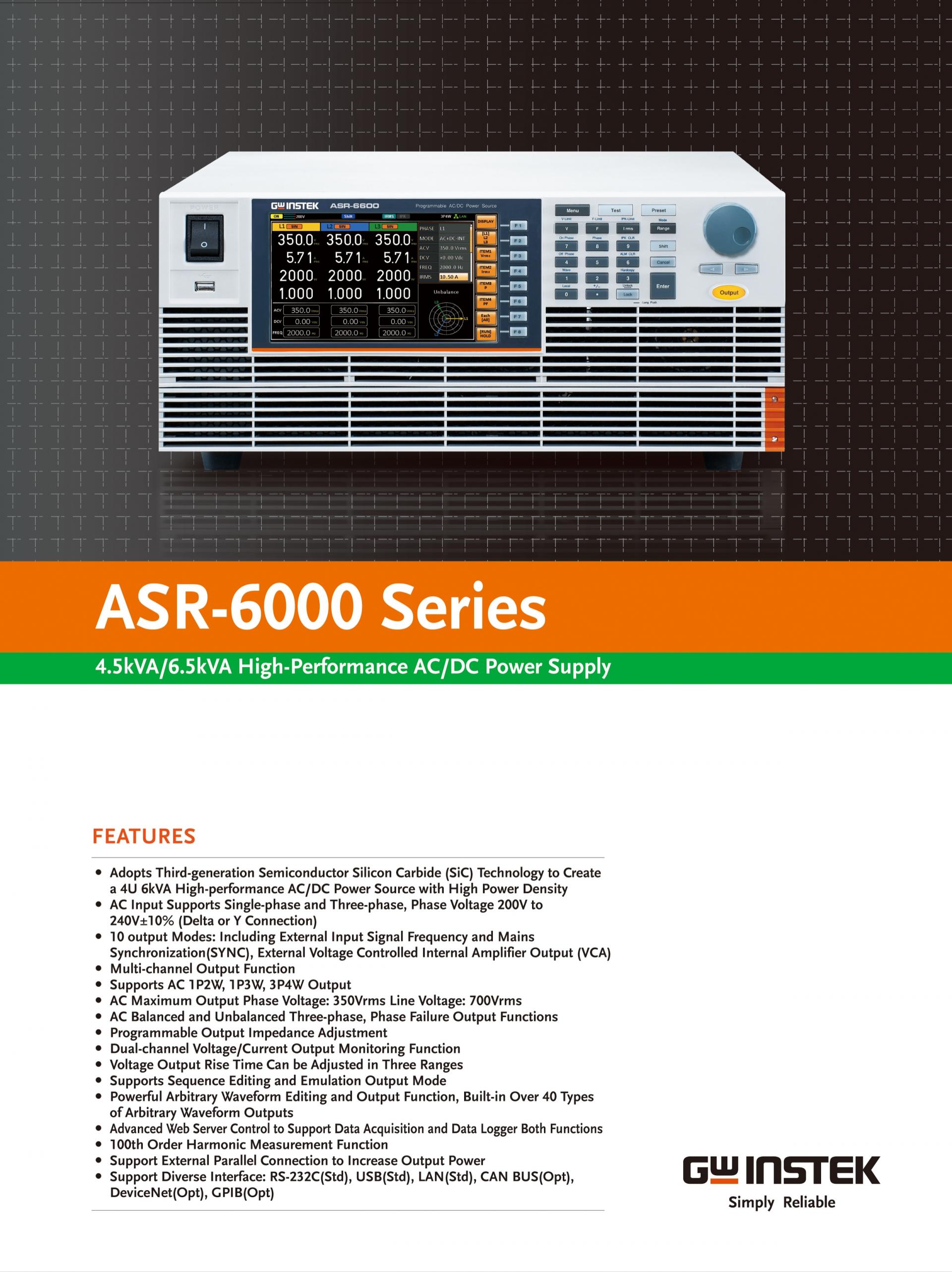 ASR-6000 시리즈는 GW Instek의 첫 독립실행형 유닛으로, AC 단상/3상 입력 및 출력 그리고 DC 전원 출력을 지원합니다.