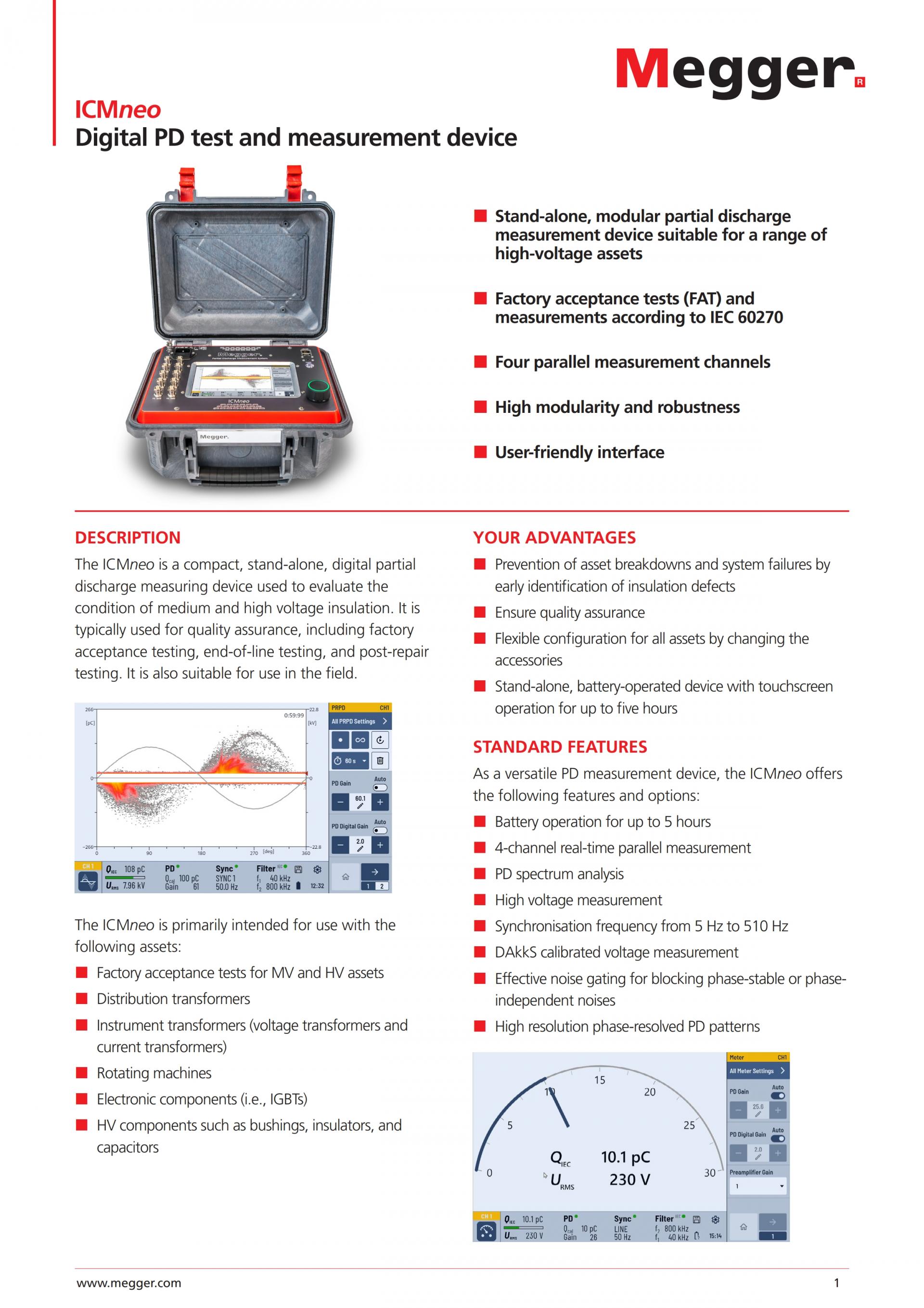 The ICMneo is a state-of-the-art, stand-alone digital partial discharge (PD) measurement device designed to evaluate the condition of medium and high voltage insulation. Engineered for reliability and precision, it’s suitable for factory acceptance testing, post-repair assessments, and end-of-line quality assurance, as well as online and offline spot testing on site. This battery-operated device features a 7” touchscreen for intuitive operation and supports up to four parallel measurement channels. Its modular design and advanced capabilities make it a versatile solution for measuring any MV/HV asset including bushings, spacers, cable accessories, instrument transformers, distribution transformers, rotating machines, electronic components e.g. IGBTs. By identifying insulation defects at an early stage, the ICMneo helps prevent costly breakdowns, ensures system efficiency, and supports compliance with the latest IEC 60270 standard.