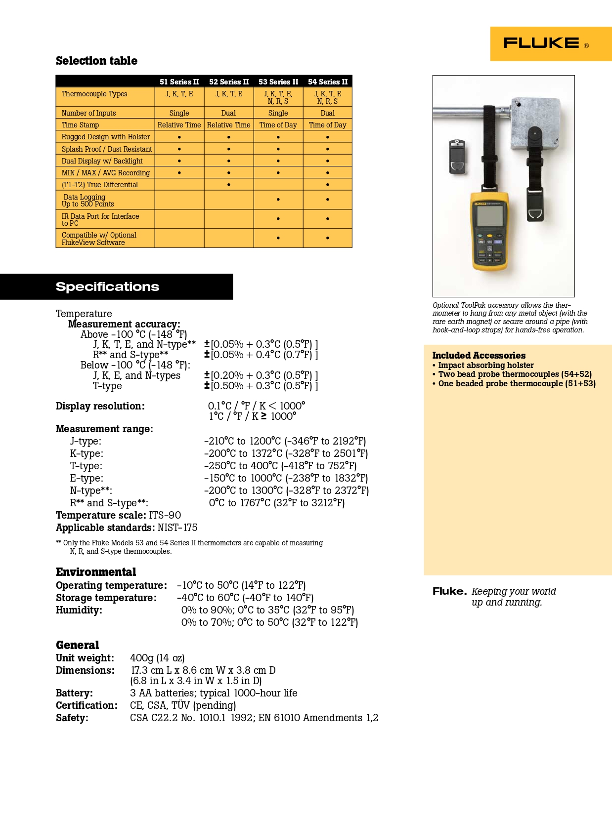 Fluke 50 시리즈 II 접촉식 온도계는 견고한 휴대용 테스트 도구에서 빠른 응답 및 실험실 정확도(0.05% + 0.3°C)를 제공합니다.