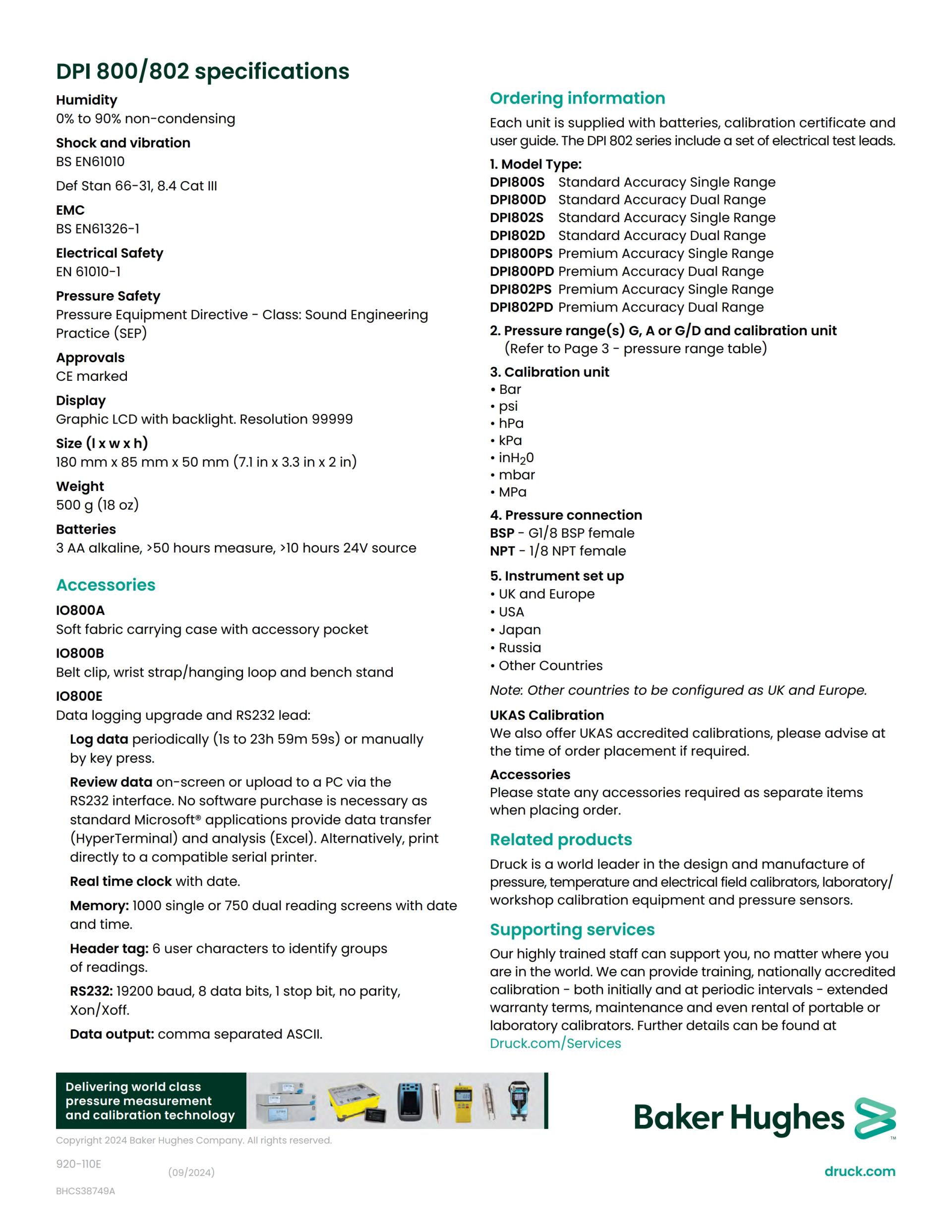 4. DPI 800/802 Specifications - 습도 0% to 90% 비 응축, Def Stan 66-31, 8.6 Cat III - 충격과 진동 BS EN61010:2001, Def Stan 66-31, 8.4 Cat III - EMC BS EN61326-1:1998 + A2:2001 - 안전 전기 BS EN61010:2001. Pressure Equipment Directive (PED), Class SEP. CE marked - 디스플레이 Graphic LCD with backlight. 해상도 99999 - 사이즈 (l x w x h) and 무게 7.1 in x 3.3 in x 2 in (180 mm x 85 mm x 50 mm), 18 oz (500 g) - 배터리 3 AA 알칼리, >50 시간 측정= >10 시간 24V 소스 액세서리 IO800A: 악세사리 주머니가 있는 부드러운 패브릭 케이스 IO800B: 벨트 클립, 손목 띠 / 고리 및 벤치 받침대 IO800C: 충전기가 있는 NiMh 베터리, 외부 충전 된 베터리 IO800E: 데이터 로깅 업그레이드 및 RS232 리드 |