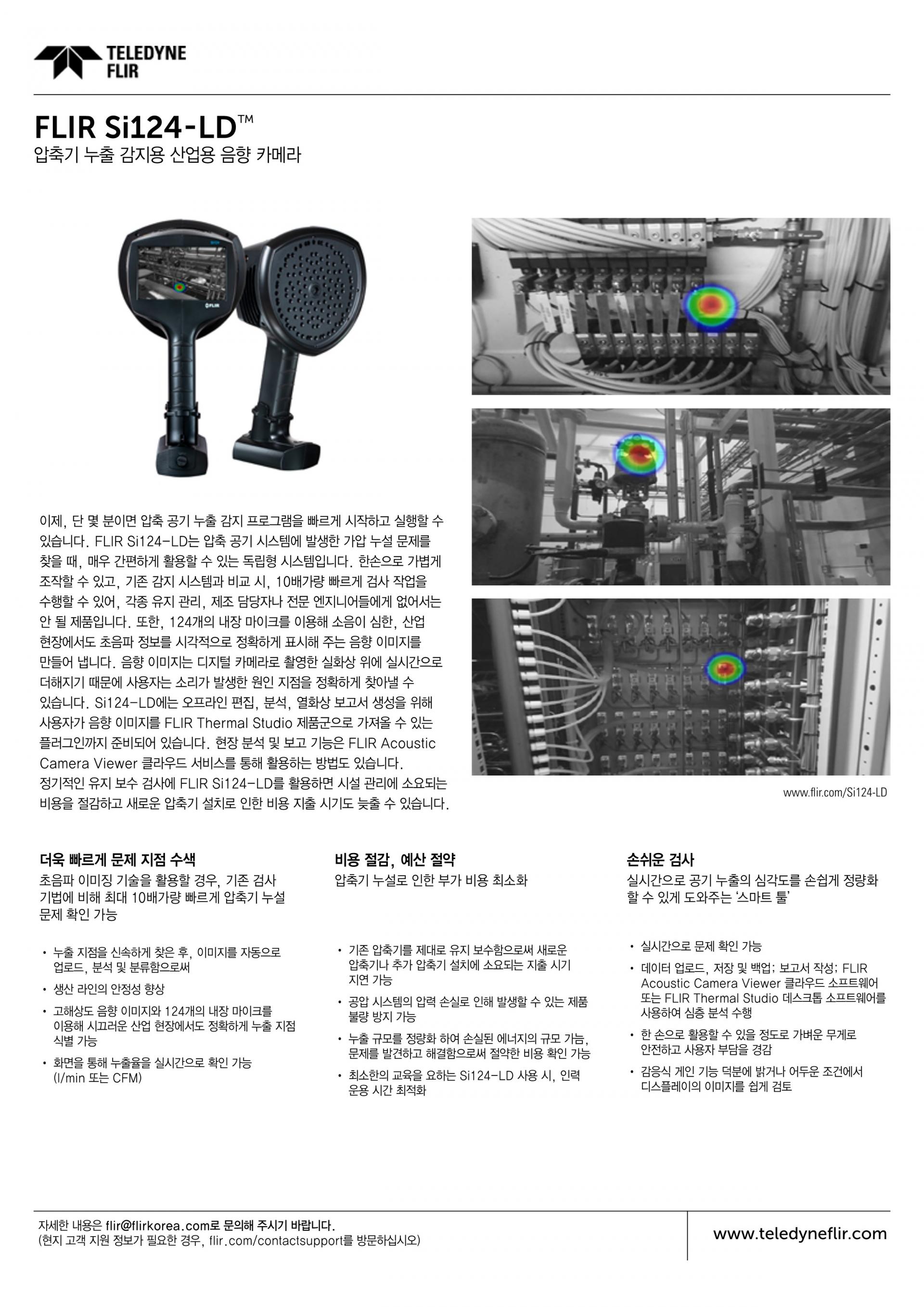 FLIR Si124-LD 음향 이미징 카메라는 압축 공기 시스템에서 기존 방법보다 최대 10배 더 빠르게 가압 누출 위치를 찾는 것을 보조할 수 있습니다. 한 손으로 사용할 수 있는 이 경량 솔루션은 124개의 마이크가 장착되어 있으며 시끄러운 산업 환경에서도 초음파 정보를 시각적으로 표시하는 정밀한 음향 이미지를 생성합니다. 음향 영향이 디지털 카메라 사진 위에 실시간으로 이동되므로 사운드의 소스를 정확하게 찾을 수 있습니다. Si124-LD는 사용자가 오프라인 편집, 분석, 고급 보고서 생성을 위해 음향 영상을 FLIR Thermal Studio 제품군으로 가져올 수 있는 플러그인 기능을 제공합니다. FLIR Acoustic Camera Viewer 클라우드 서비스를 사용하여 현장 분석 및 보고를 수행할 수도 있습니다. FLIR Si124-LD는 정기적인 유지보수 일정을 통해 시설의 공과금 비용을 절감하고 새로운 압축기를 설치하는 것을 지연하는 데 도움을 드릴 수 있습니다.