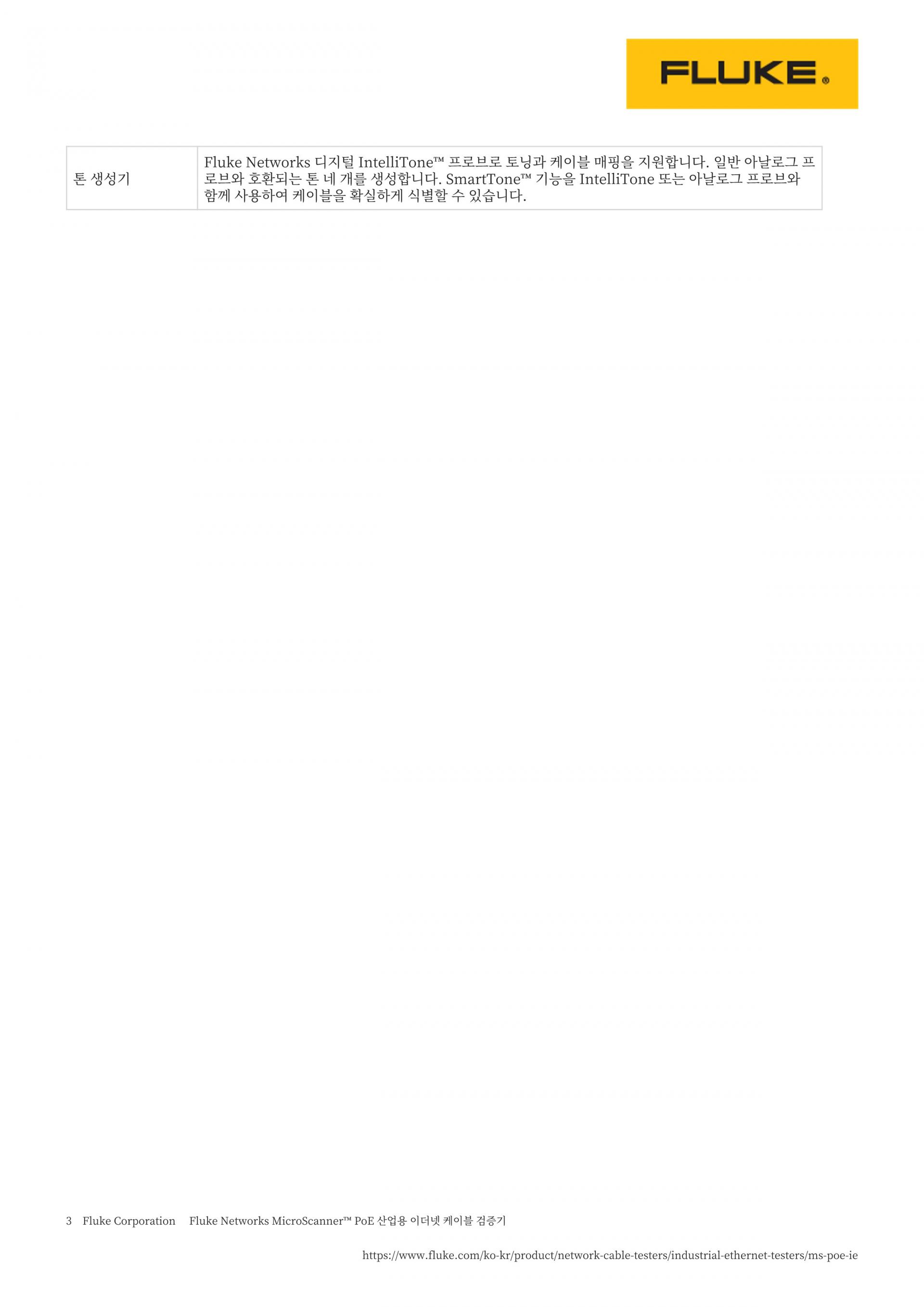 | 톤 제너레이터 | Fluke Networks 디지털 IntelliTone™ 프로브로 토닝 및 케이블 매핑을 지원합니다. 일반적인 아날로그 프로브와 호환되는 4가지 톤을 생성합니다. SmartTone™ 기능은 IntelliTone 또는 아날로그 프로브를 사용할 때 번들의 케이블을 확실하게 식별합니다. |