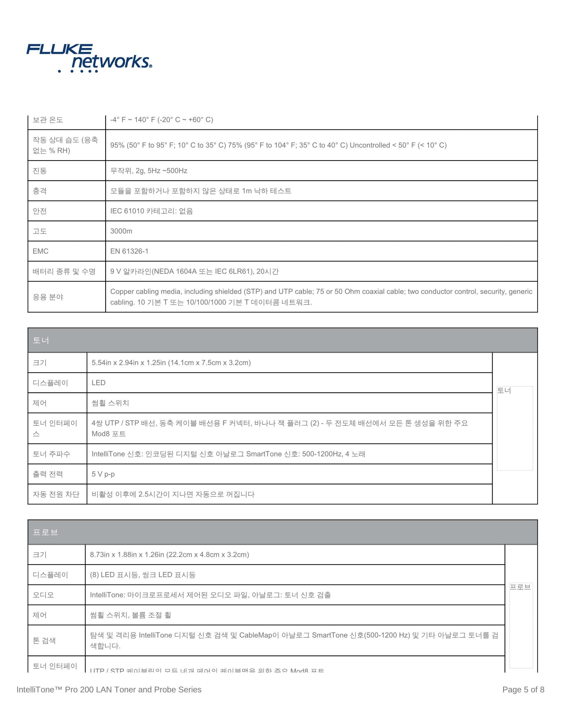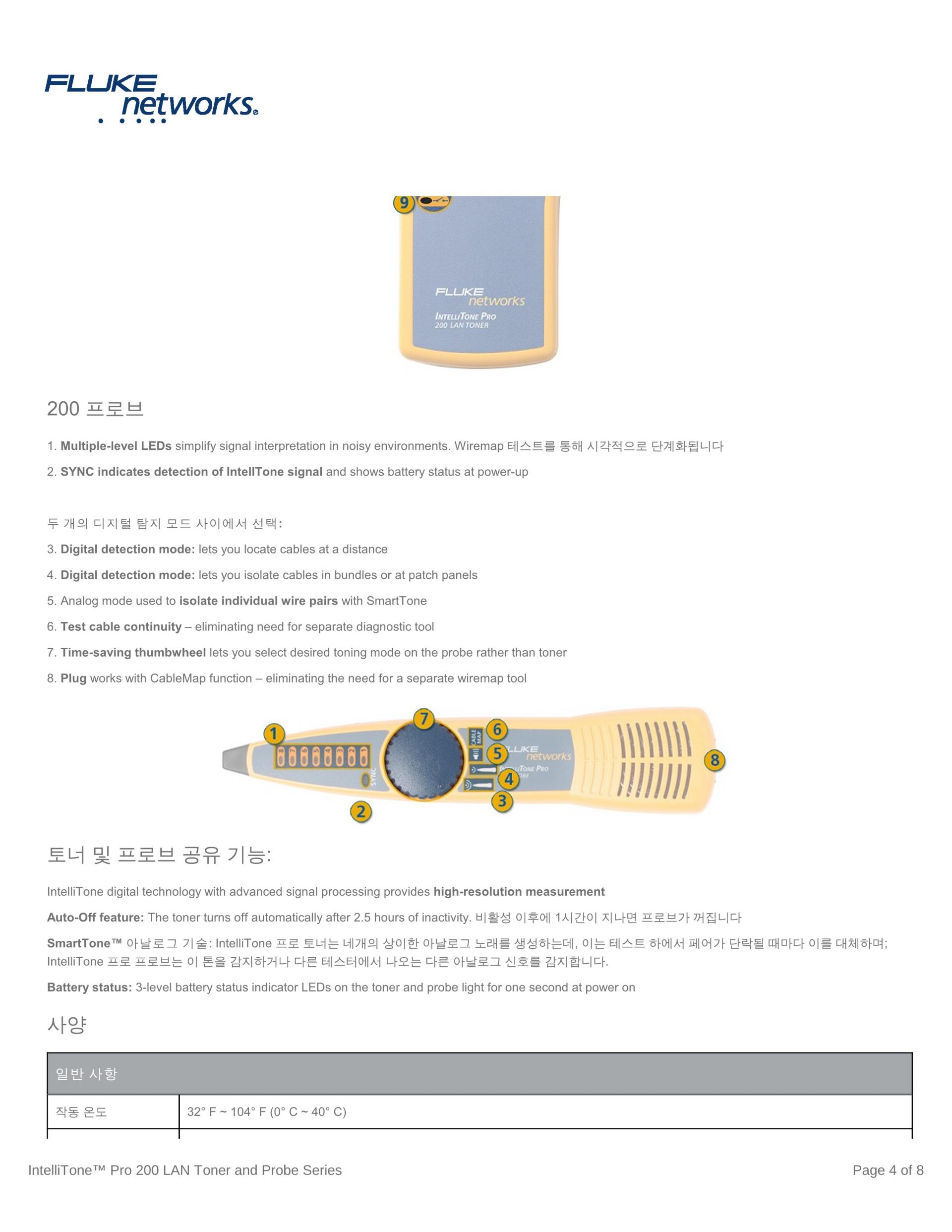 | 톤 감지 | 찾기, 격리 및 케이블 맵을 위한 IntelliTone™ 디지털 신호 감지 아날로그 SmartTone 신호(500-1200Hz) 및 기타 아날로그 토너를 감지합니다. |