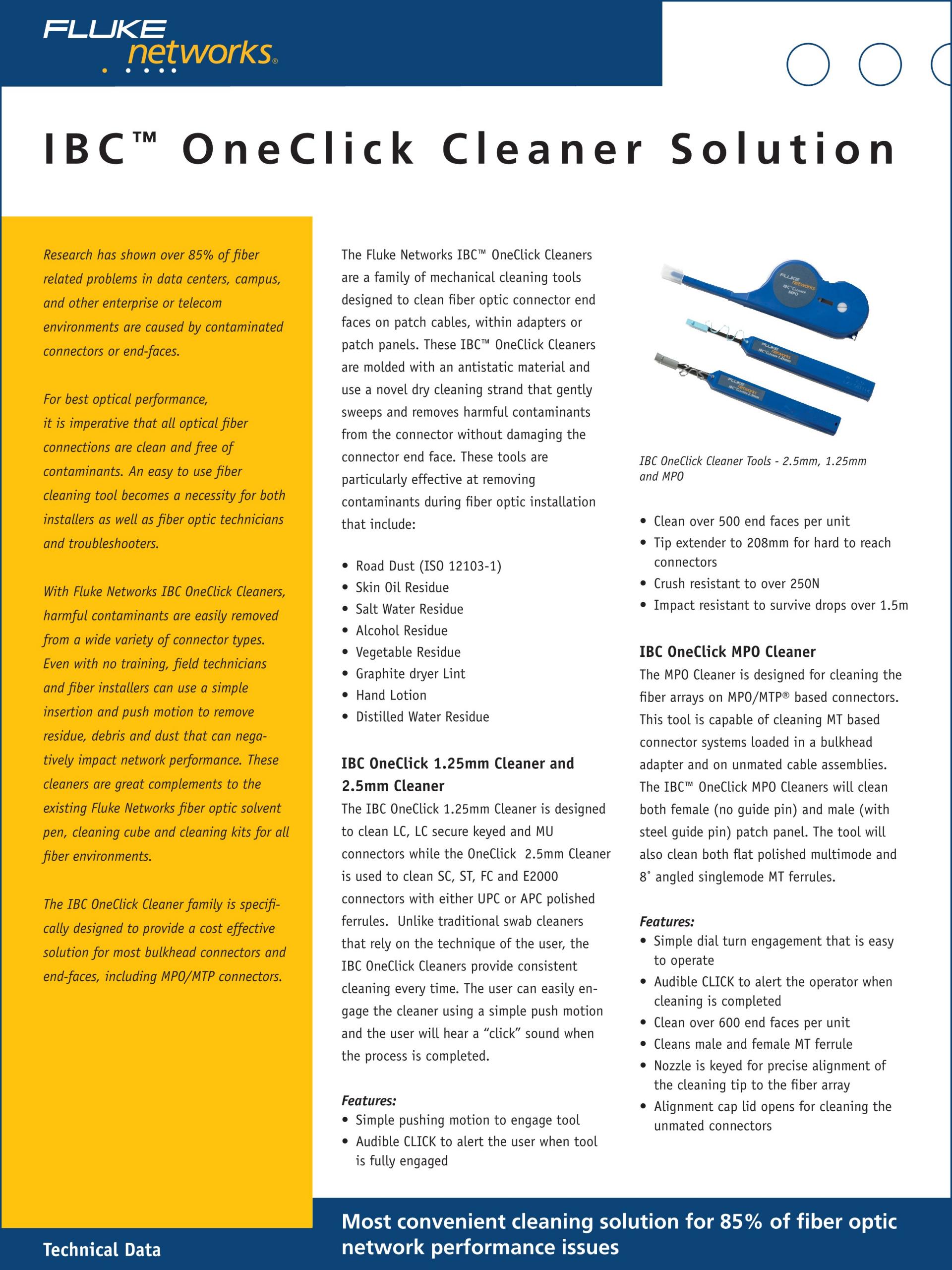 - 광섬유 링크 장애의 #1 원인인 오염을 제거하는 데 필요한 모든 것을 포함합니다.