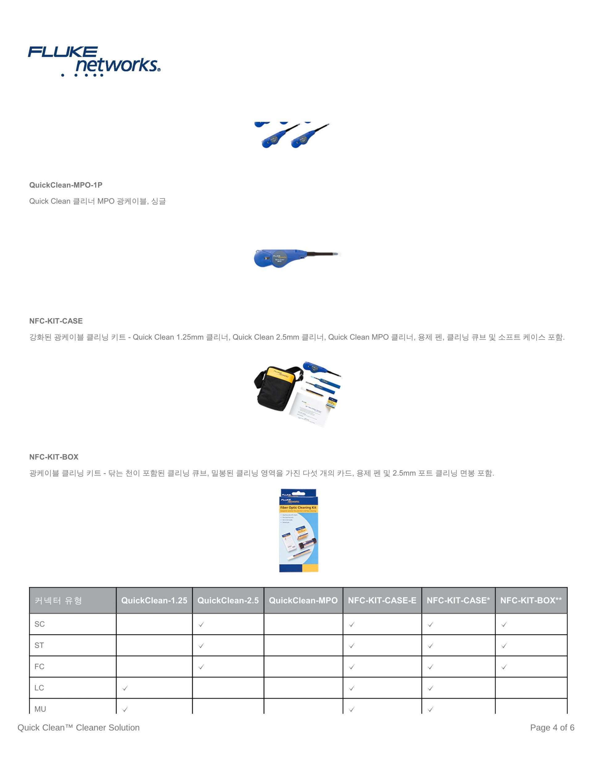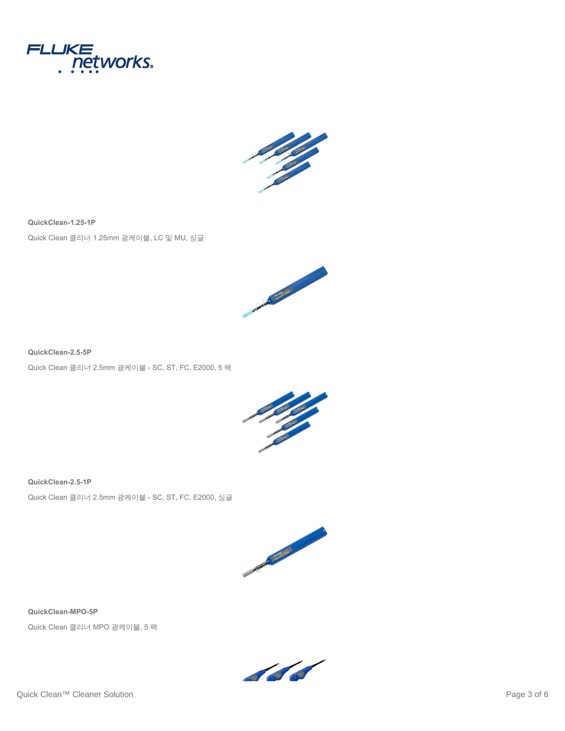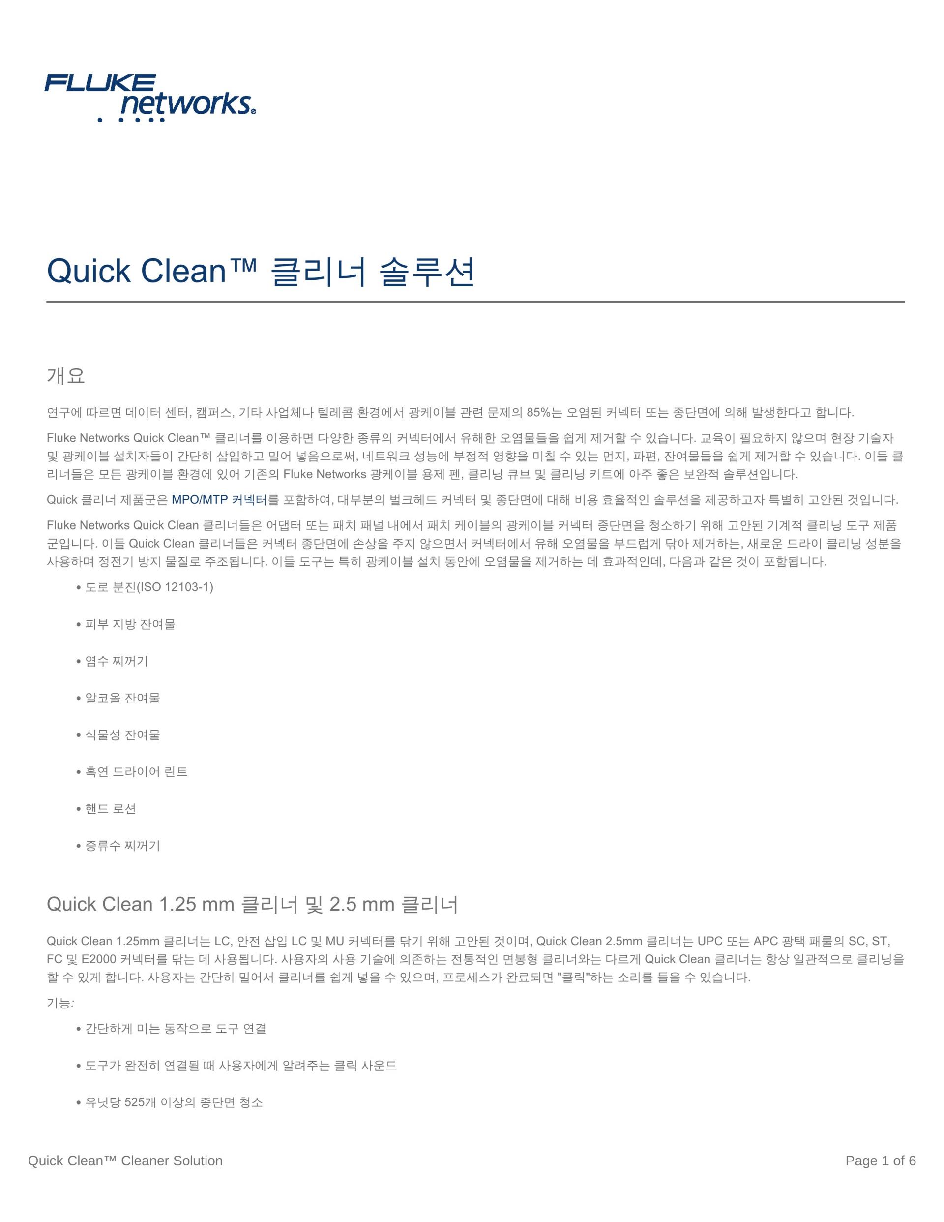 Fluke Networks의 Fiber Optic Cleaning Kit는 모든 광케이블 네트워크에 있는 가장 제거하기 힘든 오염 물질을 효과적으로 제거하는 최상의 광케이블 청소용 툴로 구성됩니다. 다양한 키트 옵션과 함께, 사용하기 쉬운 Quick Clean™ Cleaner와 편리한 청소용 큐브/카드 및 최고의 광케이블 용제 펜 중에서 선택하여 패치 코드 및 포트 내의 광케이블 단면 모두를 청소할 수 있습니다. 8종의 모든 광케이블 청소용 키트는 린트를 생성하지 않는 제품과 소재로 구성되어, 최적의 건식 및 습식 청소를 가능하게 합니다.