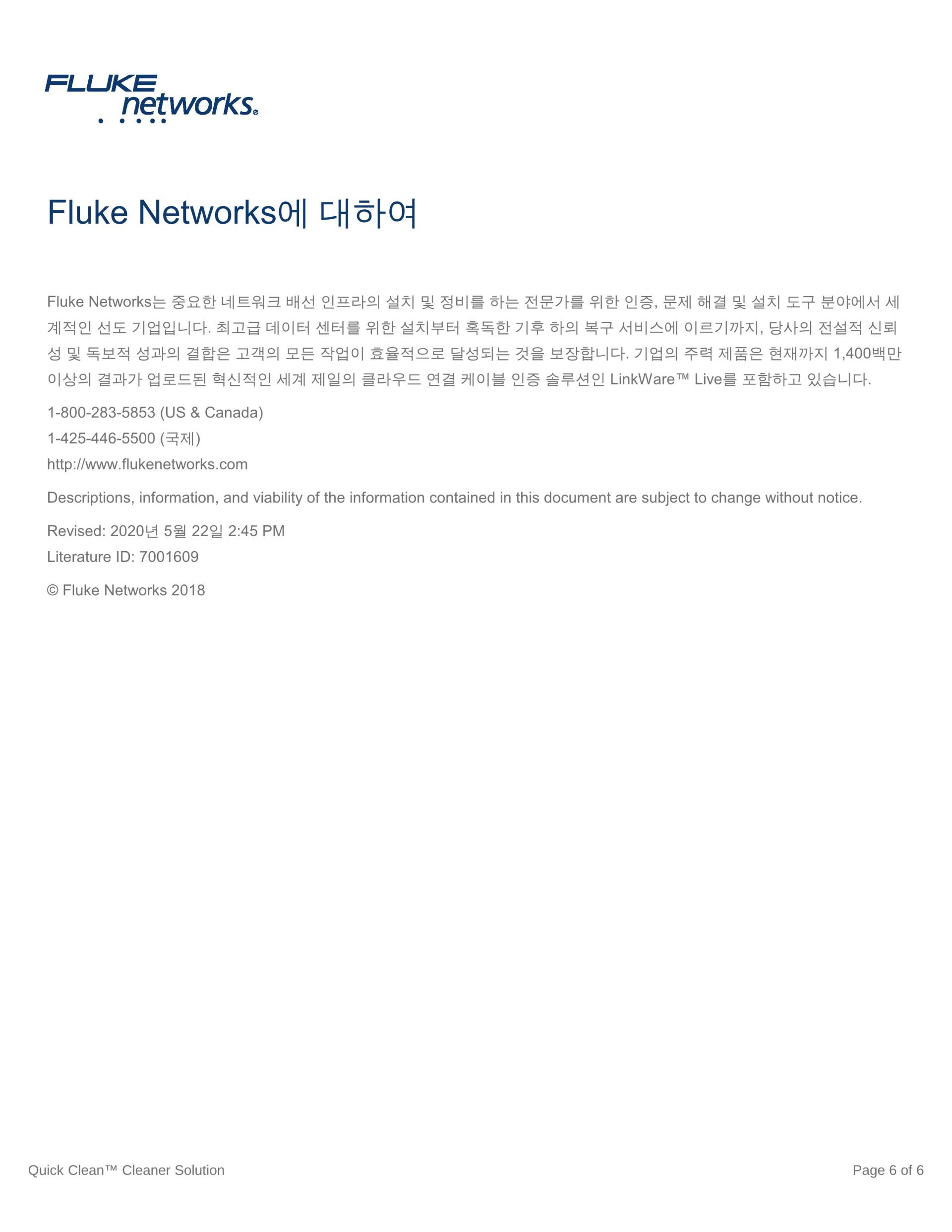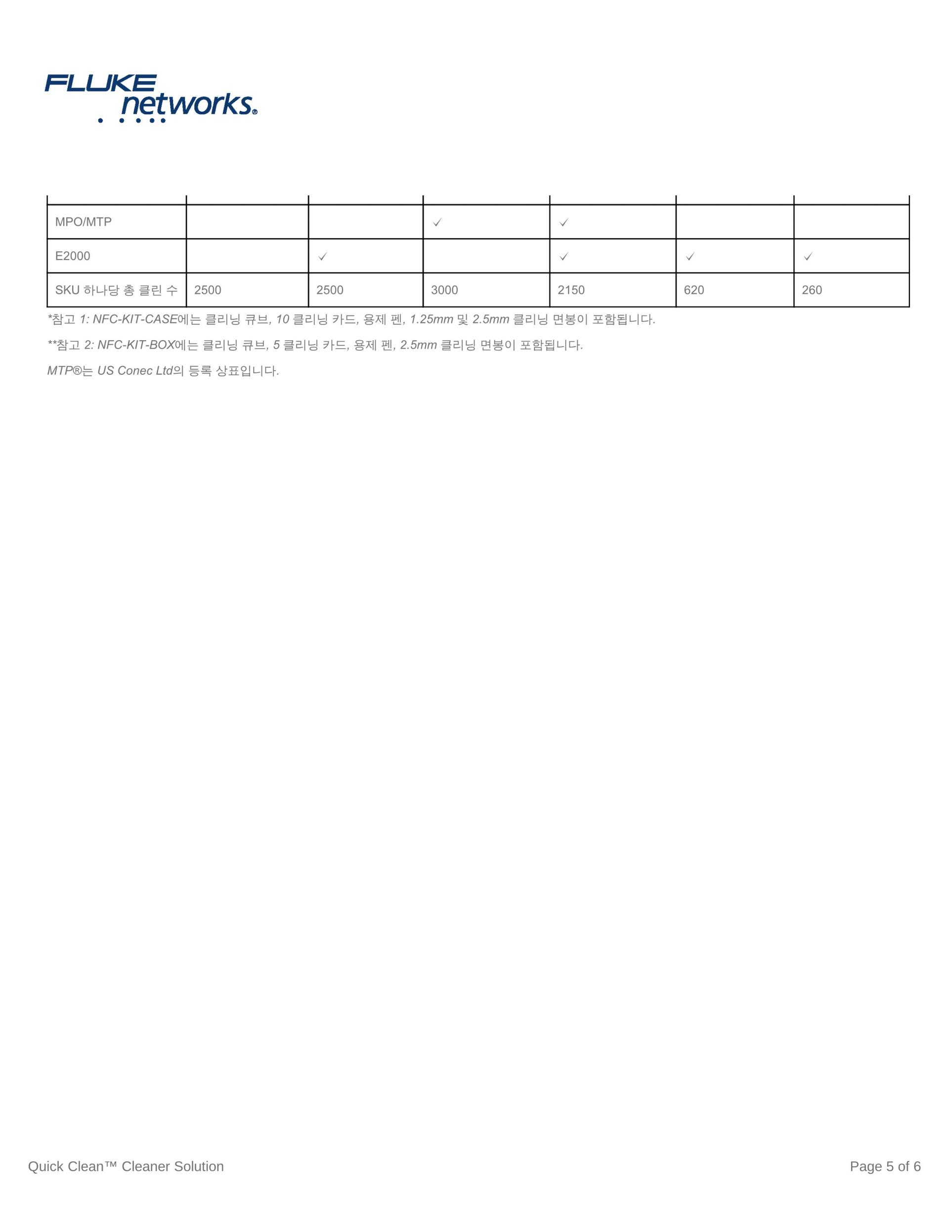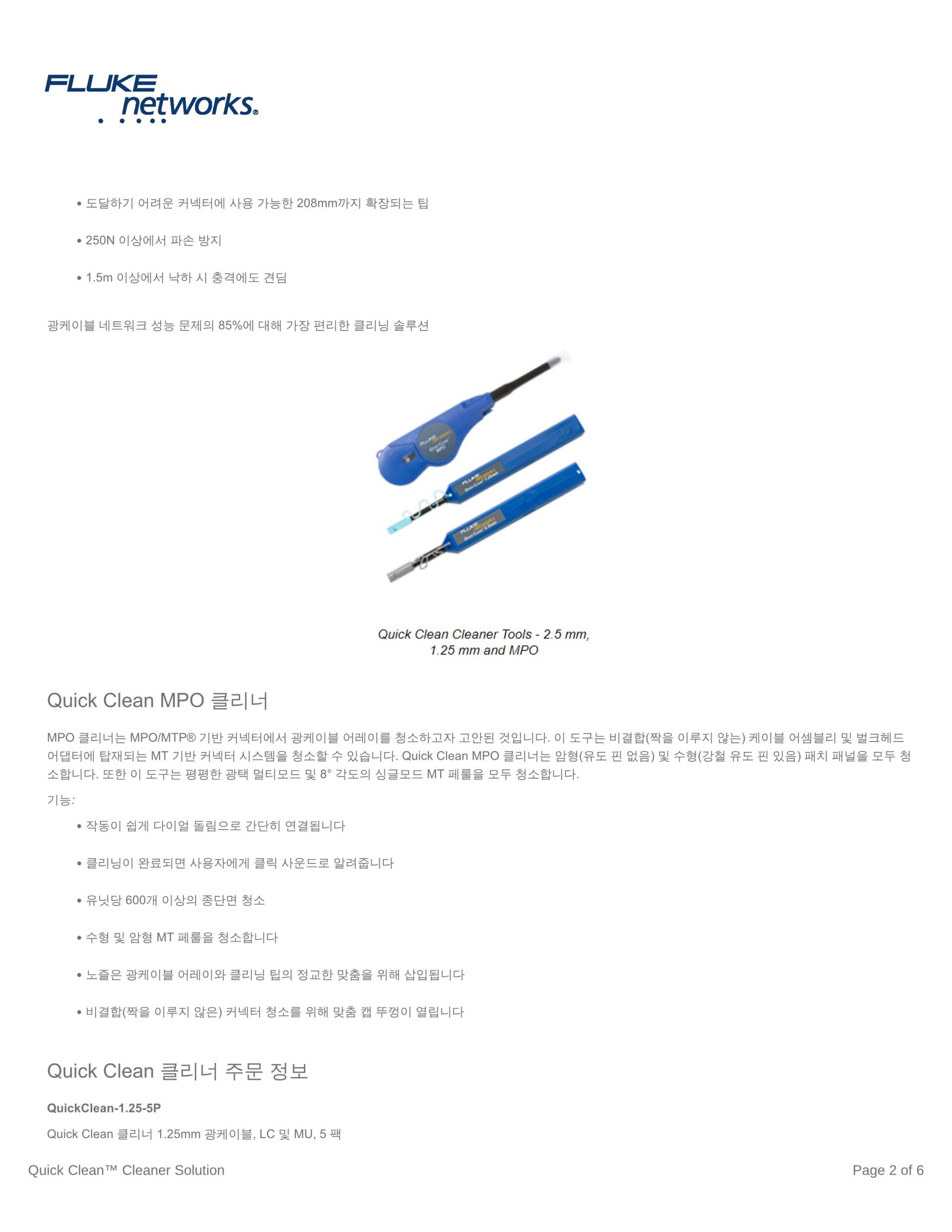 Fluke Networks의 Fiber Optic Cleaning Kit는 모든 광케이블 네트워크에 있는 가장 제거하기 힘든 오염 물질을 효과적으로 제거하는 최상의 광케이블 청소용 툴로 구성됩니다. 다양한 키트 옵션과 함께, 사용하기 쉬운 Quick Clean™ Cleaner와 편리한 청소용 큐브/카드 및 최고의 광케이블 용제 펜 중에서 선택하여 패치 코드 및 포트 내의 광케이블 단면 모두를 청소할 수 있습니다. 8종의 모든 광케이블 청소용 키트는 린트를 생성하지 않는 제품과 소재로 구성되어, 최적의 건식 및 습식 청소를 가능하게 합니다.