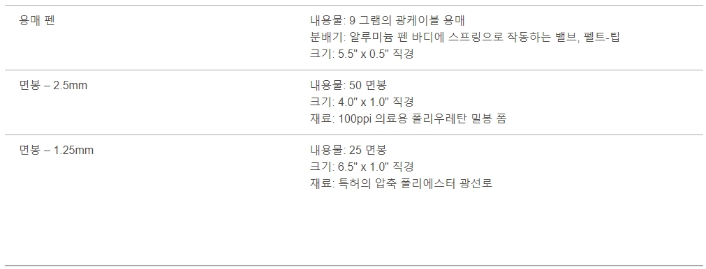 - 구매하는 키트에 따라 다양한 종류의 Quick Clean 청소용 툴이 포함되어 있습니다. 각 제품은 린트를 생성하지 않는 독점적인 청소용 소재로 만들어져 말단면이 최대한 깨끗하게 유지됩니다.