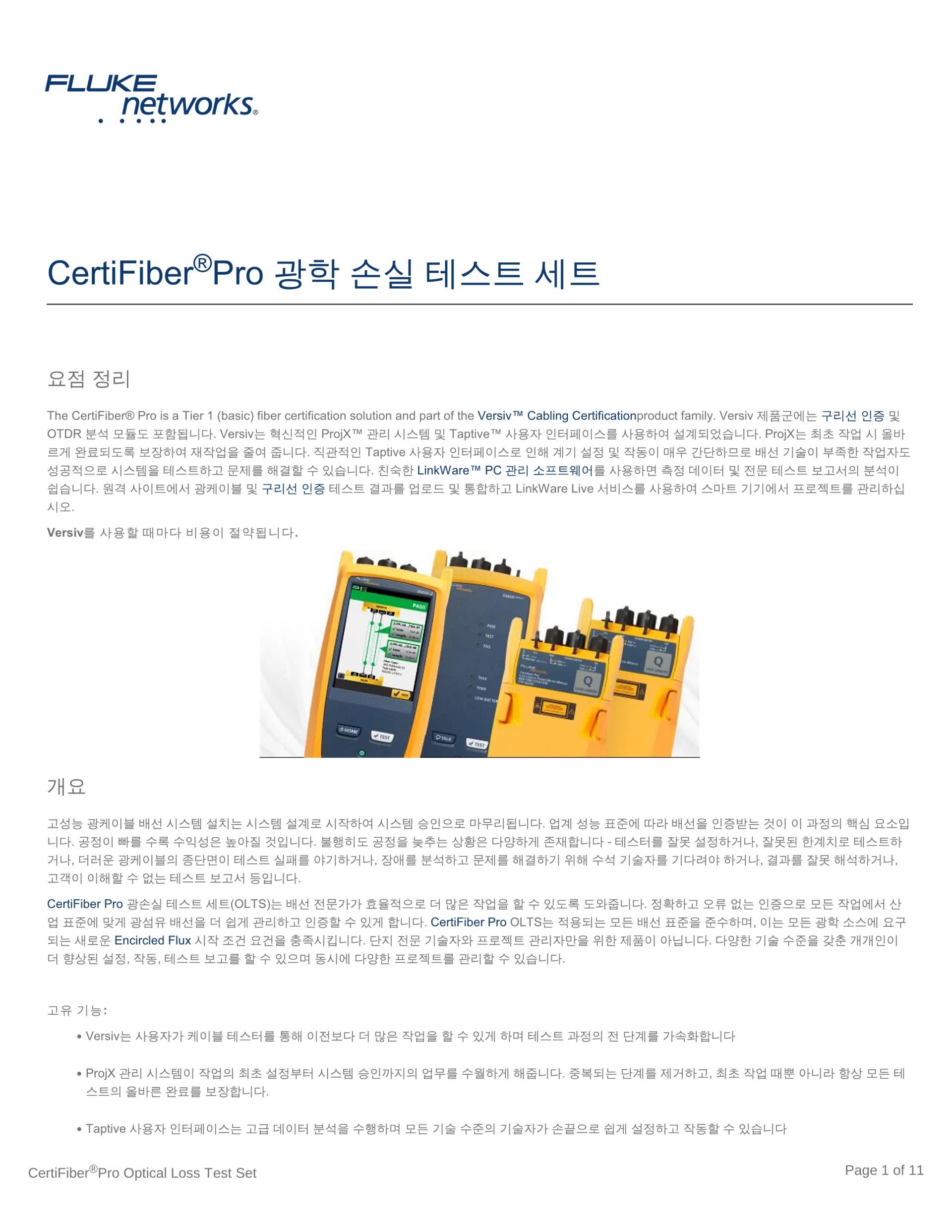 - 전체 Versiv 모델 지원: DSX CableAnalyzer 시리즈, CertiFiber Pro, OptiFiber Pro 및 FI-7000.