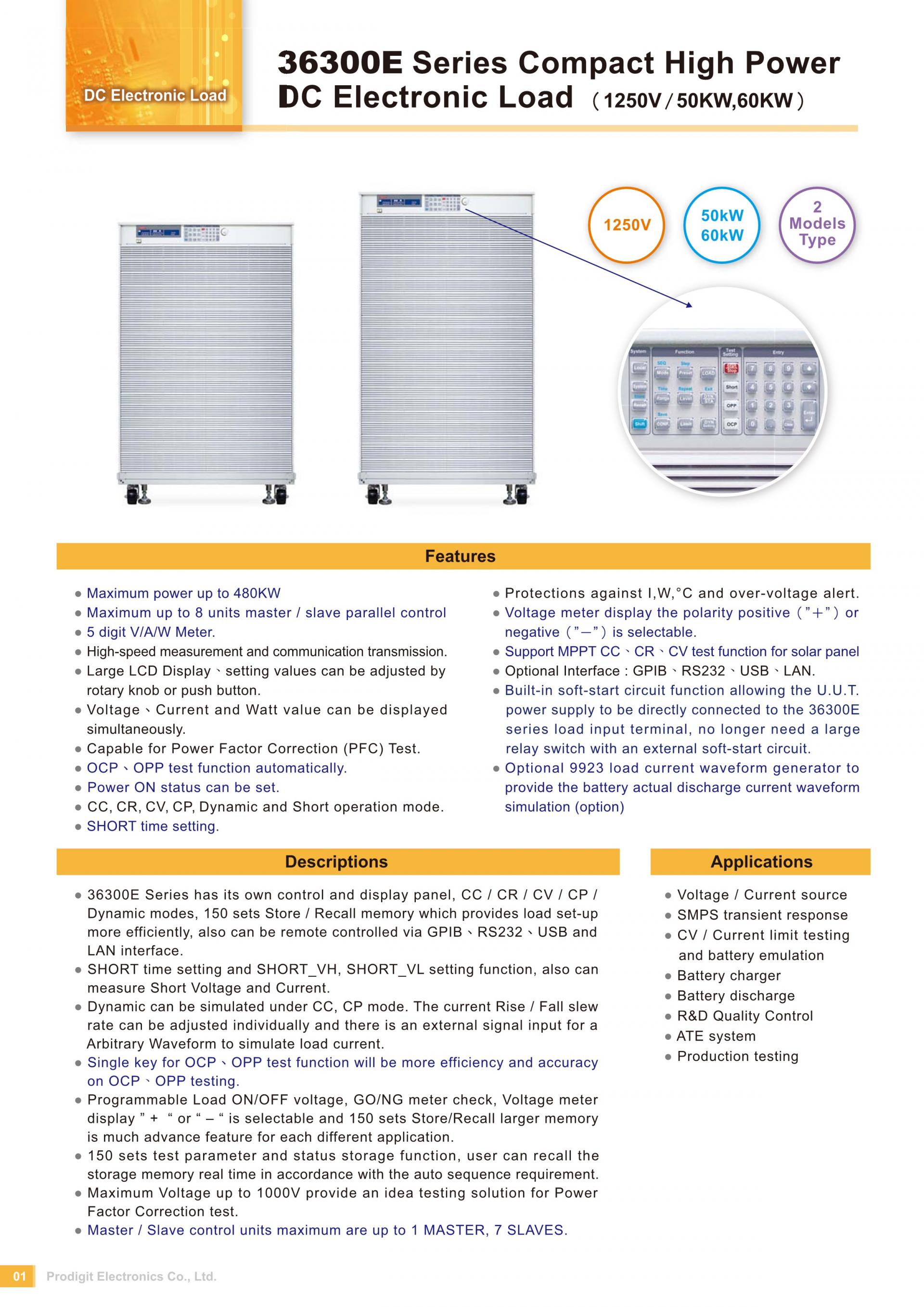 - 36300E Series has its own control and display panel, CC / CR / CV / CP / Dynamic modes, 150 sets Store / Recall memory which provides load set-up more efficiently, also can be remote controlled via GPIB、RS232、USB and LAN interface.