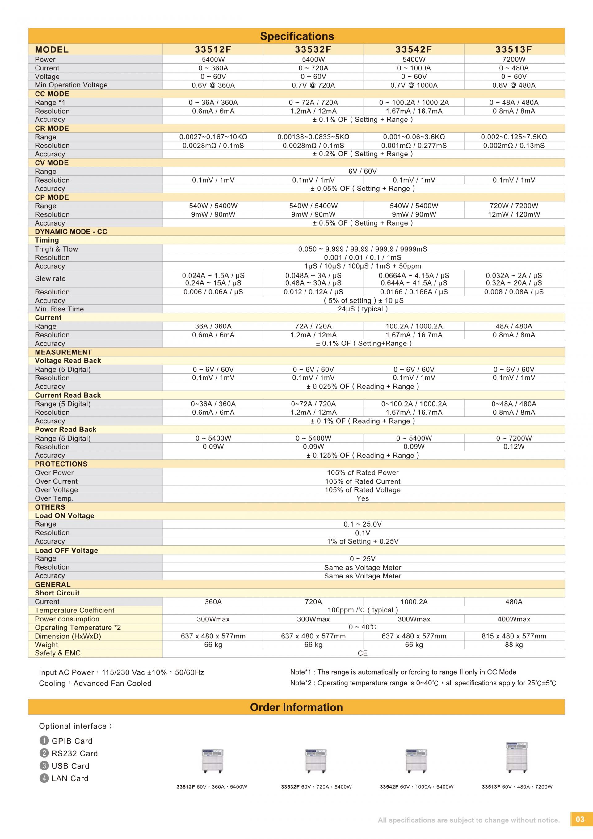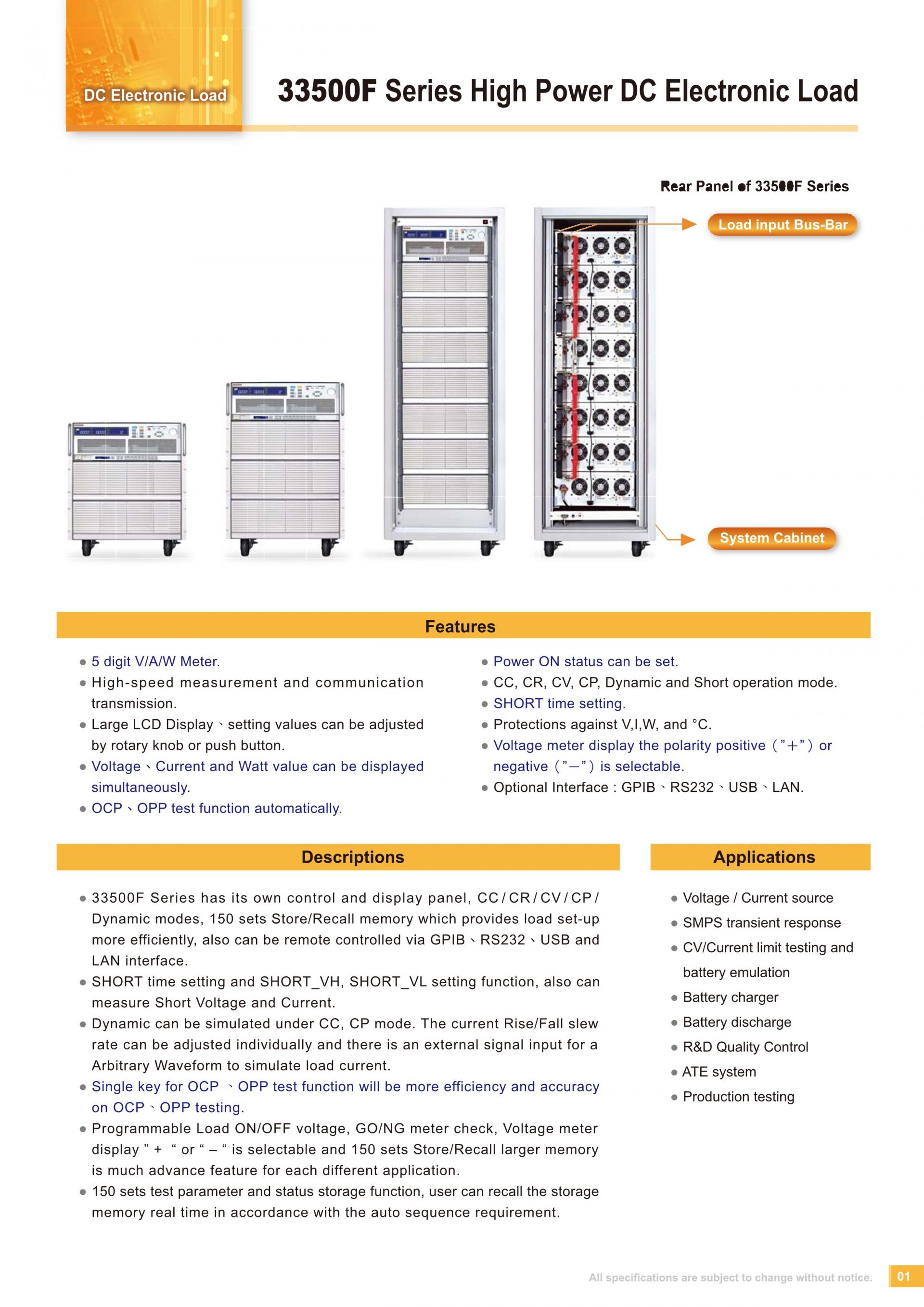 - 33500F Series has its own control and display panel, CC / CR / CV / CP / Dynamic modes, 150 sets Store/Recall memory which provides load set-up more efficiently, also can be remote controlled via GPIB、RS232、USB and LAN interface.