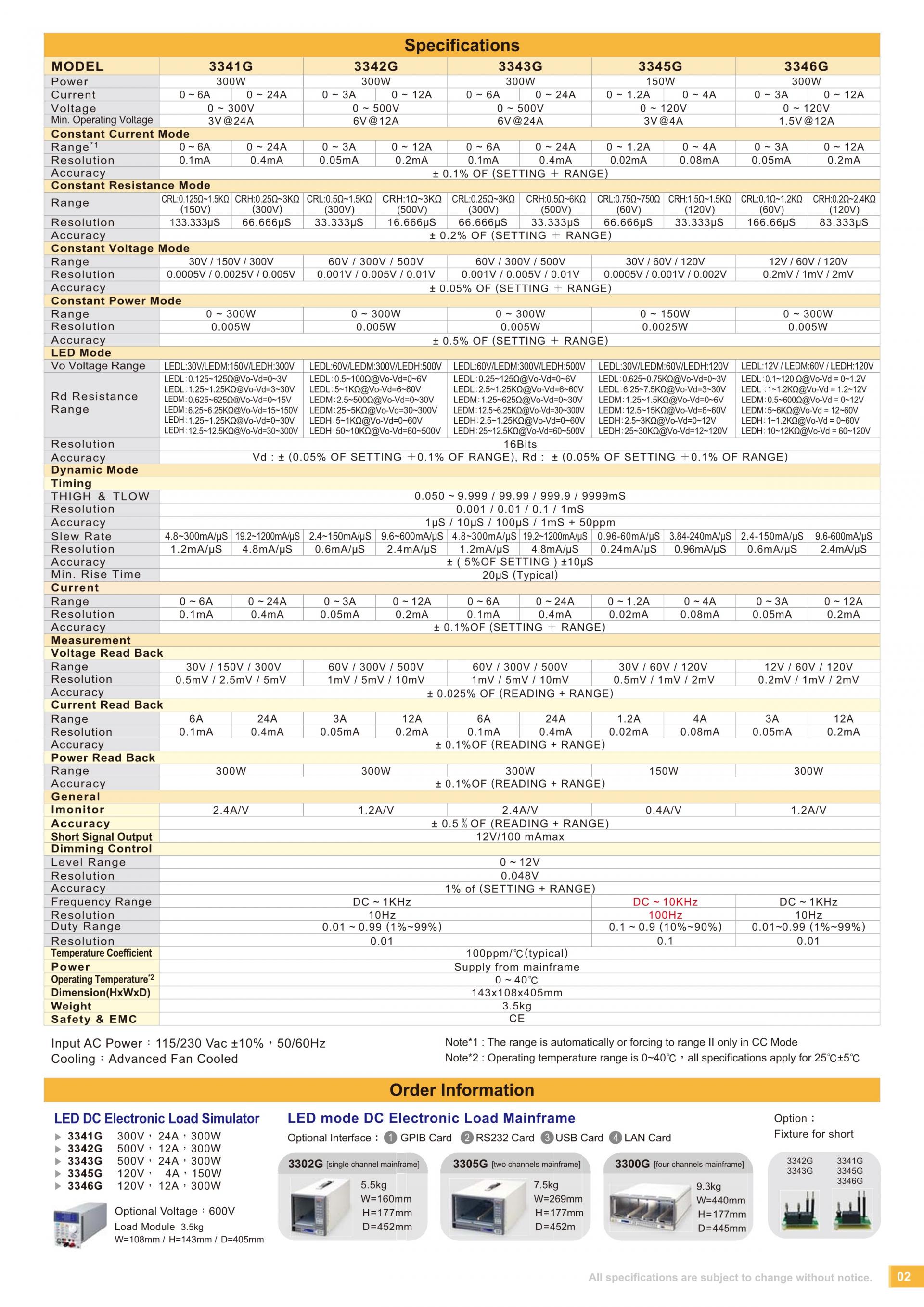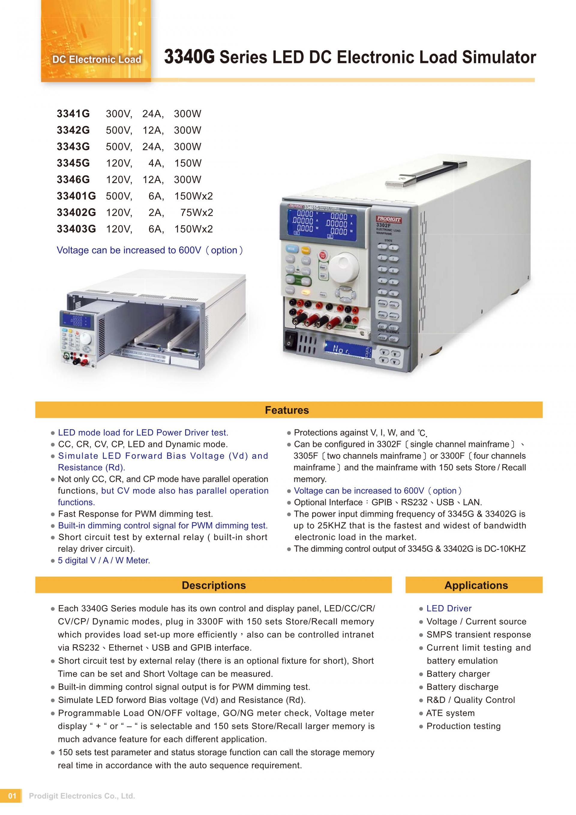 - Each 3340G Series module has its own control and display panel, LED/CC/CR/CV/CP/ Dynamic modes, plug in 3300F with 150 sets Store/Recall memory which provides load set-up more efficiently,also can be controlled intranet via RS232、Ethernet、USB and GPIB interface.