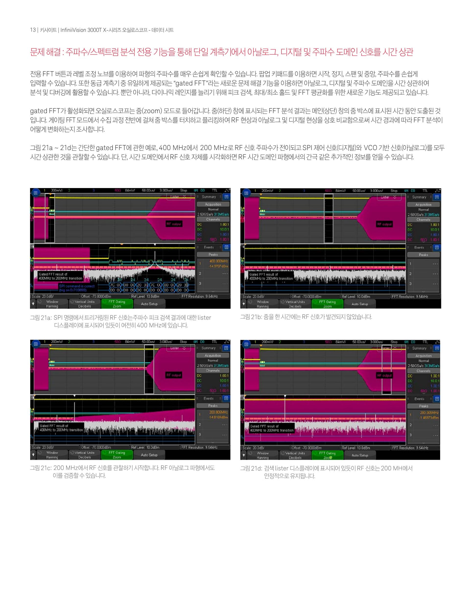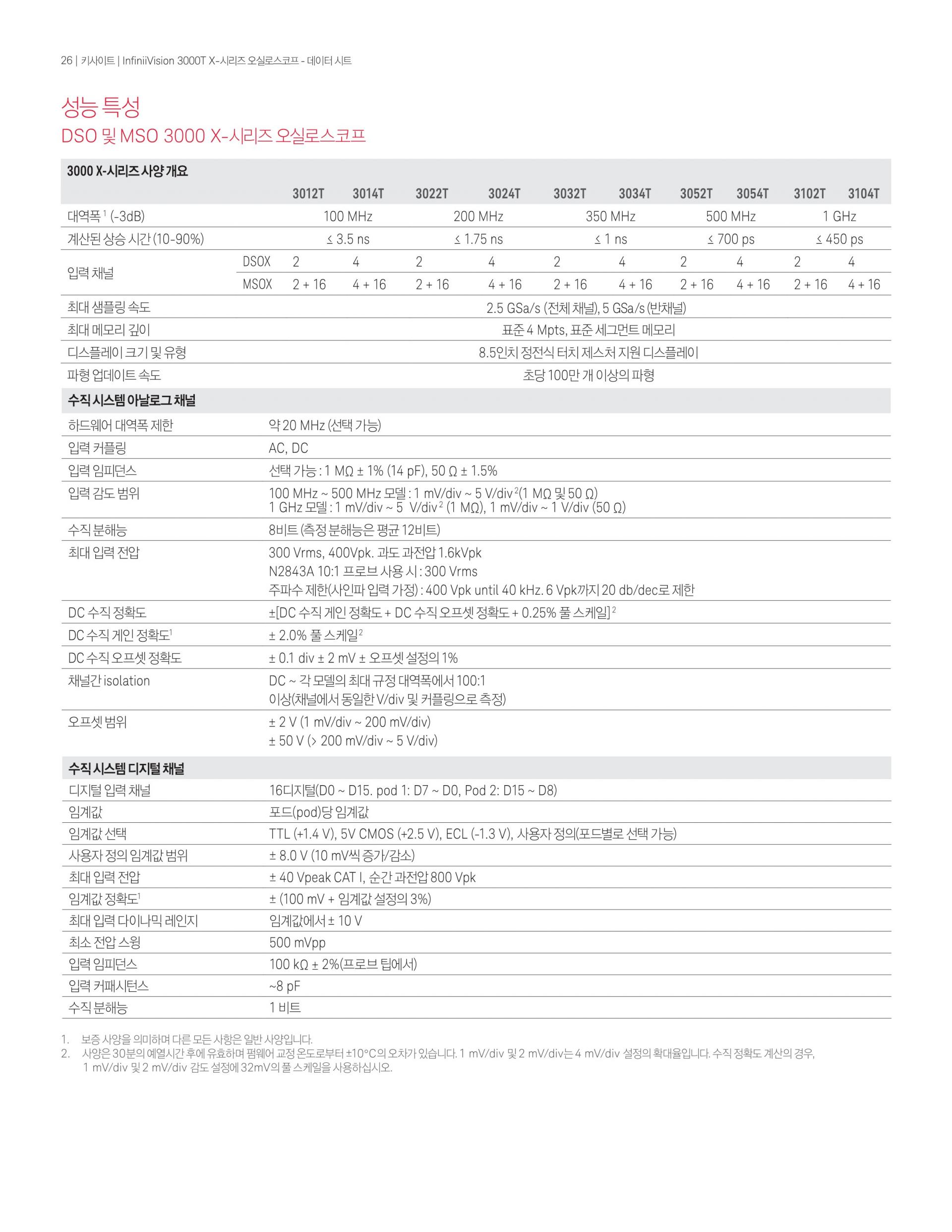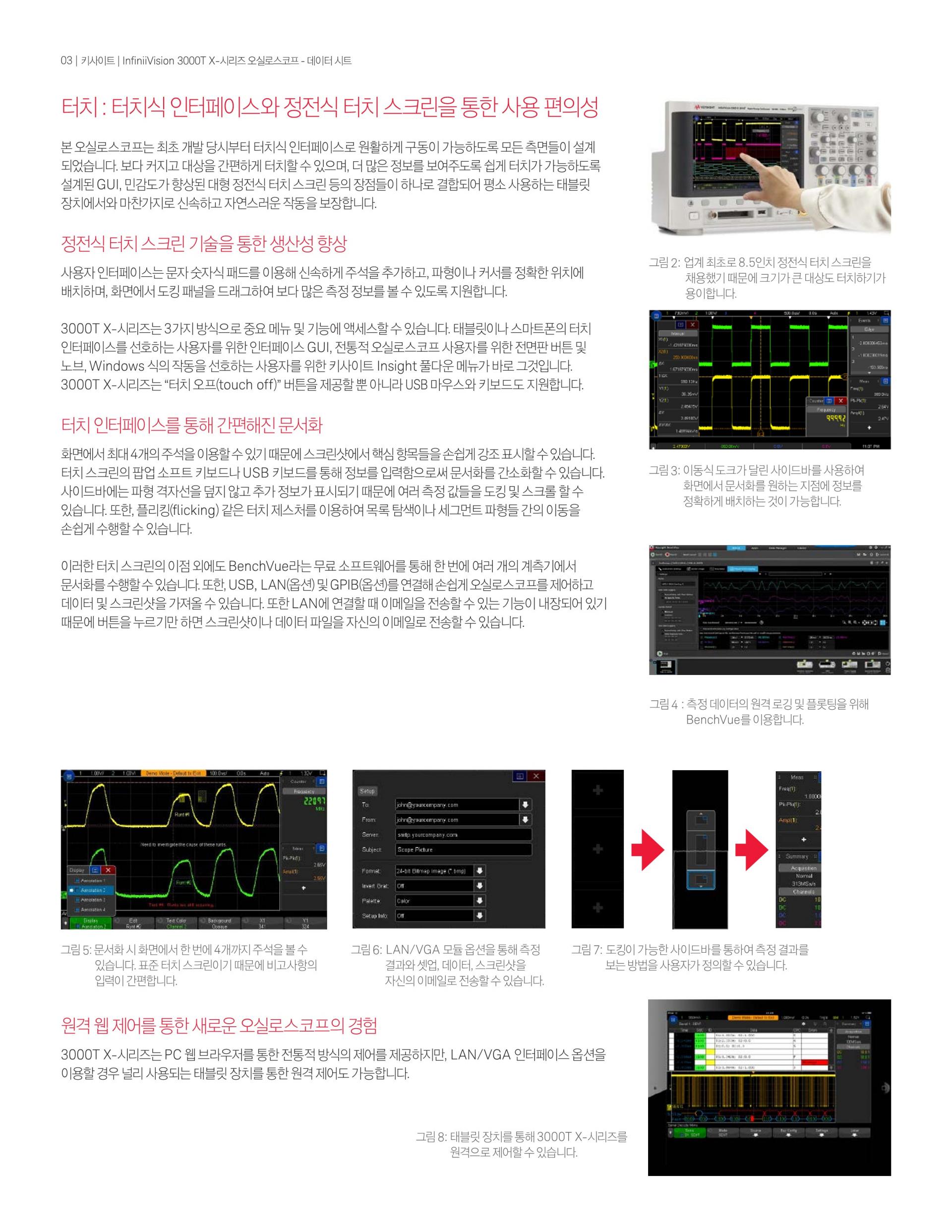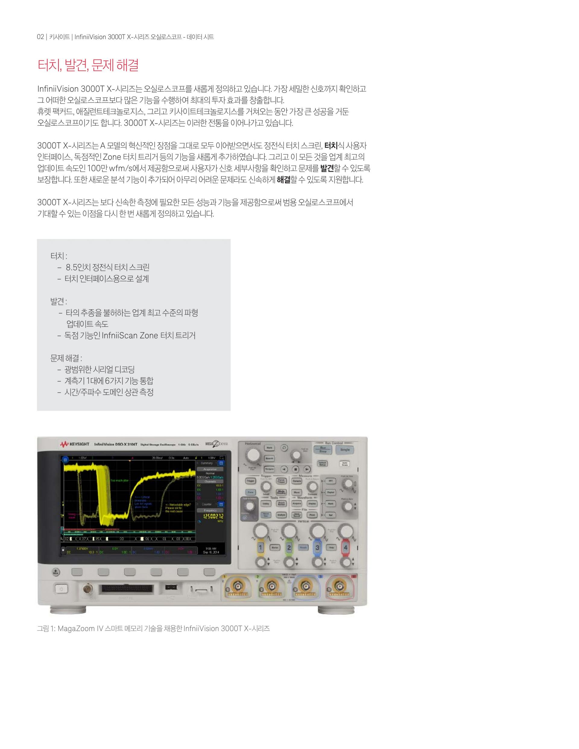- InfiniiVision 3000T X-시리즈1GHz 오실로스코프는 4개의 아날로그 채널, 4Mpts 메모리, 초당 1백만 개의 파형 업데이트 속도 및 8.5인치 정전식 터치 스크린의 표준 터치 zone trigger를 제공한다.