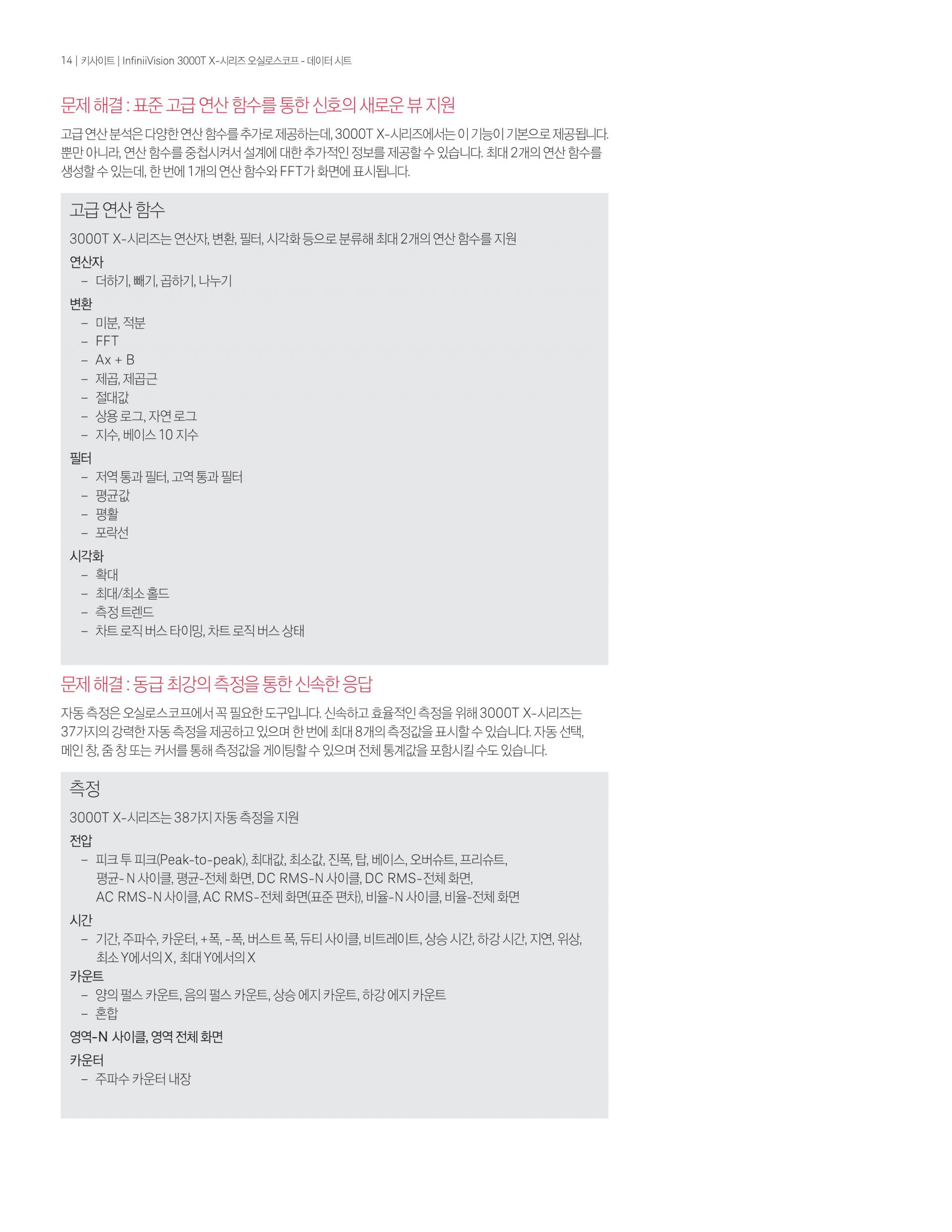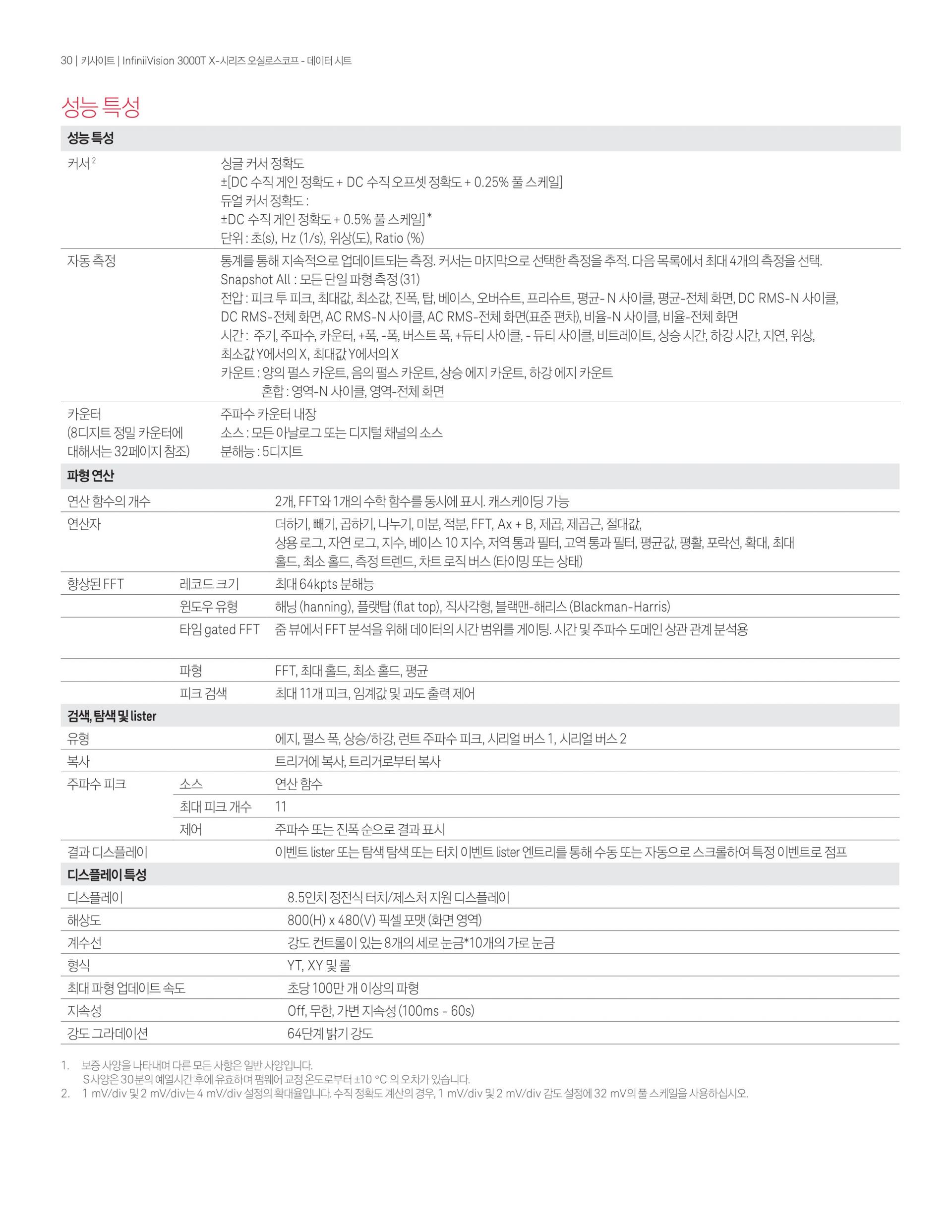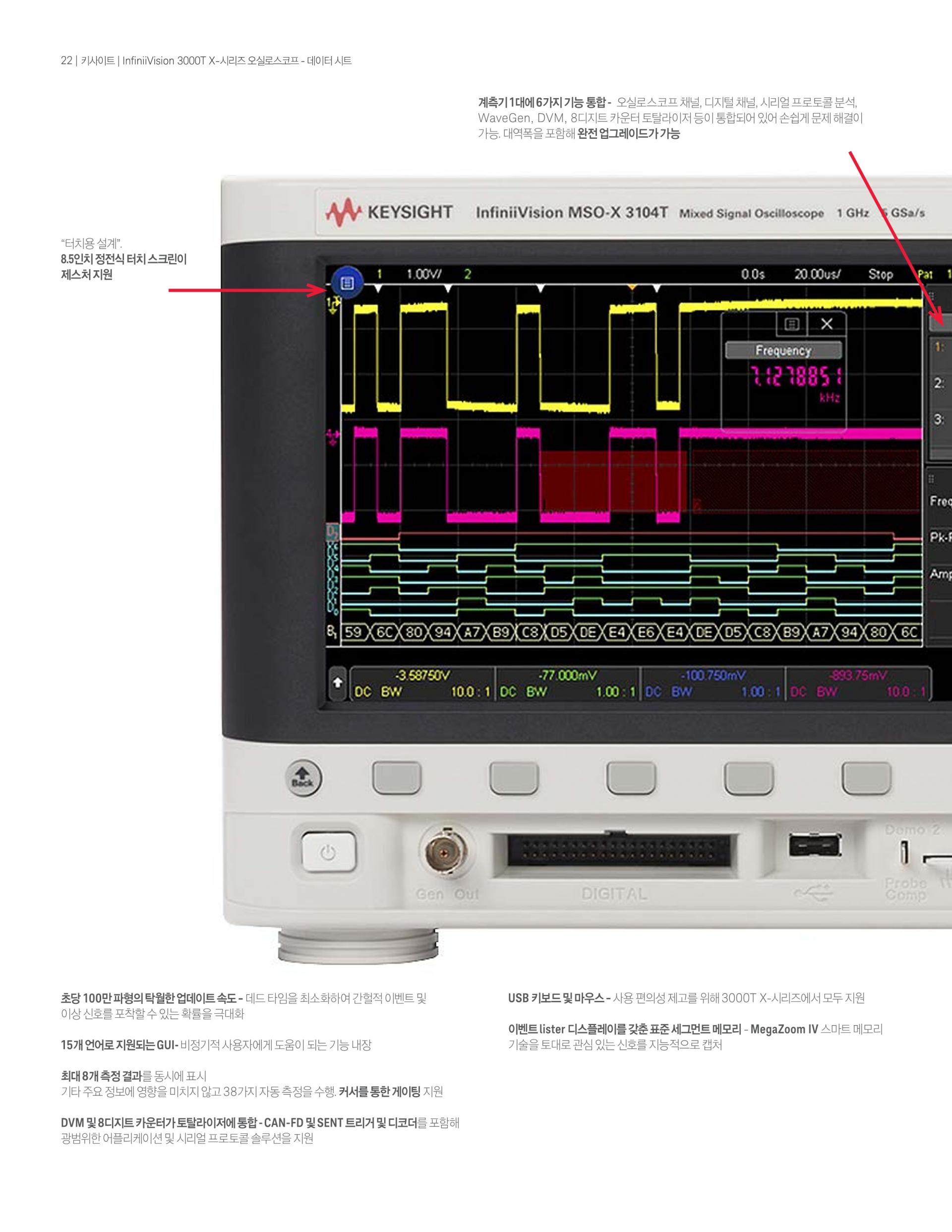 - InfiniiVision 3000T X-시리즈 500MHz 오실로스코프는 2개의 아날로그 채널, 4Mpts 메모리, 초당 1백만 개의 파형 업데이트 속도 및 8.5인치 정전식 터치 스크린의 표준 터치 zone trigger를 제공한다.