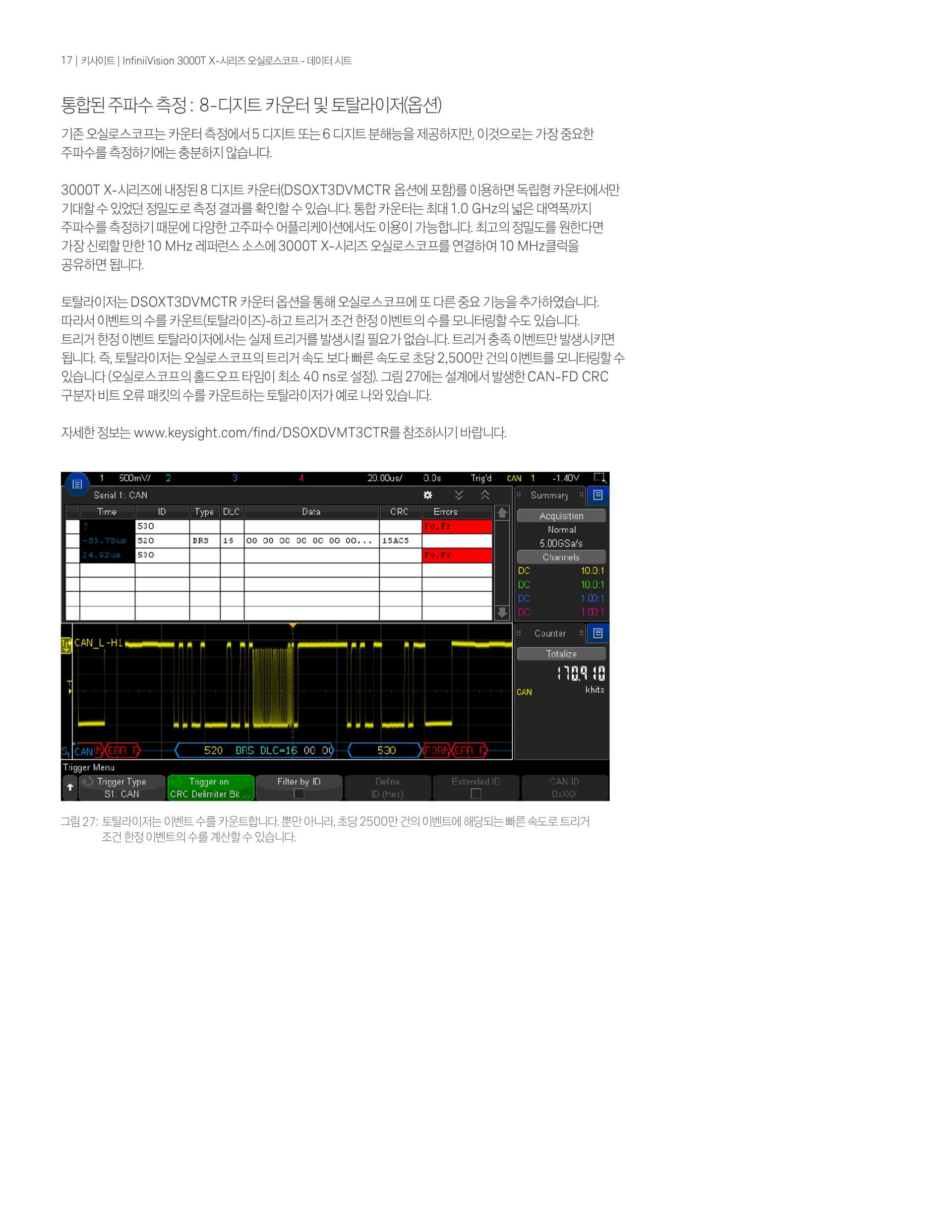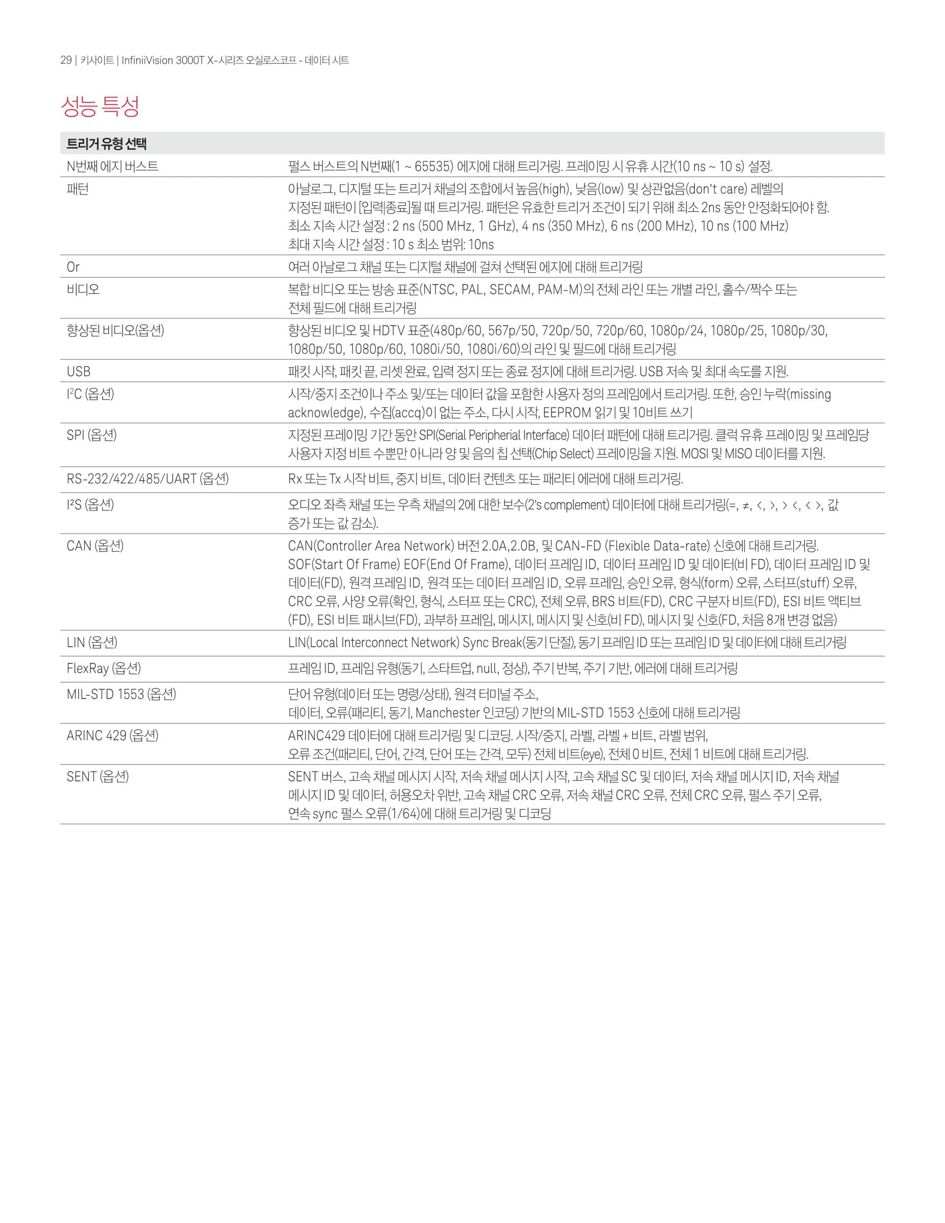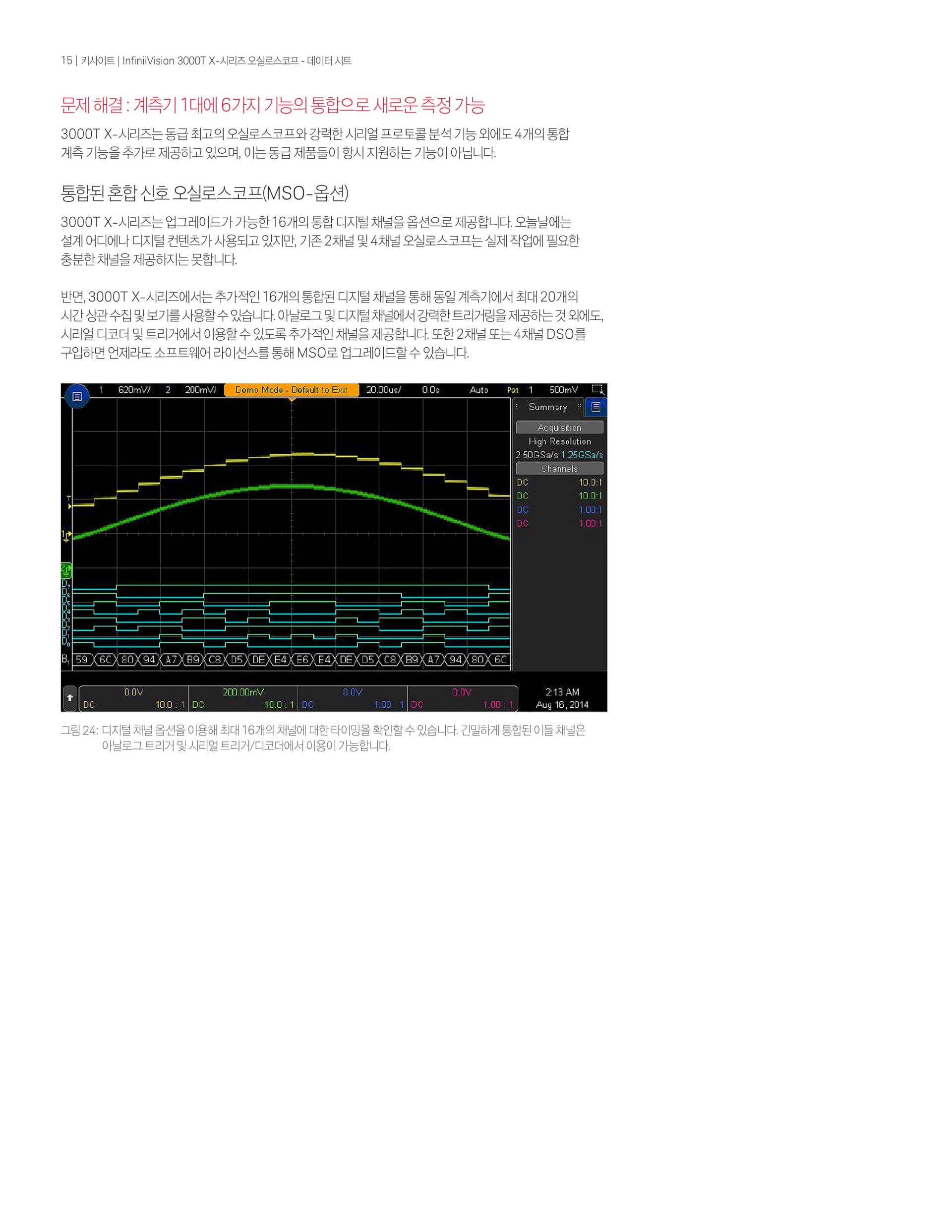 - InfiniiVision 3000T X-시리즈 500MHz 오실로스코프는 2개의 아날로그 채널, 4Mpts 메모리, 초당 1백만 개의 파형 업데이트 속도 및 8.5인치 정전식 터치 스크린의 표준 터치 zone trigger를 제공한다.