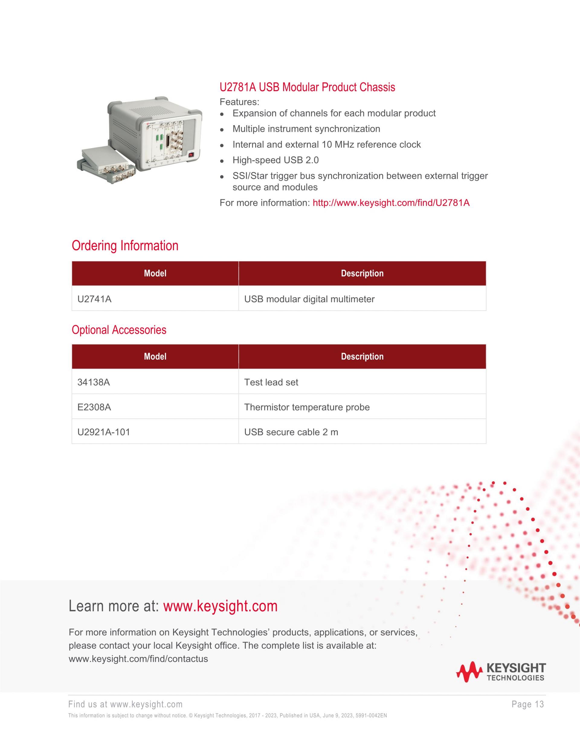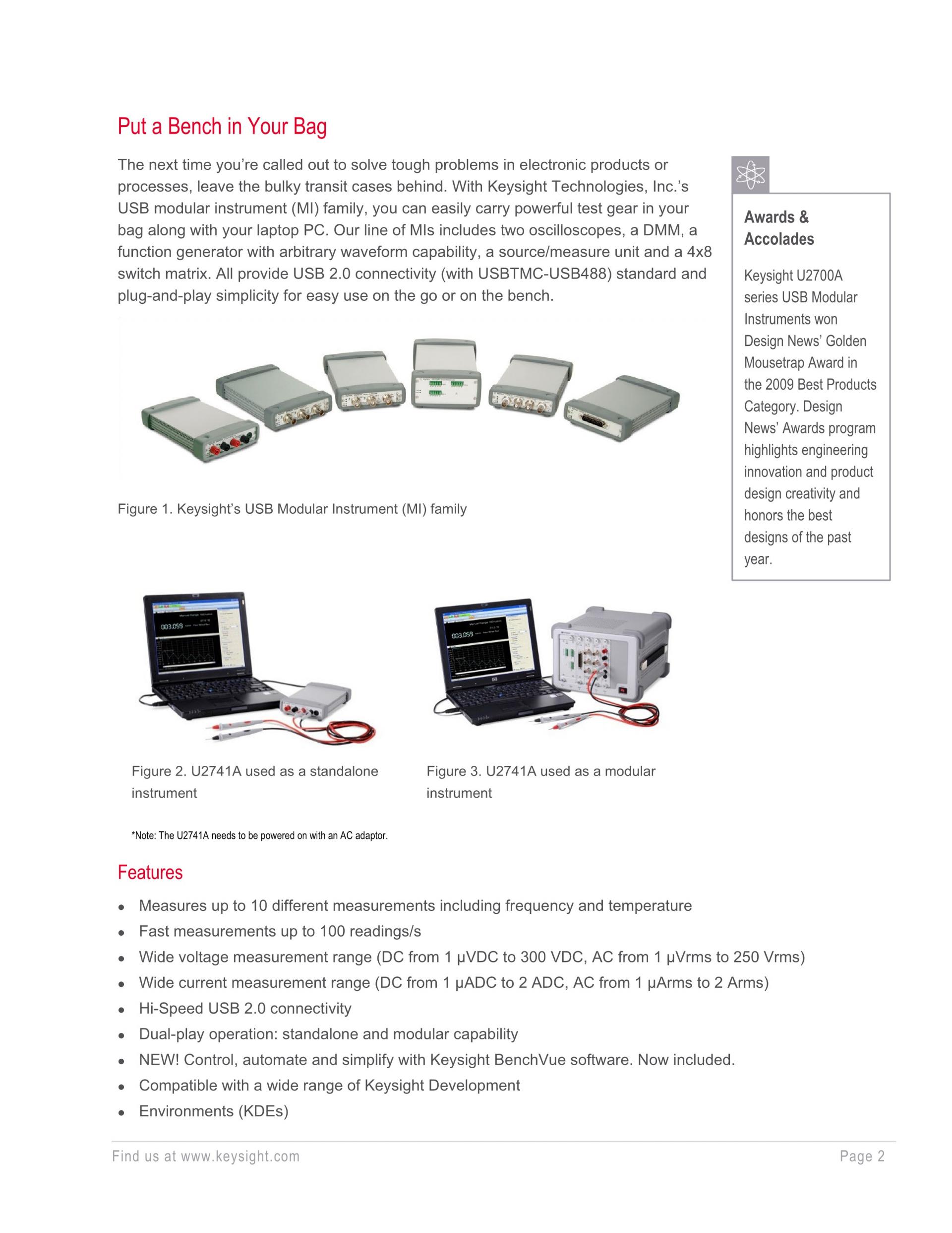 The Keysight U2741A USB multimeter flexibly operates as a standalone unit or as a modular unit in the U2781A modular product chassis. This notebook-sized USB digital multimeter (DMM) lets you carry powerful test gear in your bag along with your laptop PC.