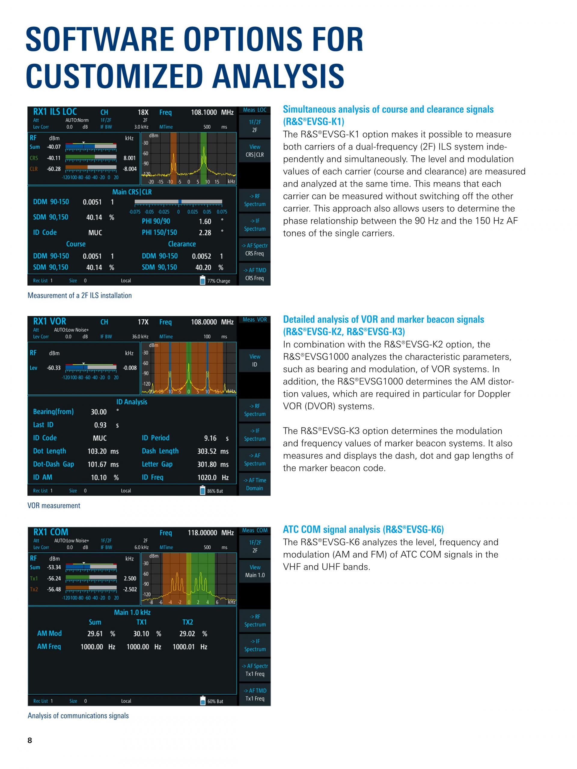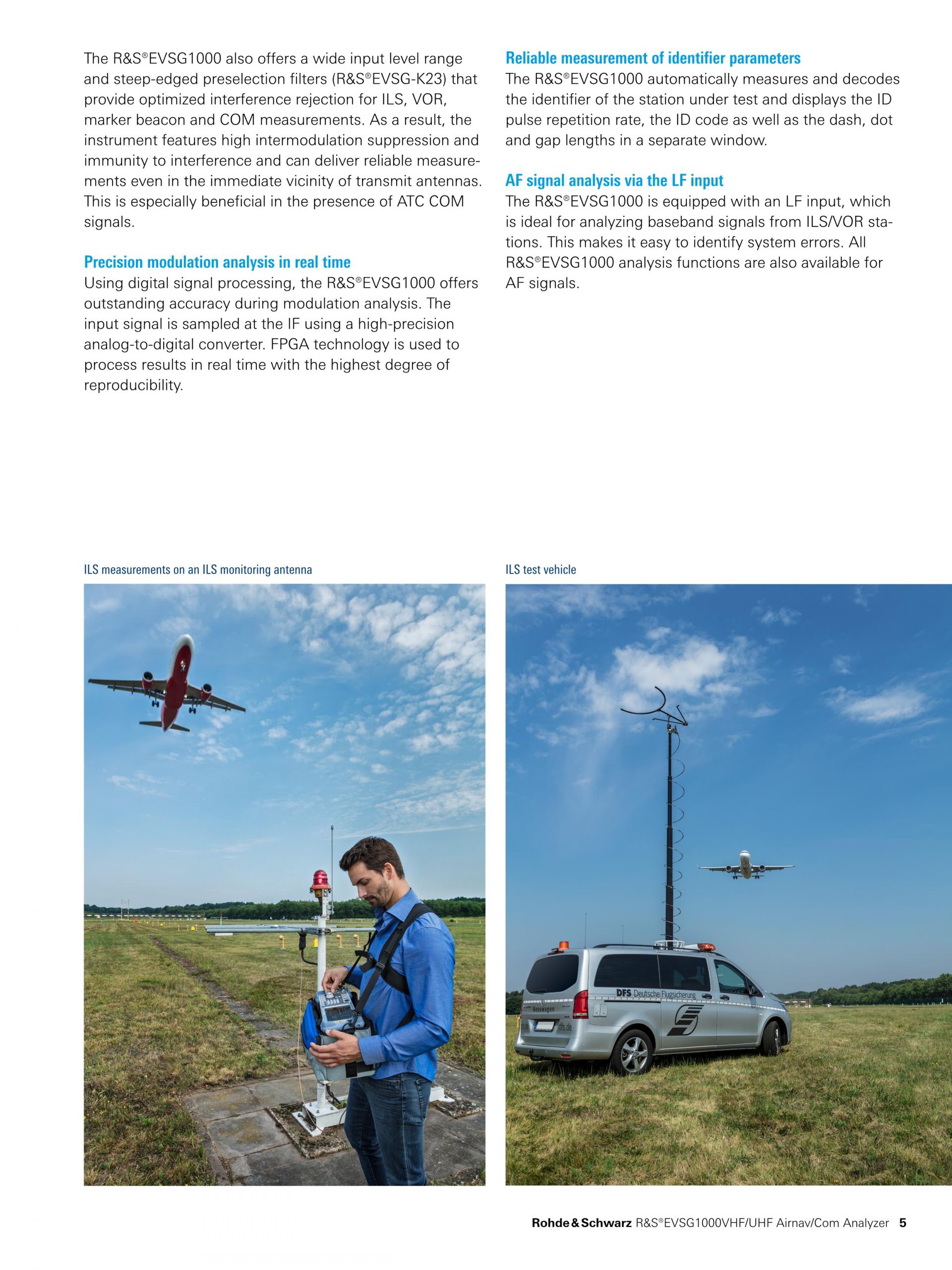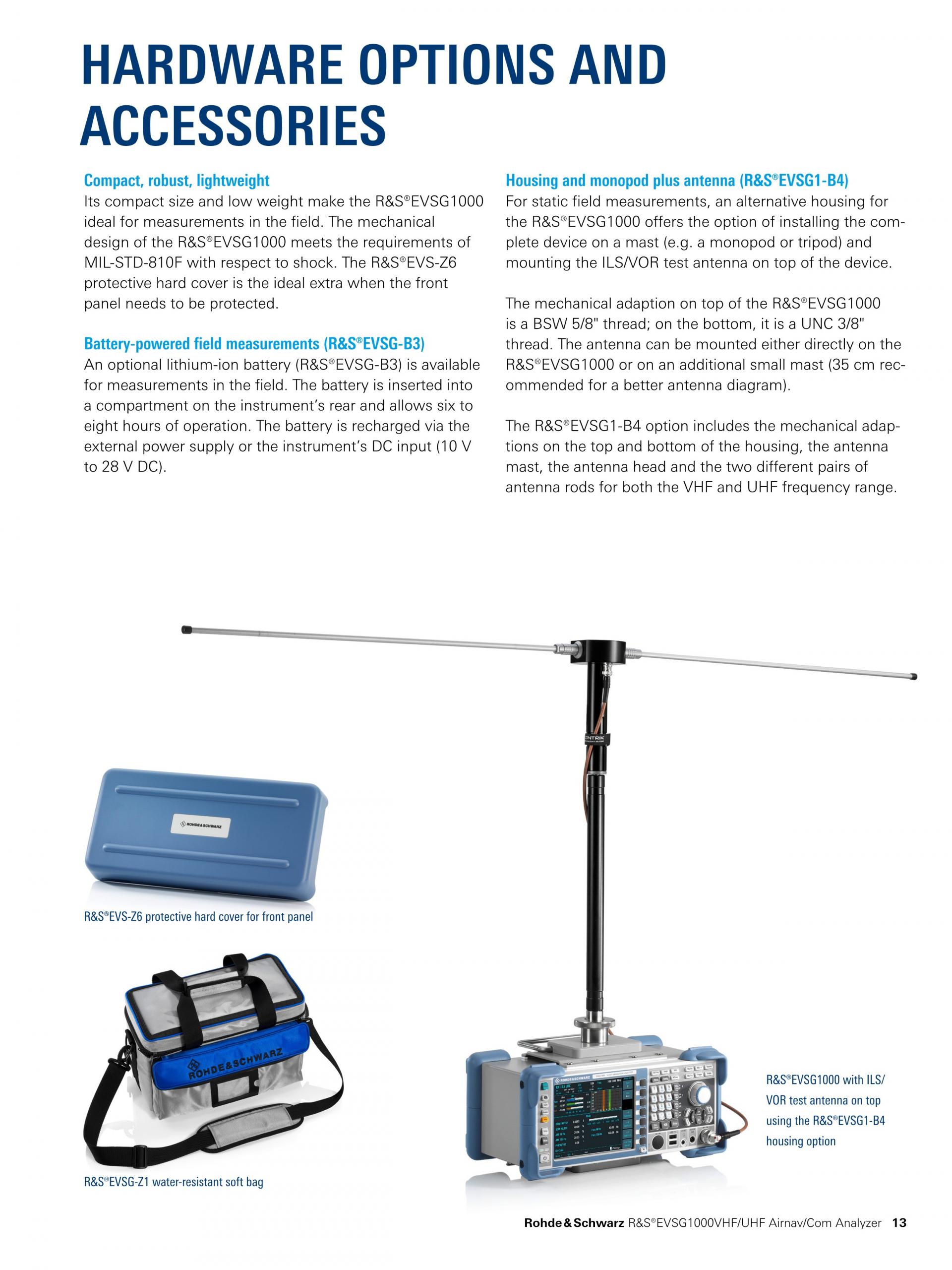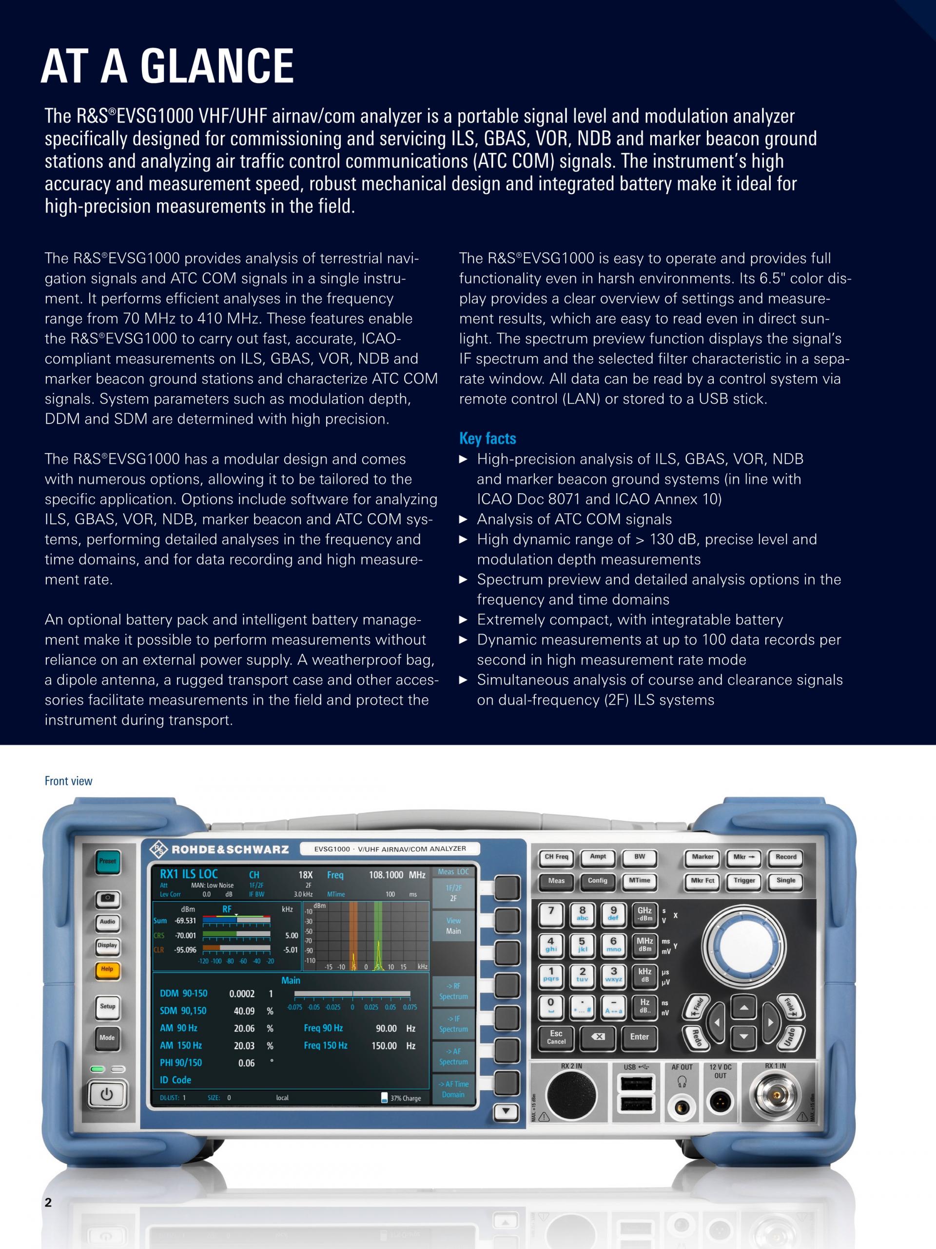 R&S®EVSG1000은 시운전과 ILS, VOL, 마커 비컨 지상국 지원 및 ATC COM 신호 분석을 위해 특수 설계된 휴대형 신호 레벨 및 변조 분석기입니다. 뛰어난 정확도와 측정 속도, 견고한 기계적 설계, 일체형 배터리를 제공하는 이 기기는 현장에서 고정밀 측정을 수행하는 데 적합합니다.
