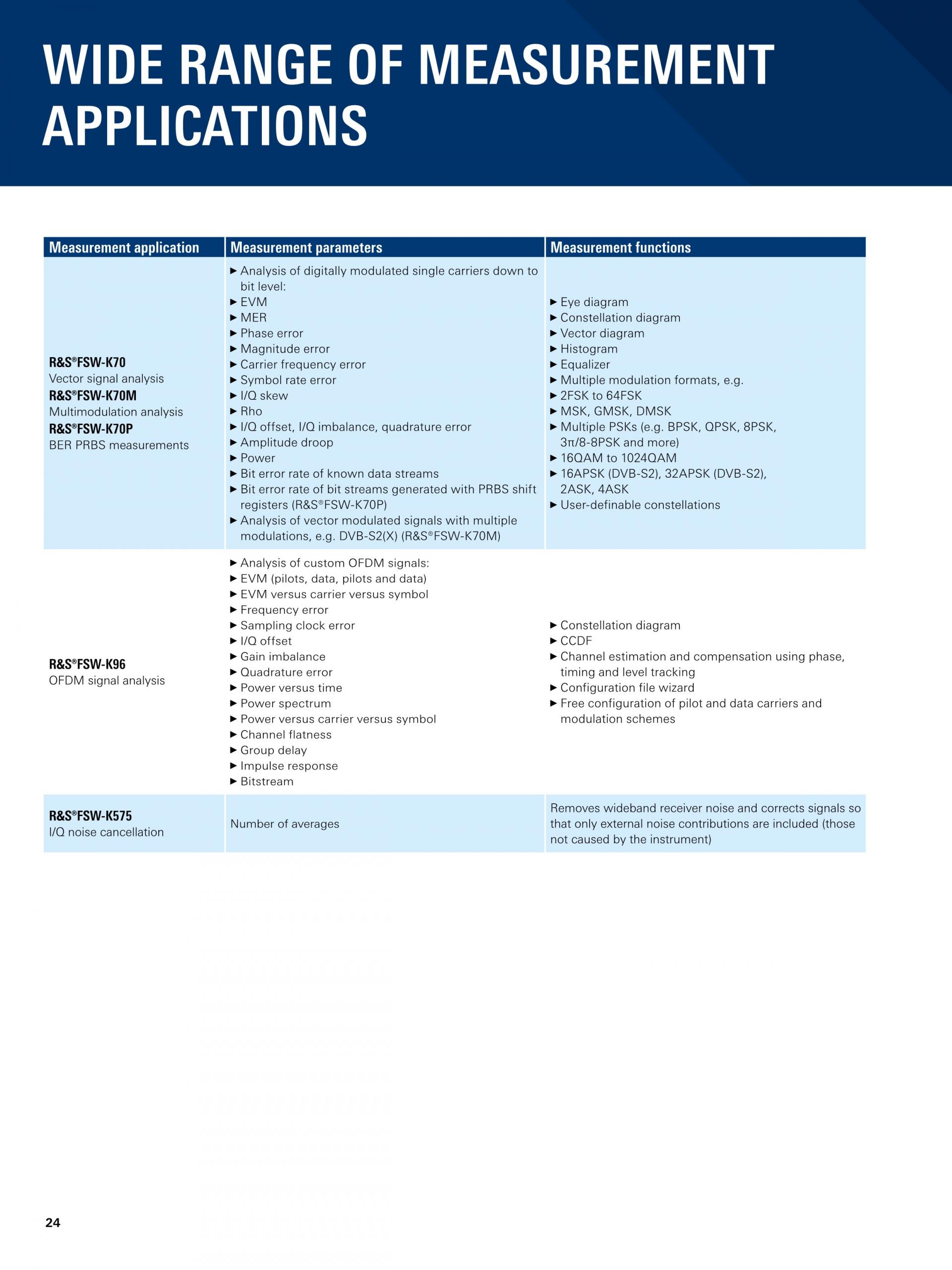 R&S®FSW-K70 Vector Signal Analysis 옵션을 사용하면 디지털 방식으로 변조된 단일 신호를 비트 수준까지 유연하게 분석할 수 있습니다. 다양한 분석 툴을 활용함에도 불구하고 명확히 체계적인 작동 개념이 적용되므로 측정을 간단히 수행할 수 있습니다. R&S®FSW-K70M은 DVB-S2X 신호와 같은 두 가지 변조 체계의 신호를 분석할 수 있습니다. R&S®FSW-K70P Extension은 최대 PRBS23의 PRBS 데이터에서 Raw BER(Bit Error Rate)을 측정합니다. |