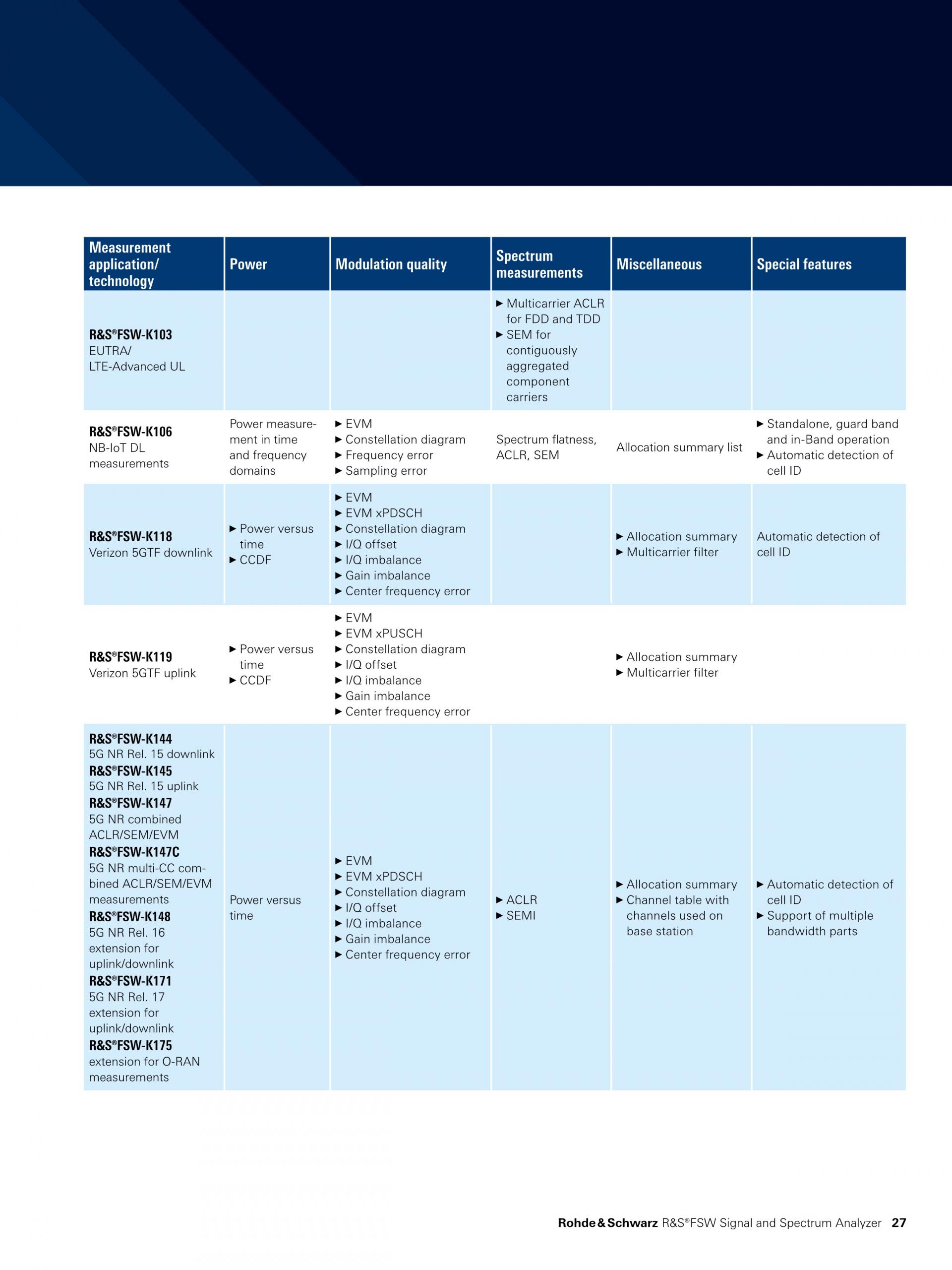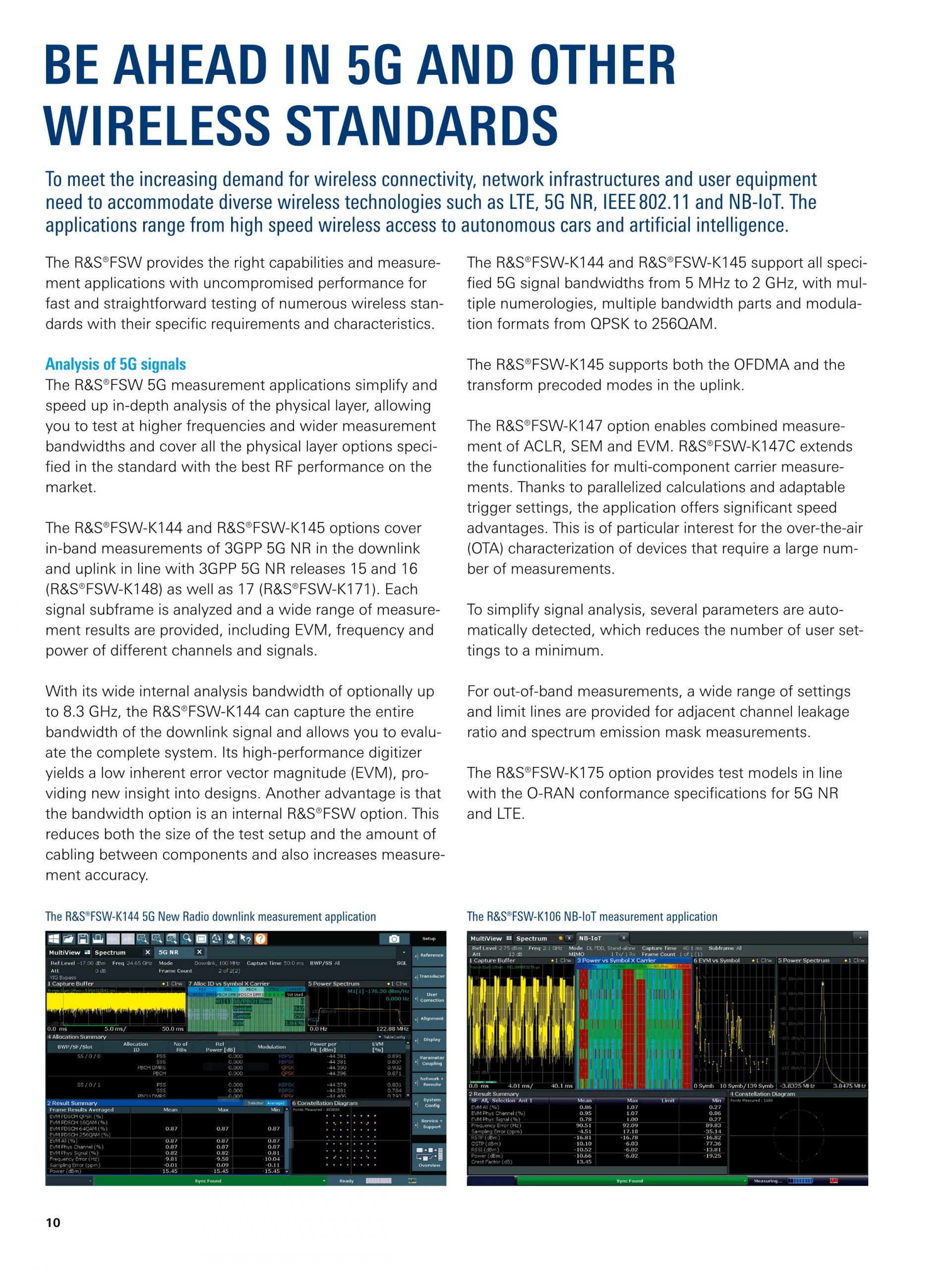 R&S®FSW는 최대 8.3 GHz까지 확장 가능한 넓은 내부 분석 대역폭으로 다운링크 신호의 전체 대역폭을 캡처하고 전체 시스템을 평가할 수 있습니다. R&S®FSW-K144 및 R&S®FSW-K145 옵션은 다운링크 및 업링크에서 3GPP 5G NR의 대역 내 측정을 지원합니다. 각 신호 서브프레임을 분석하고, EVM, 주파수 및 다양한 채널과 신호의 파워와 같은 다양한 측정 결과를 제공합니다. |