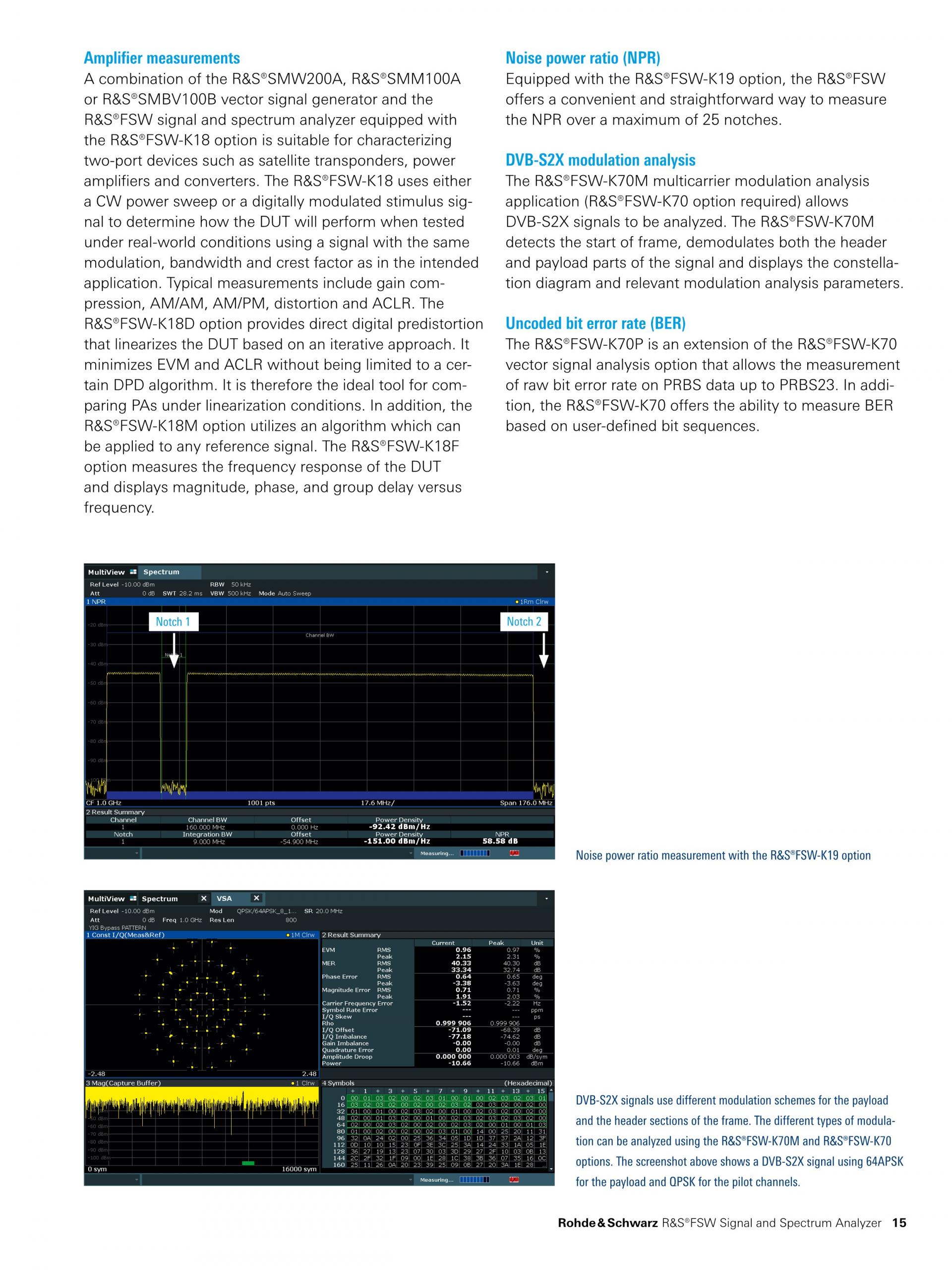 R&S®FSW는 그룹 딜레이, 선형성, 게인 전송, NPR(Noise Power Ratio) 등의 가장 중요한 측정에 대해 전용 측정 애플리케이션을 제공합니다. 또한 DVB-S2X, OneWeb 등의 여러 표준에 대한 위성 RF 신호를 복조합니다. R&S®FSW의 확장 가능한 넓은 분석 대역폭(최대 8.3 GHz)은 넓은 신호 대역폭에 대해 증가하는 수요를 충족합니다. |