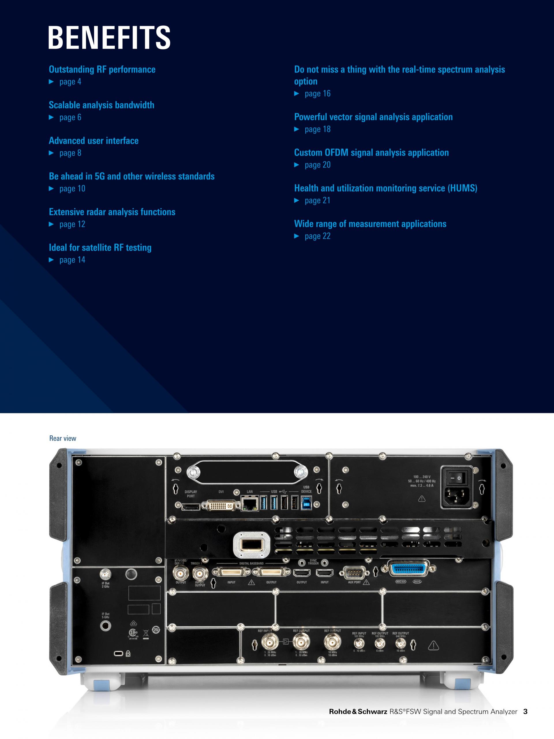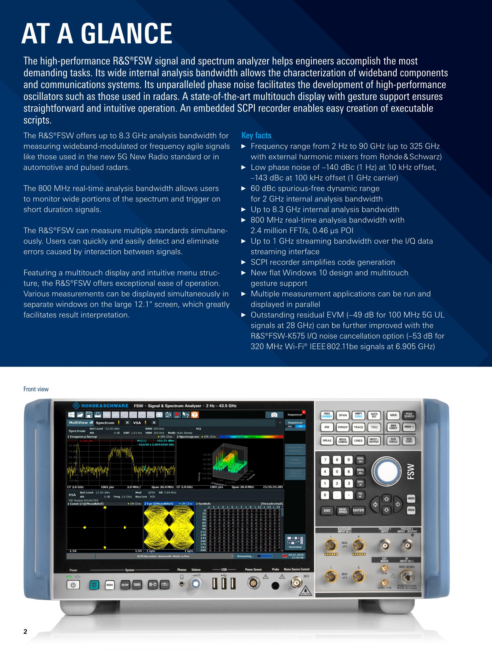 R&S®FSW Signal and Spectrum Analyzer는 복잡한 RF 측정 작업을 완수하기 위한 고성능 필수 측정 장비입니다. 이 분석기는 넓은 내부 분석 대역폭으로 Wideband 컴포넌트와 통신 시스템의 특성을 분석할 수 있습니다. 뛰어난 위상 노이즈 측정 성능으로 레이더 용도의 고성능 오실레이터 개발과 같은 업무를 더욱 효율적으로 진행할 수 있습니다.