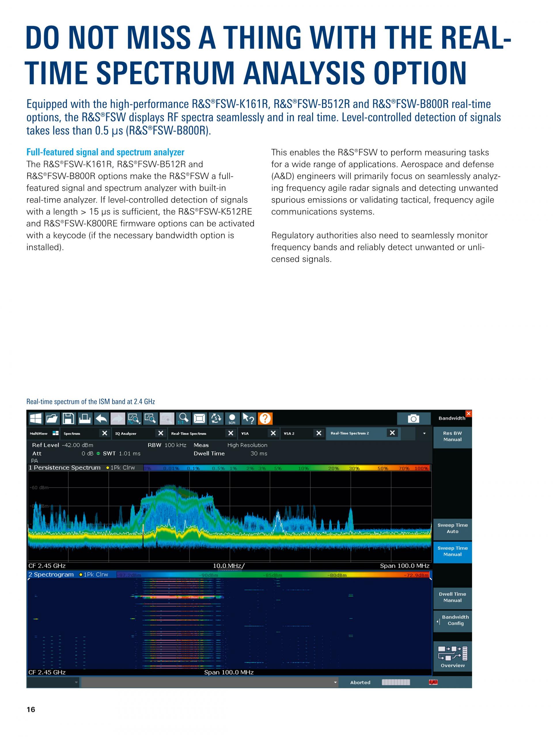 2.4GHz에서의 ISM 대역 실시간 스펙트럼 동일 주파수 대역(예: WLAN, Bluetooth®)에서 작동하는 다른 표준의 신호를 분석하고 충돌을 방지합니다. |