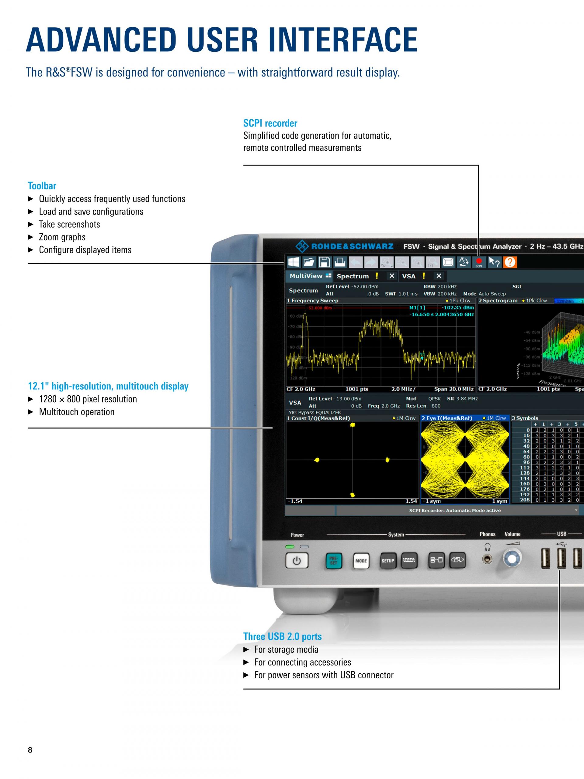 편리한 사용자 인터페이스 12.1" 고해상도, 멀티터치 디스플레이 등의 고급 R&S®FSW. |