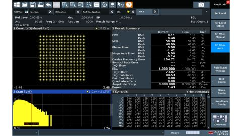1024QAM 변조 신호 분석 Constellation diagram, result table, symbol table and EVM distribution. |