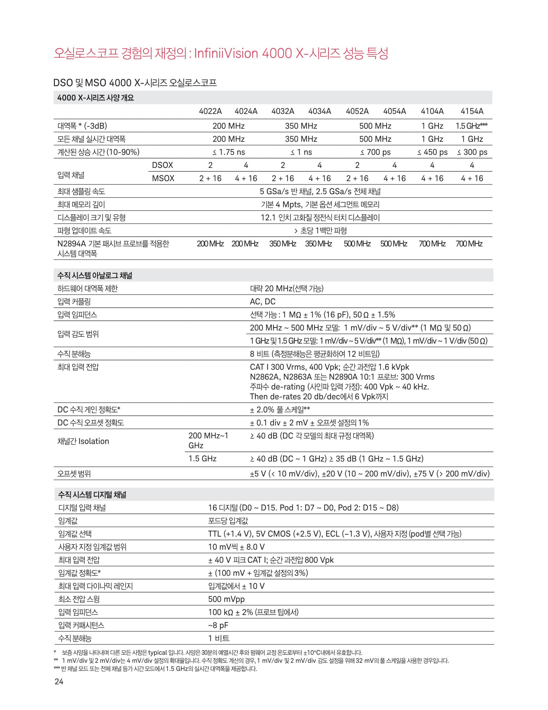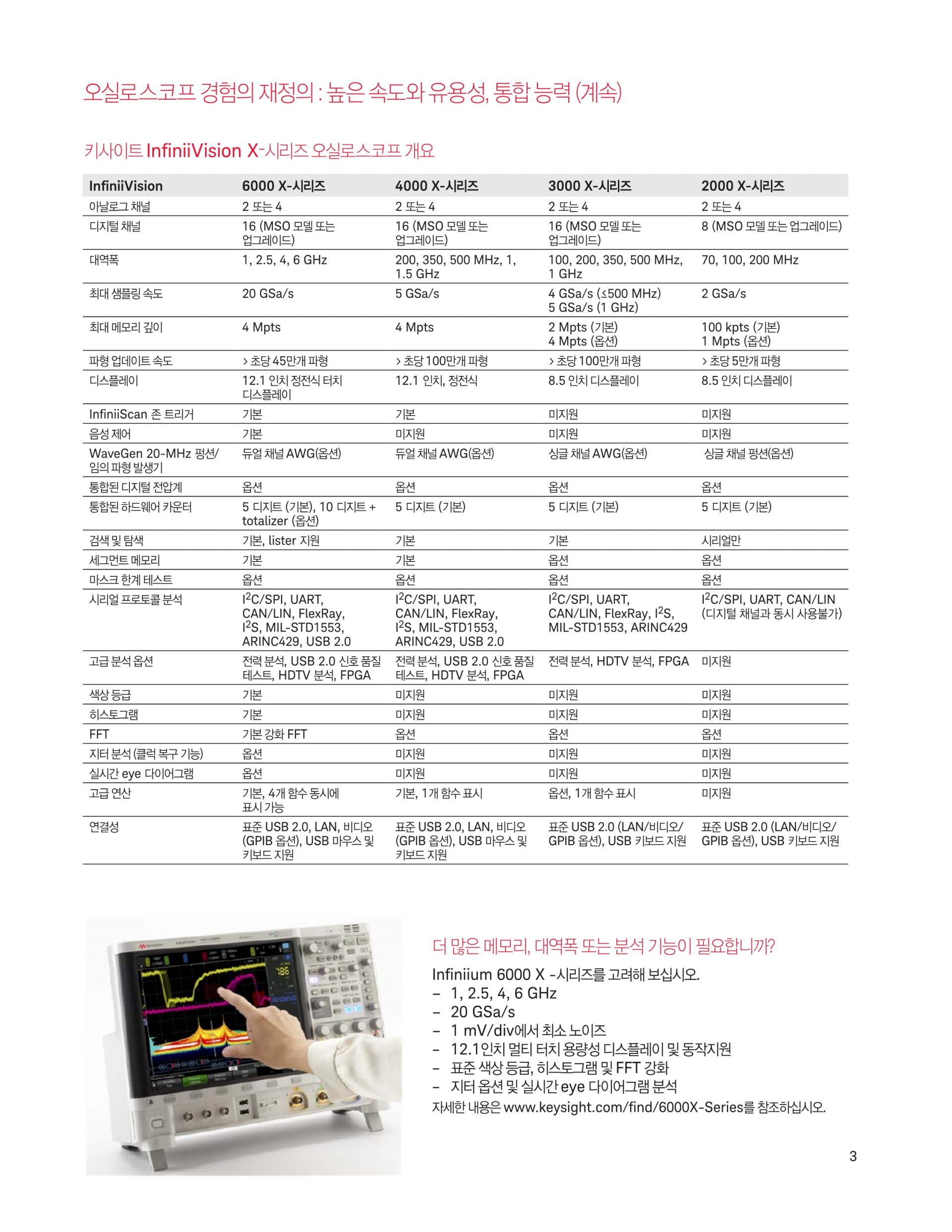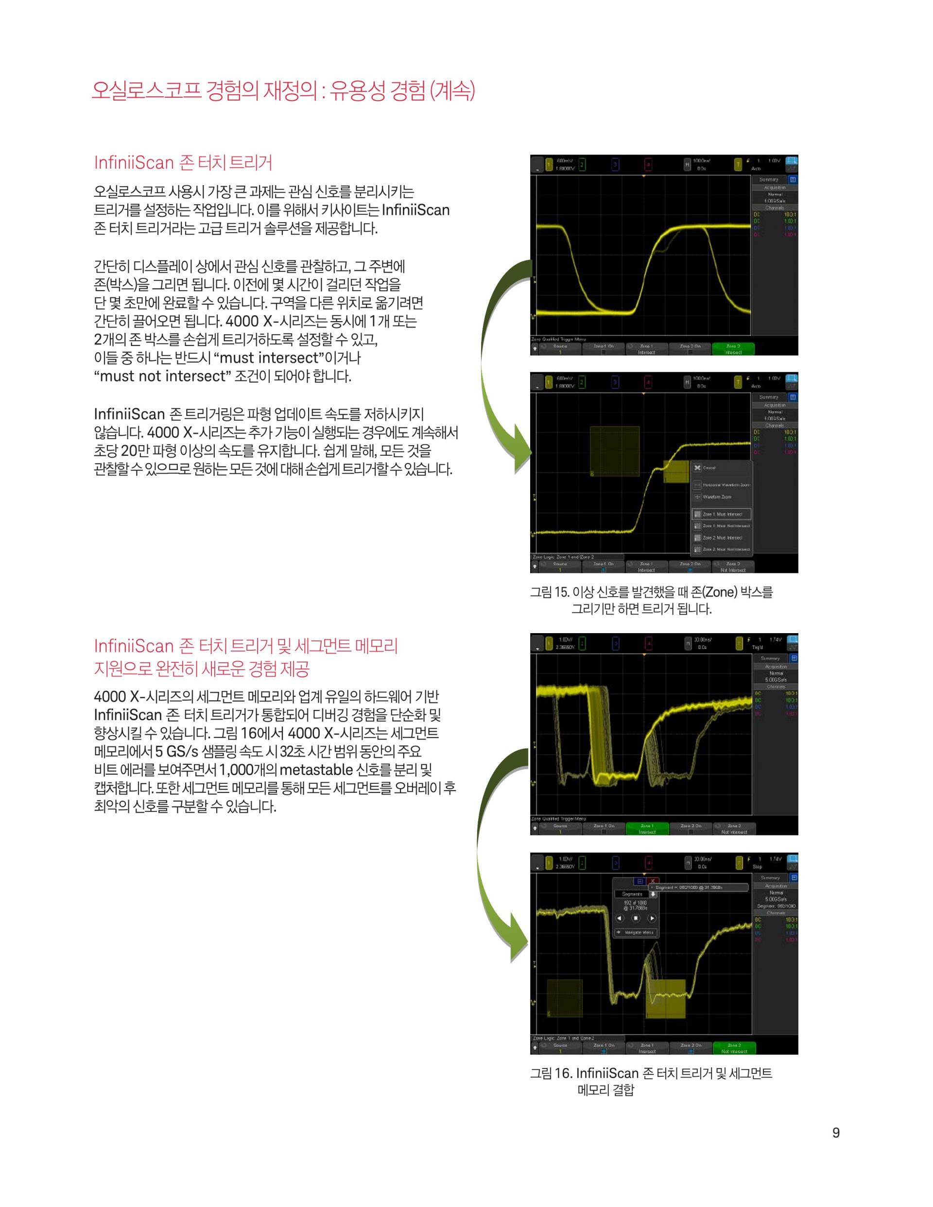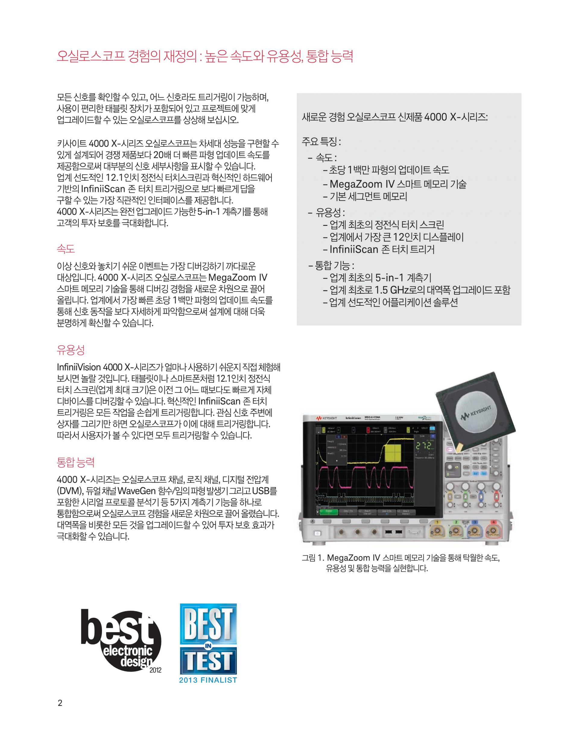 - 4000 X-시리즈는 12.1인치 디스플레이, 정전식 터치스크린 기술, InfiniiScan Zone 터치 트리거, 초당 1백만 개 속도의 파형 업데이트, MegaZoom IV 스마트 메모리 기술, 기본 옵션 세그먼트 메모리 기능을 제공합니다.