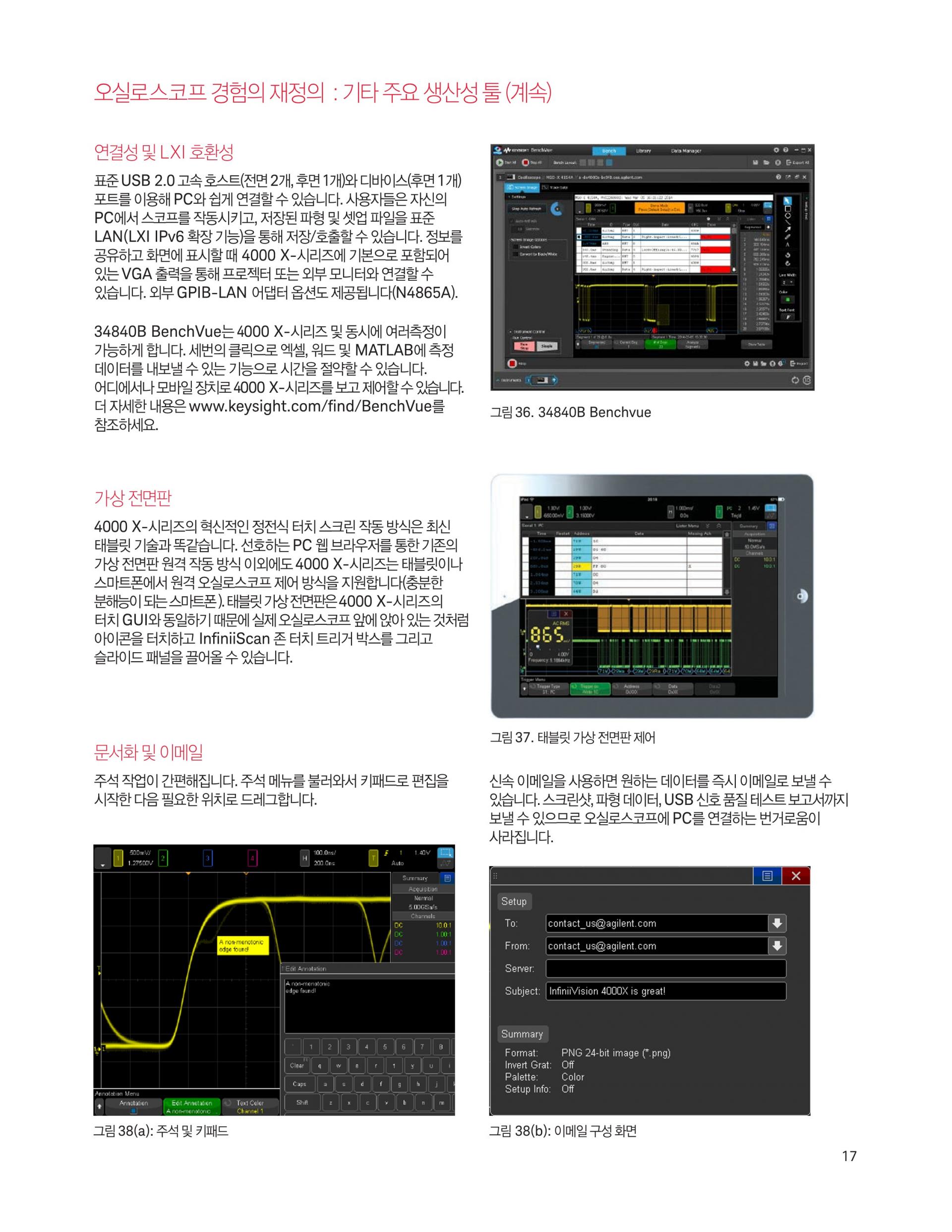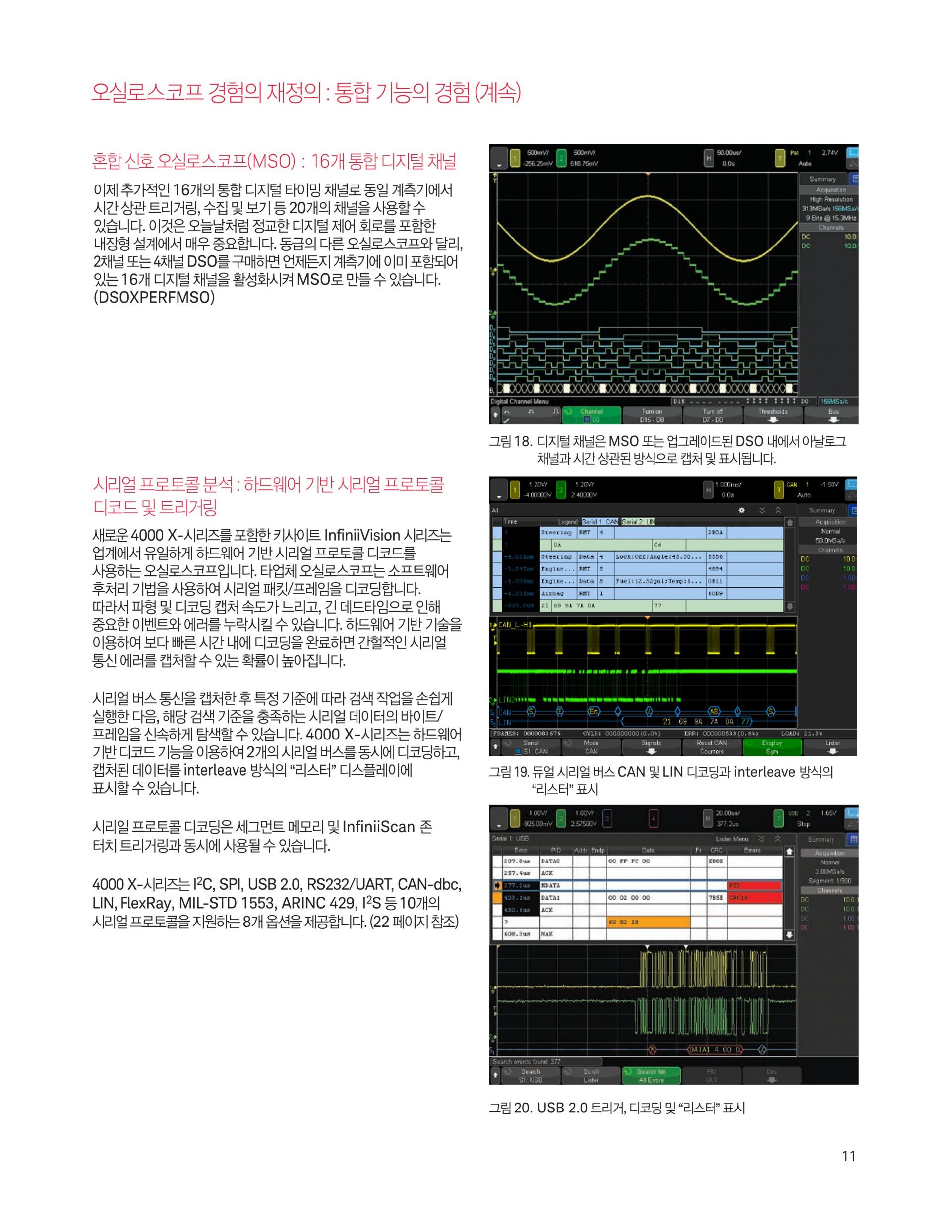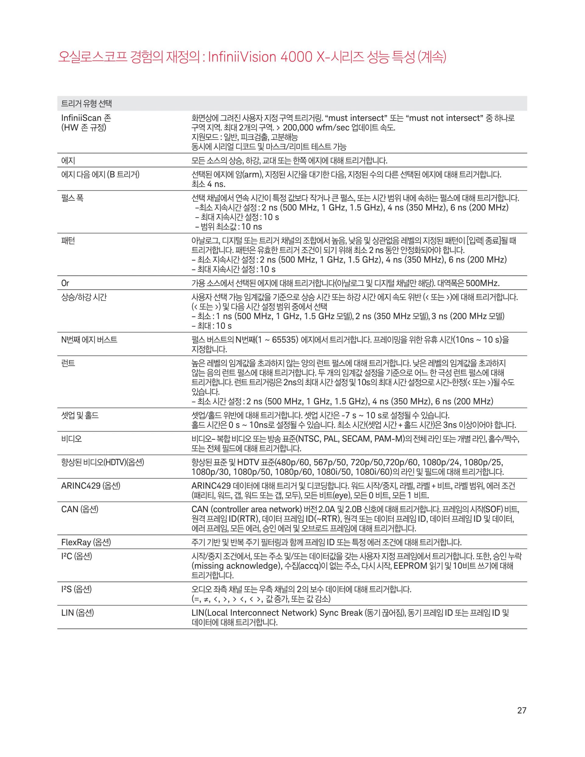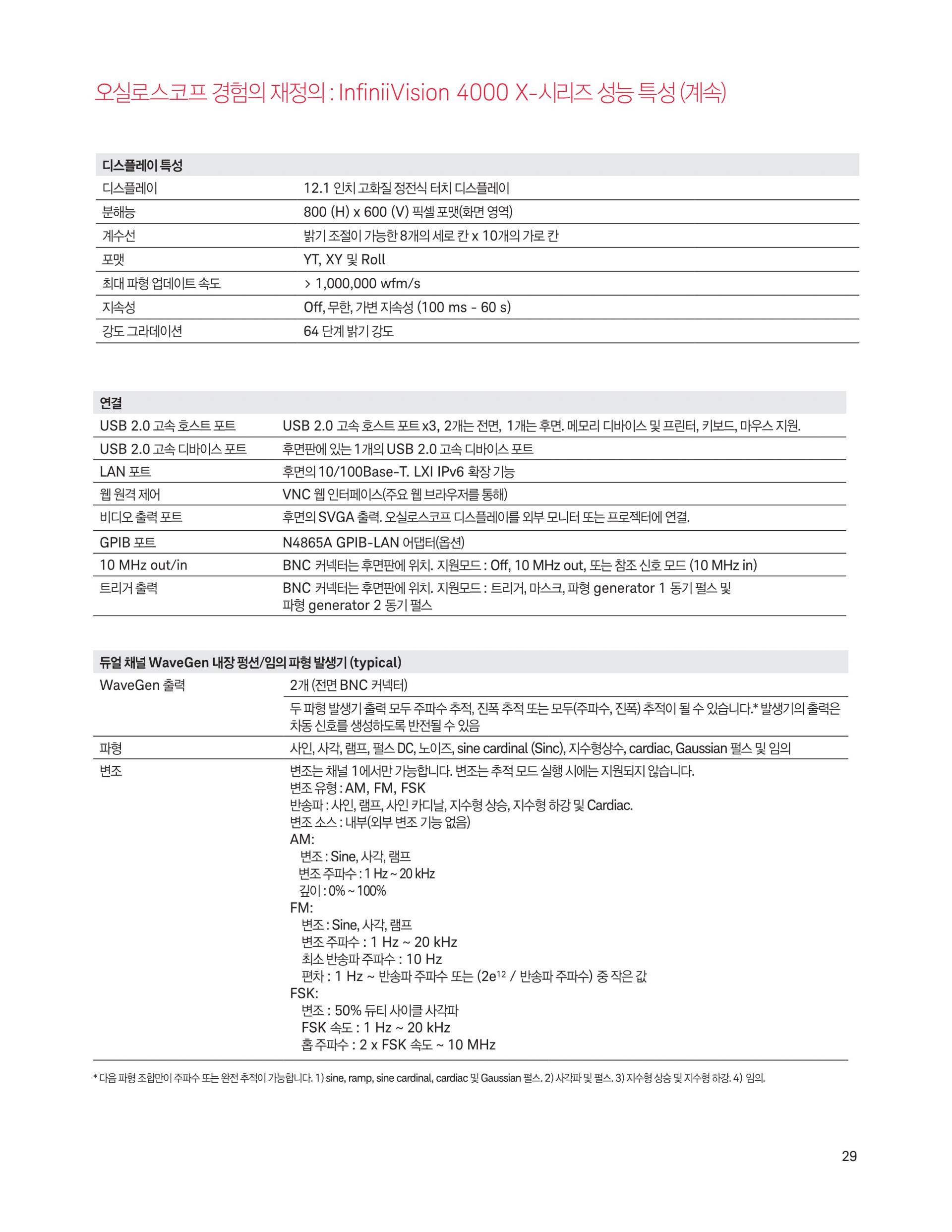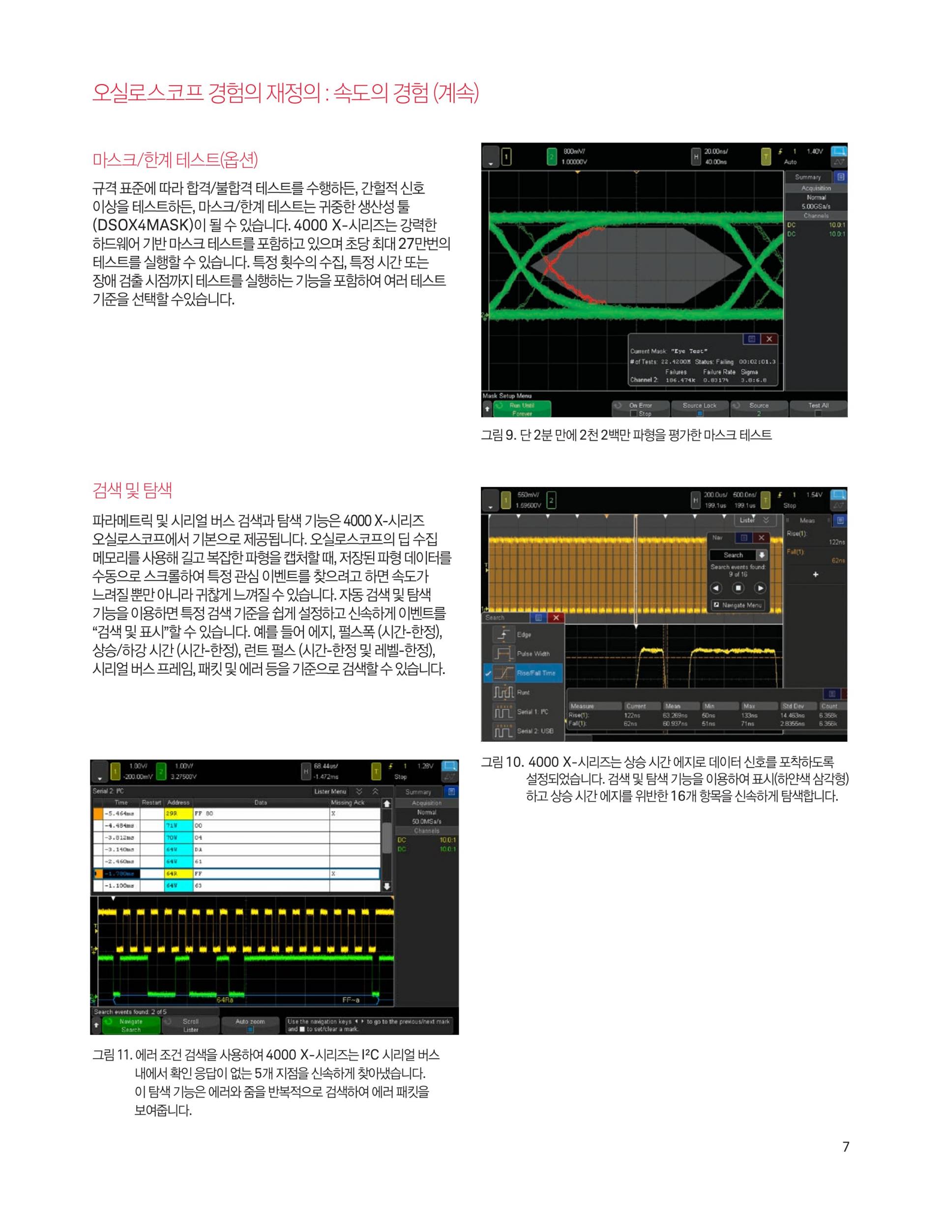 - 4000 X-시리즈는 12.1인치 디스플레이, 정전식 터치스크린 기술, InfiniiScan Zone 터치 트리거, 초당 1백만 개 속도의 파형 업데이트, MegaZoom IV 스마트 메모리 기술, 기본 옵션 세그먼트 메모리 기능을 제공합니다.