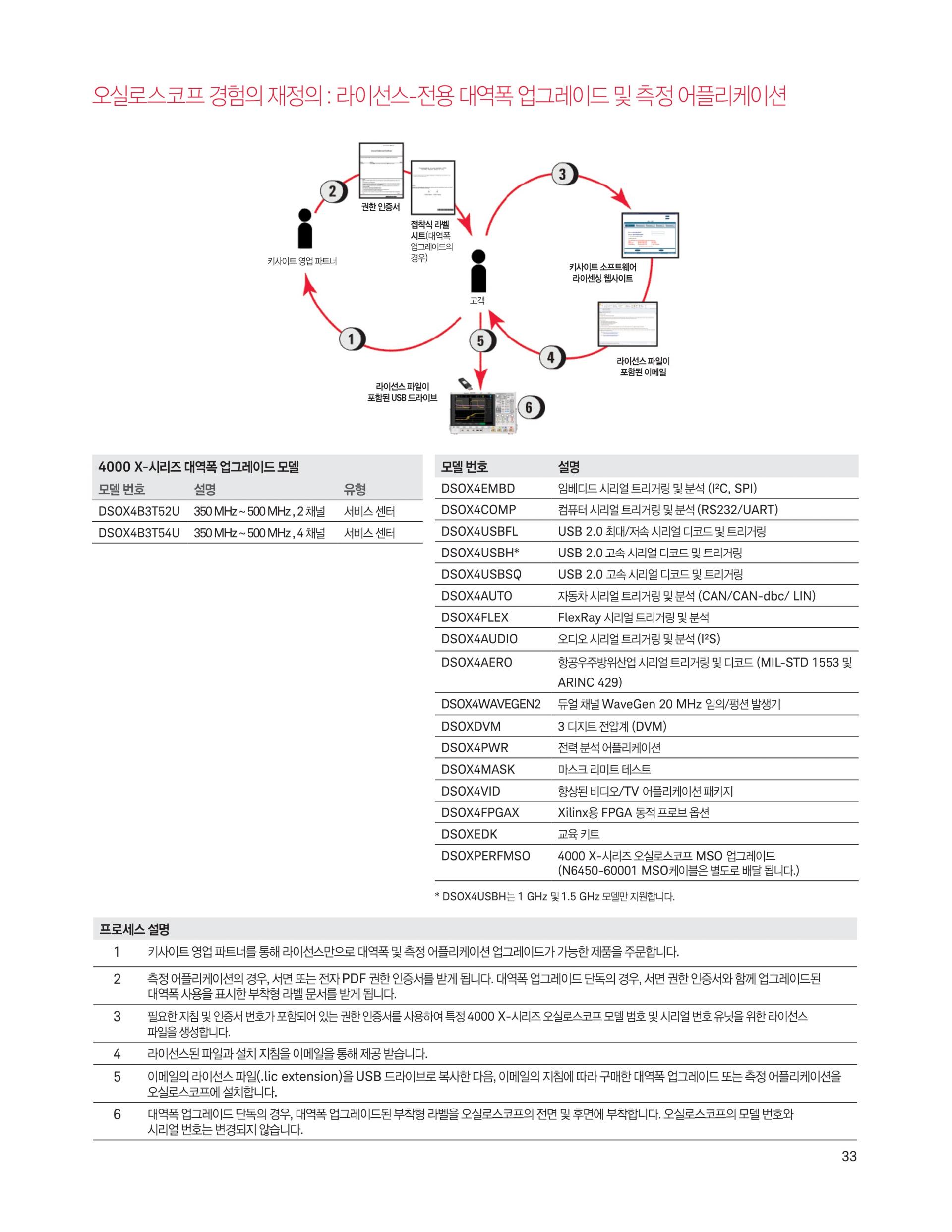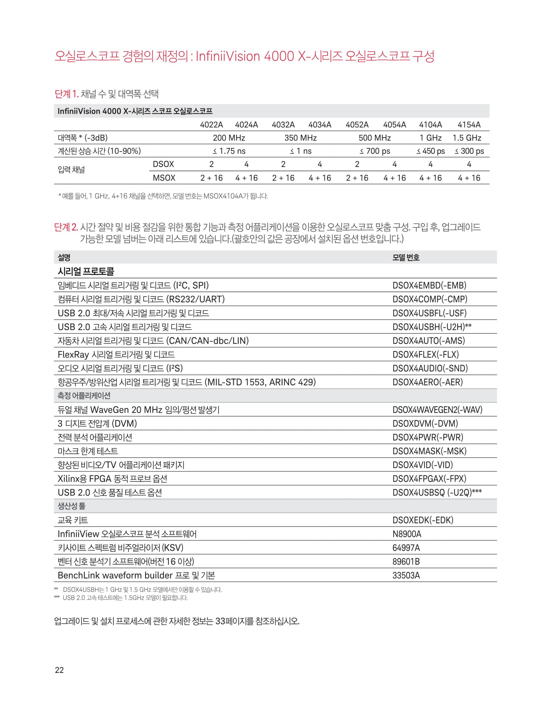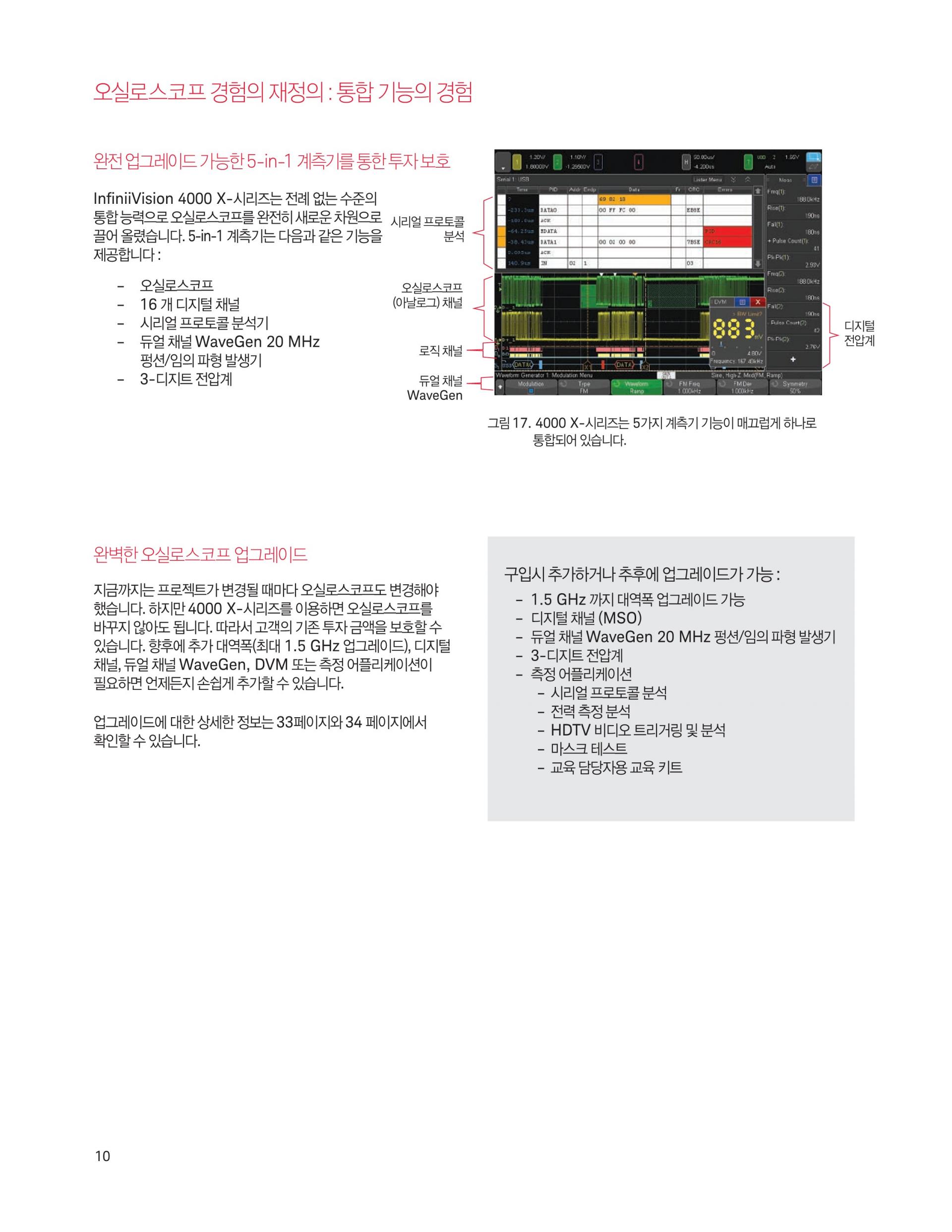 - 본체 구매 후, 모든 옵션 별도 업그레이드 가능. 간편하게 측정기능 확장: 대역폭, 디지털 채널, 듀얼 채널 20 MHz 임의 파형 발생기(WaveGen), 3디지트 디지털 전압계(DVM), 시리얼 트리거 및 분석 그리고 마스크 테스트 기능 추가