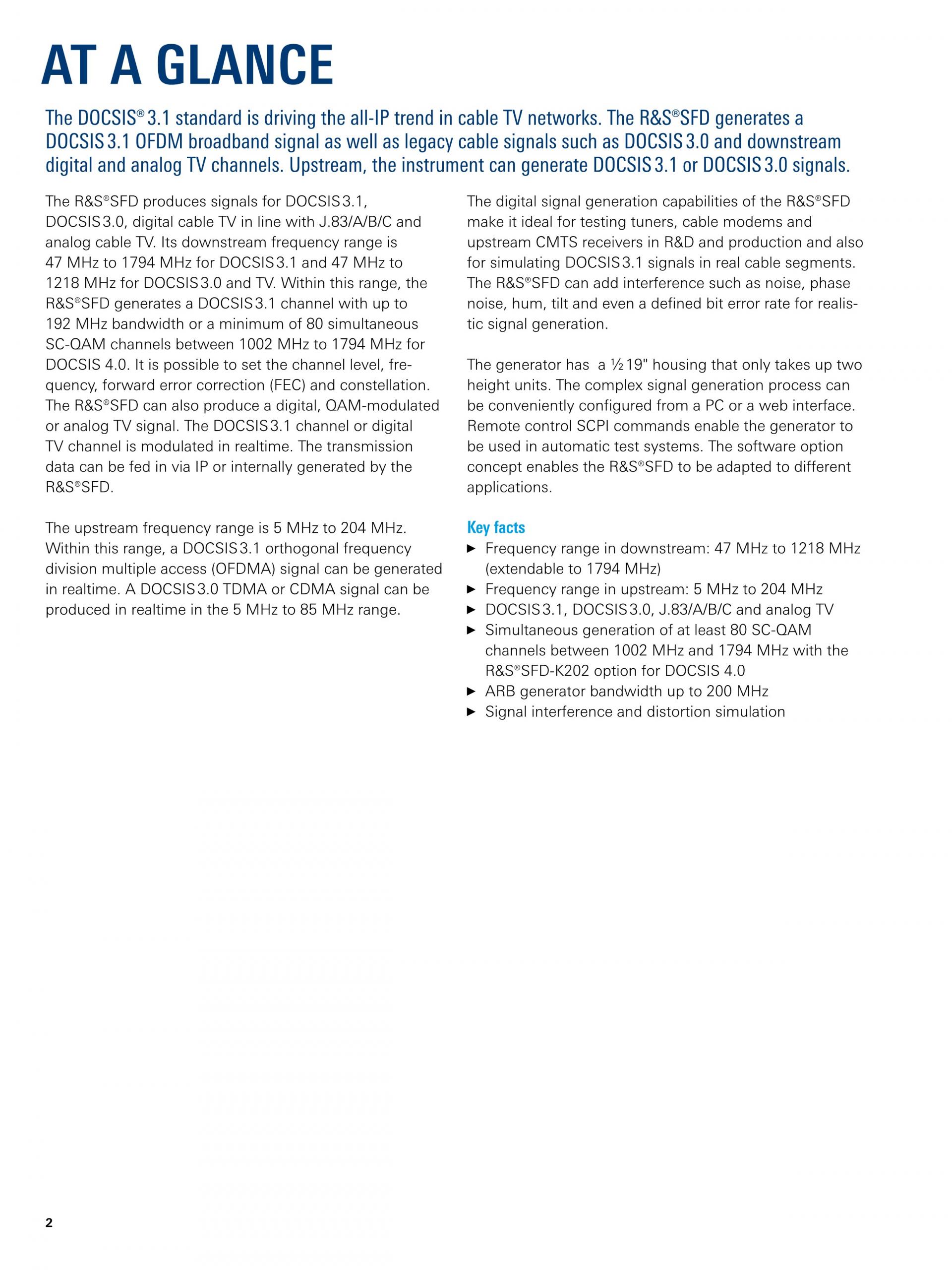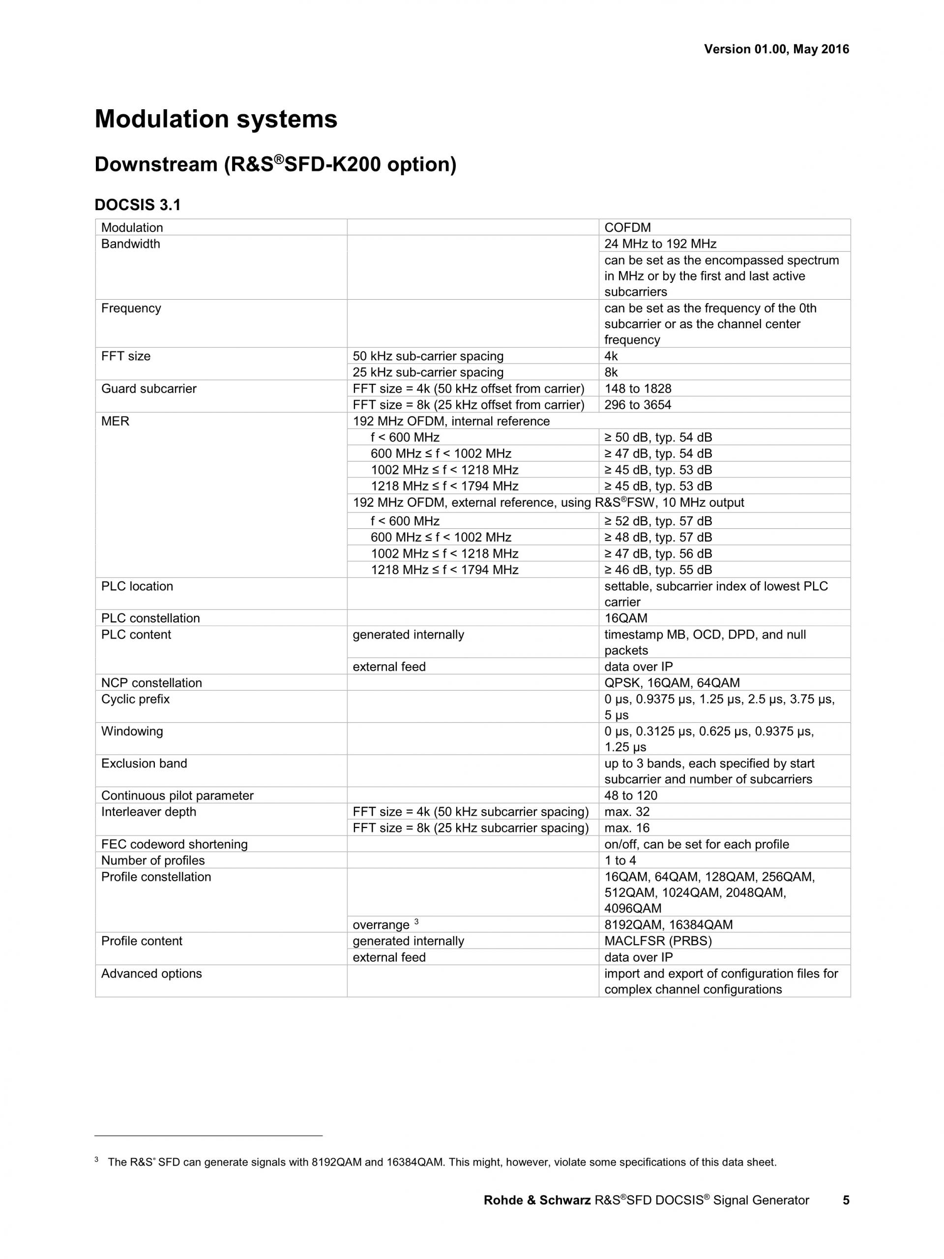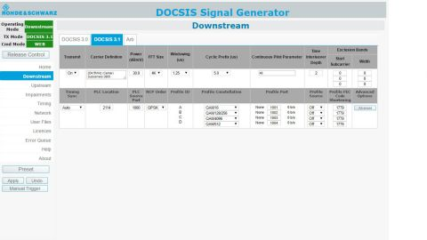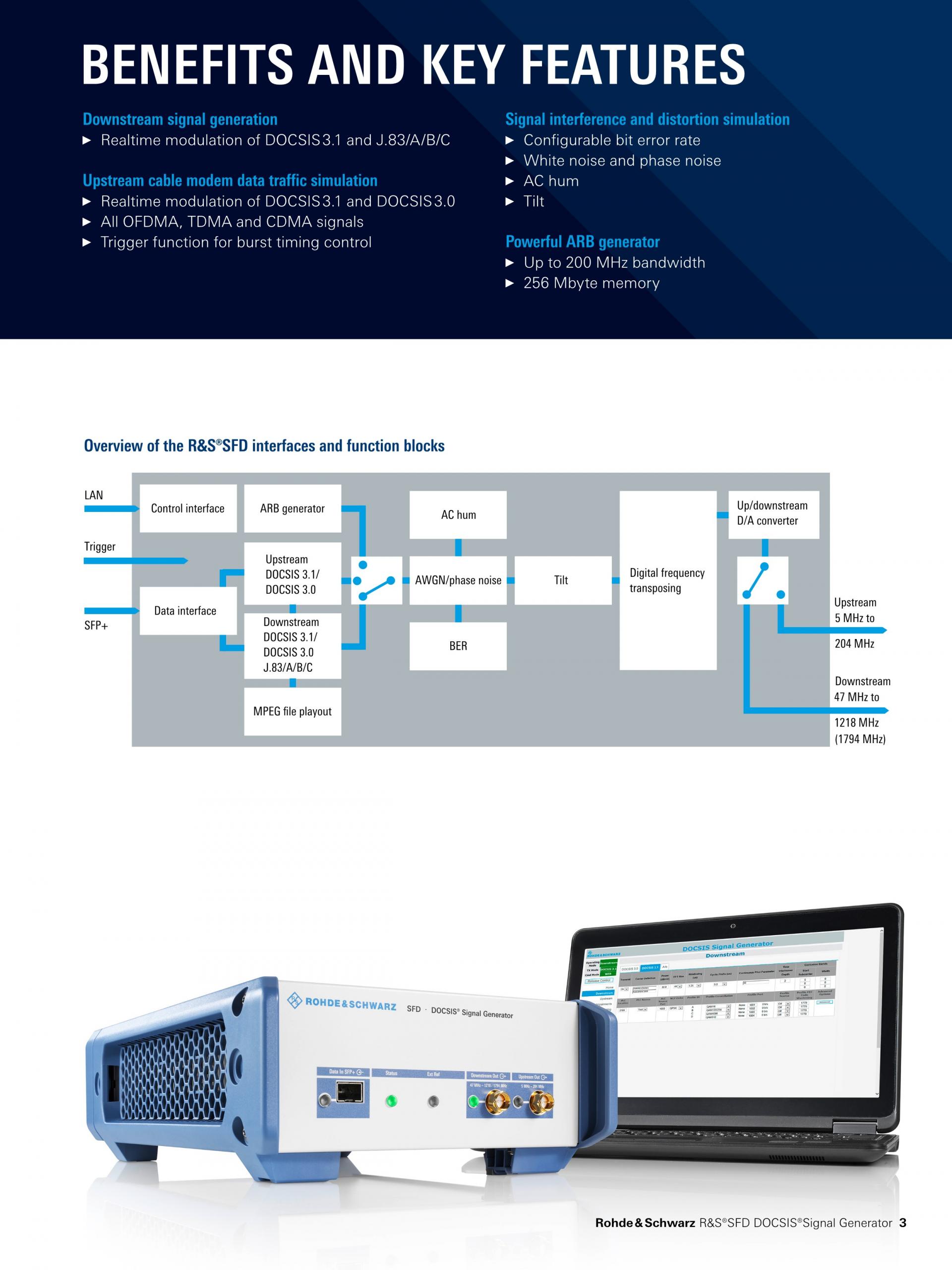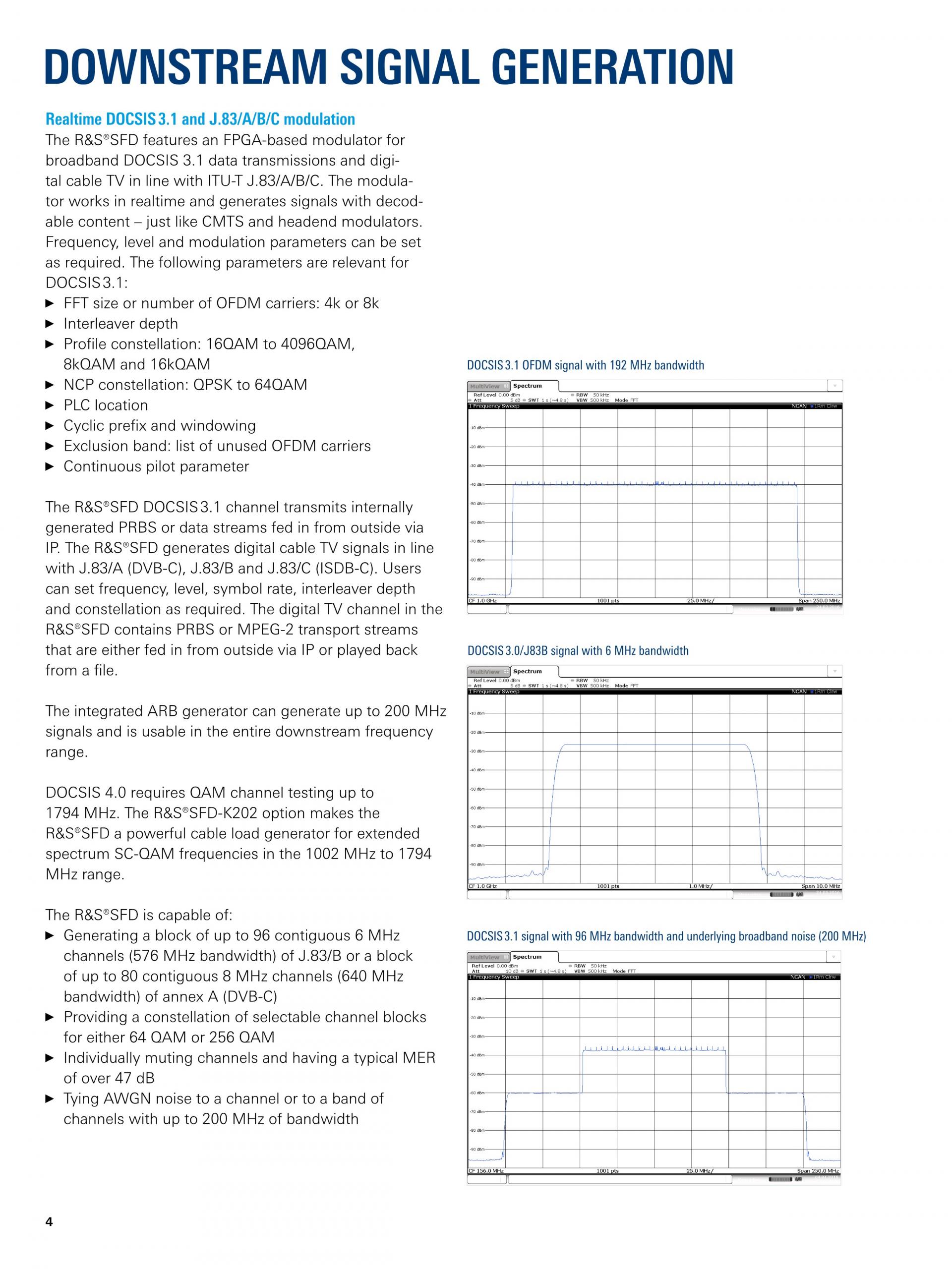 R&S®SFD는 DOCSIS 3.1 표준에 따른 레벨, 주파수, 컨스틸레이션 및 기타 파라미터의 유연한 설정으로 DOCSIS 3.1 채널을 실시간으로 생성합니다. R&S®SFD는 J83A/B/C 사양에 따라 디지털 실시간 변조 TV 신호를 생성할 수도 있습니다. 콘텐츠는 IP를 통해 전송하거나 R&S®SFD 내부에서 생성할 수 있습니다.