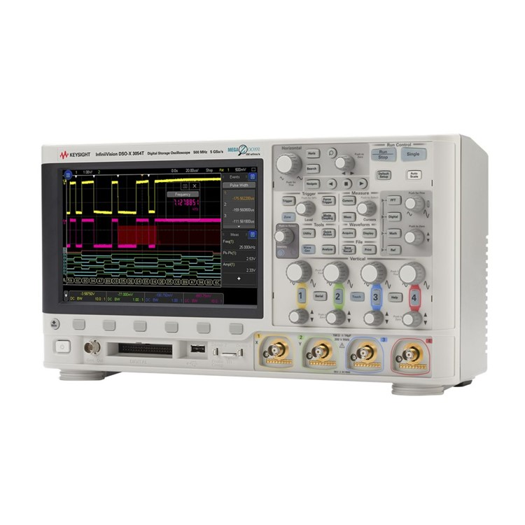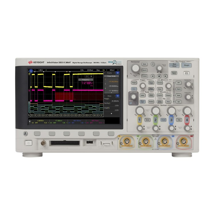 - DSOX3054T, 500 MHz 오실로스코프는 아날로그 4채널, 4 Mpts 메모리, 초당 1,000,000개의 파형 업데이트 속도, 8.5인치 정전식 터치 스크린이 있는 표준 터치 존 트리거를 제공합니다.