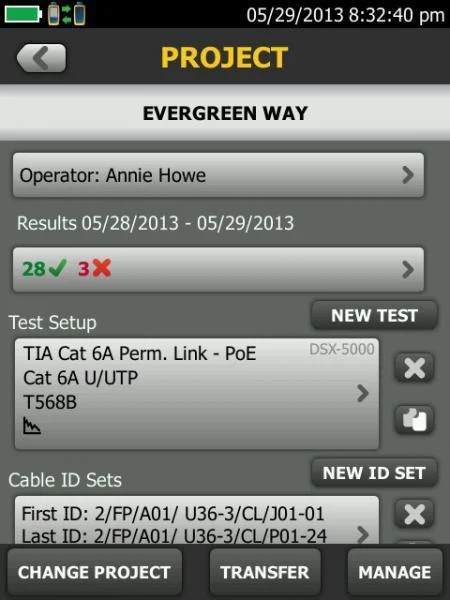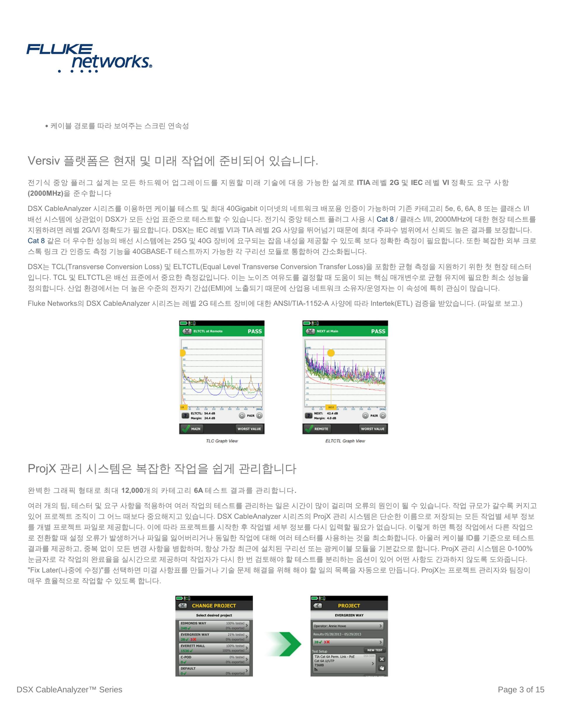 여러 개의 팀, 테스터 및 요구 사항을 적용하여 여러 작업의 테스트를 관리하는 일은 시간이 많이 걸리며 오류의 원인이 될 수 있습니다. 작업 규모가 갈수록 커지고 있어 프로젝트 조직이 그 어느 때보다 중요해지고 있습니다. DSX CableAnalyzer 시리즈 TP케이블 인증기의 새로운 ProjX 관리 시스템은 단순한 이름으로 저장되는 모든 작업별 세부 정보를 개별 프로젝트 파일로 제공하므로 프로젝트를 시작한 후 작업별 세부 정보를 다시 입력할 필요가 없습니다. 이렇게 하면 특정 작업에서 다른 작업으로 전환할 때 설정 오류가 발생하거나 파일을 잃어버리거나 동일한 작업에 대해 여러 테스터를 사용하는 것을 최소화합니다. 아울러 케이블 ID를 기준으로 테스트 결과를 제공하고, 중복 없이 모든 변경 사항을 병합하며, 항상 가장 최근에 설치된 구리선 또는 광케이블 모듈을 기본값으로 합니다. ProjX 관리 시스템은 0-100% 눈금자로 각 작업의 완료율을 실시간으로 제공하며 작업자가 다시 한 번 검토해야 할 테스트를 분리하는 옵션이 있어 어떤 사항도 간과하지 않도록 도와줍니다. "Fix Later(나중에 수정)"를 선택하면 미결 사항표를 만들거나 기술 문제 해결을 위해 해야 할 일의 목록을 자동으로 만듭니다. ProjX는 프로젝트 관리자와 팀장이 매우 효율적으로 작업할 수 있도록 합니다.