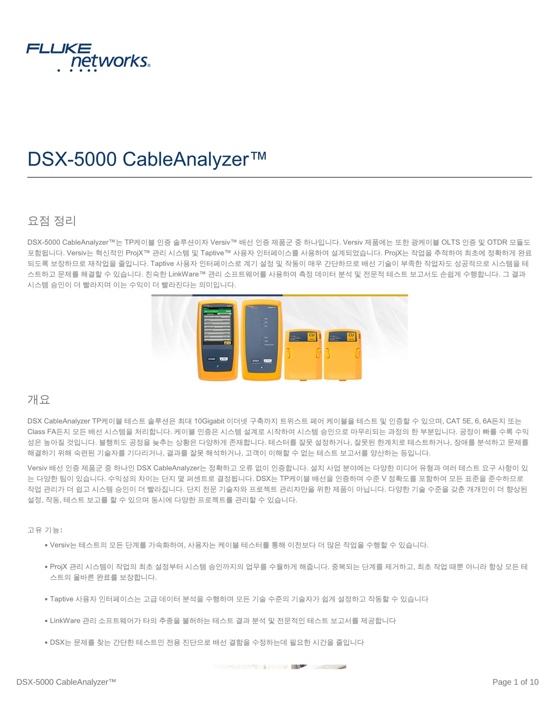 Versiv 배선 인증 제품군 중 하나인 DSX CableAnalyzer 시리즈 구리 케이블 인증기는 정확하고 오류 없는 인증을 제공합니다. 설치 사업 분야에는 다양한 미디어 유형과 여러 테스트 요구 사항이 있는 다양한 팀이 있습니다. 수익성의 차이는 단지 몇 퍼센트로 결정됩니다. DSX는 구리선 배선을 인증하며, 레벨 VI/2G 정확도를 포함하여 모든 표준을 준수하기 때문에 작업 관리가 더 쉽고 시스템 승인도 더 빨라집니다. 단지 전문 기술자와 프로젝트 관리자만을 위한 제품이 아닙니다. 다양한 기술 수준을 갖춘 개개인이 더 향상된 설정, 작동, 테스트 보고를 할 수 있으며 동시에 다양한 프로젝트를 관리할 수 있습니다.